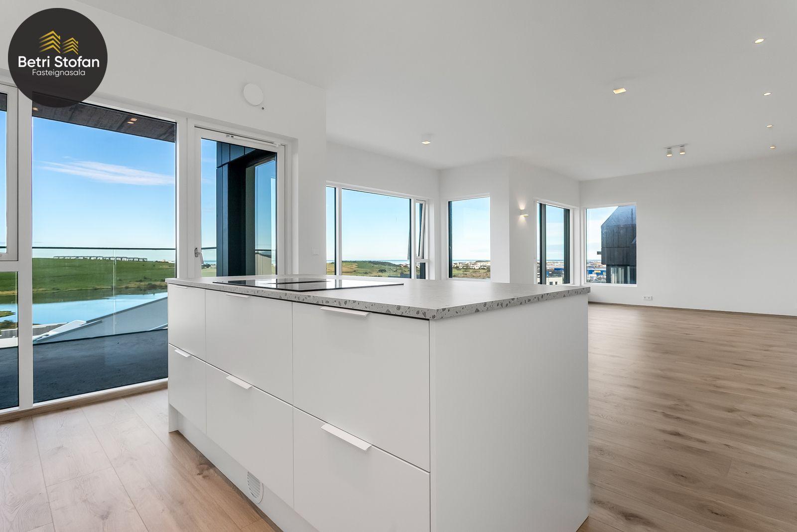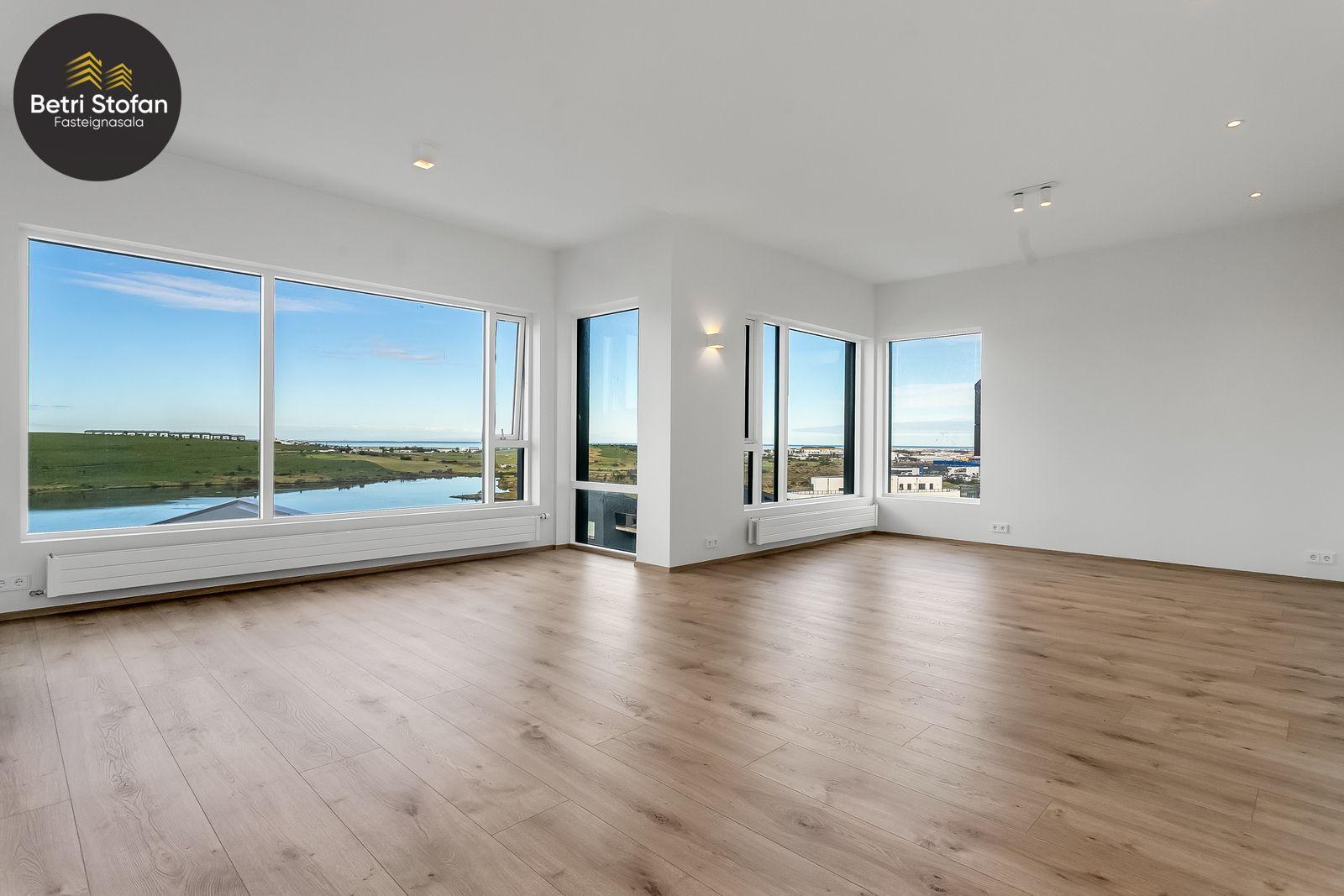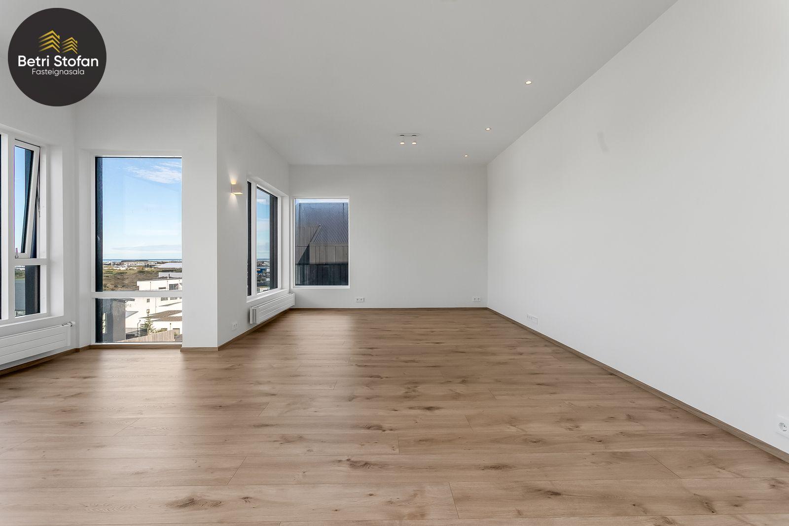 Stofa/alrými er með harðparketi á gólfi, útgengt út á þaksvalir sem snúa til suð-vesturs með útsýni.