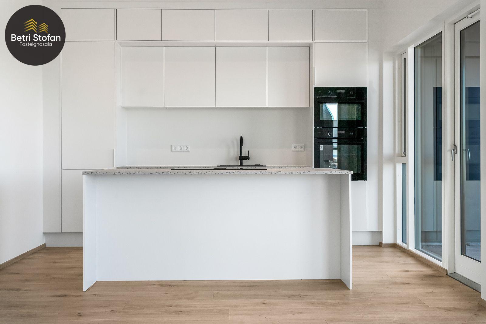 Eldhúsinnrétting er hvít frá JKE nær upp í loft með eyju. Öll raftæki eru frá AEG, bakaraofn, combi ofn, ísskápur með frysti, helluborð og uppþvottavél. Skúffur eru með mjúklokun.