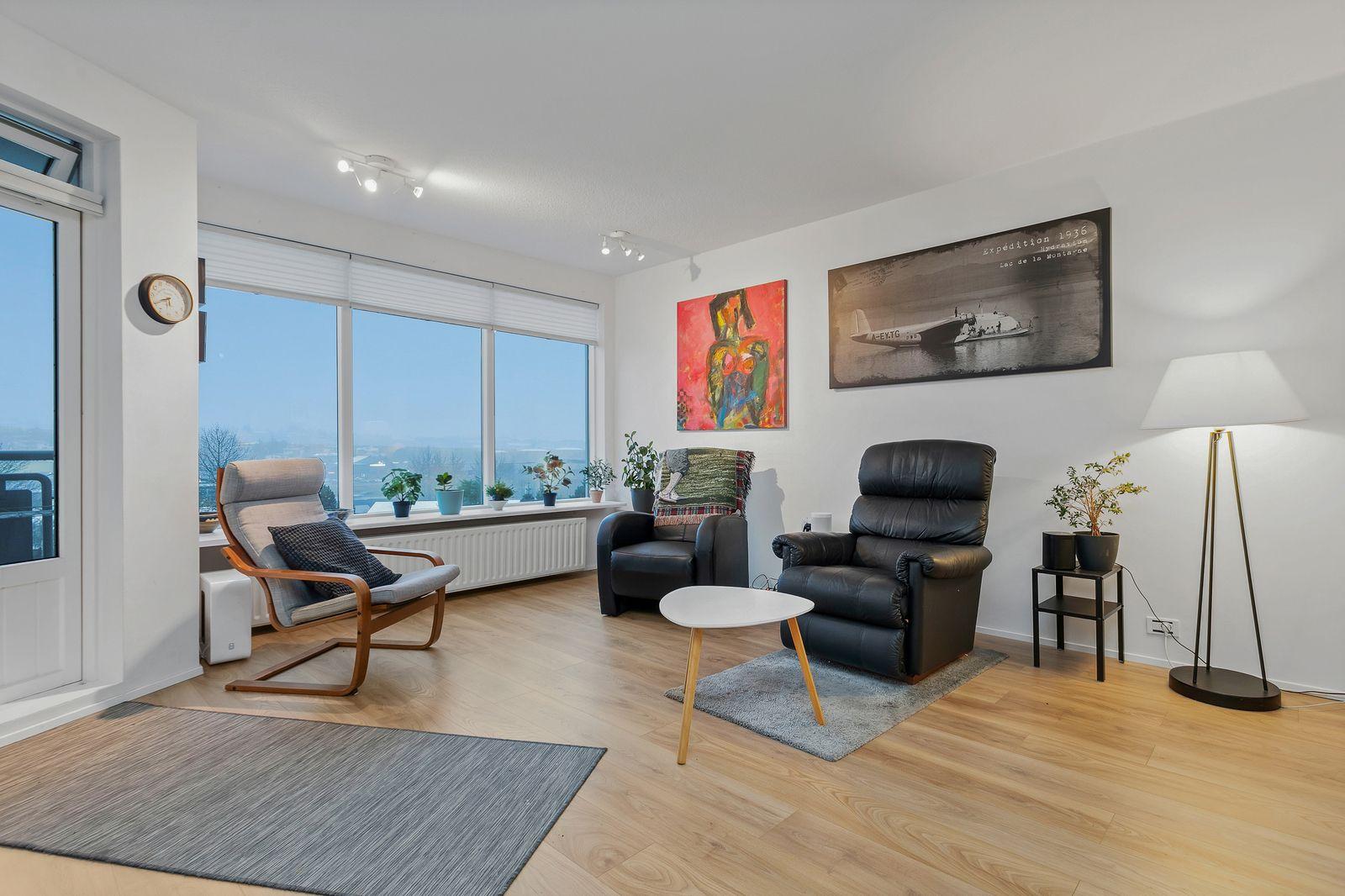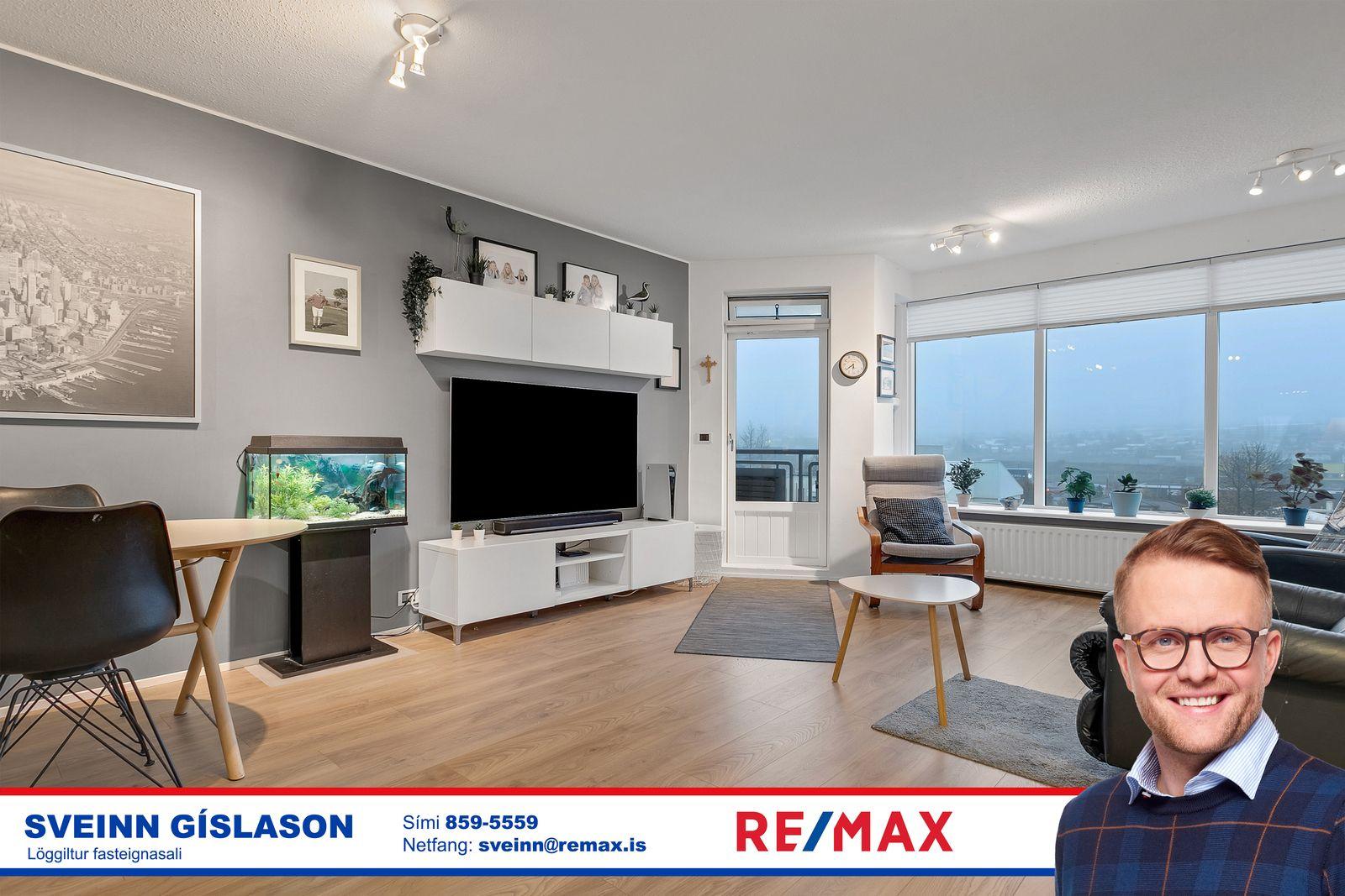 Stofan er rúmgóð með útsýni og svölum til suðurs. Stofan er með harðparketi á gólfi.