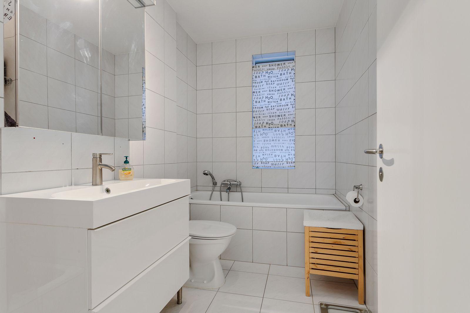 Baðherbergið er með hvítum flísum á gólfi og veggjum. Nýleg hvít innrétting með speglaskáp fyrir ofan. Baðkar og sturta.