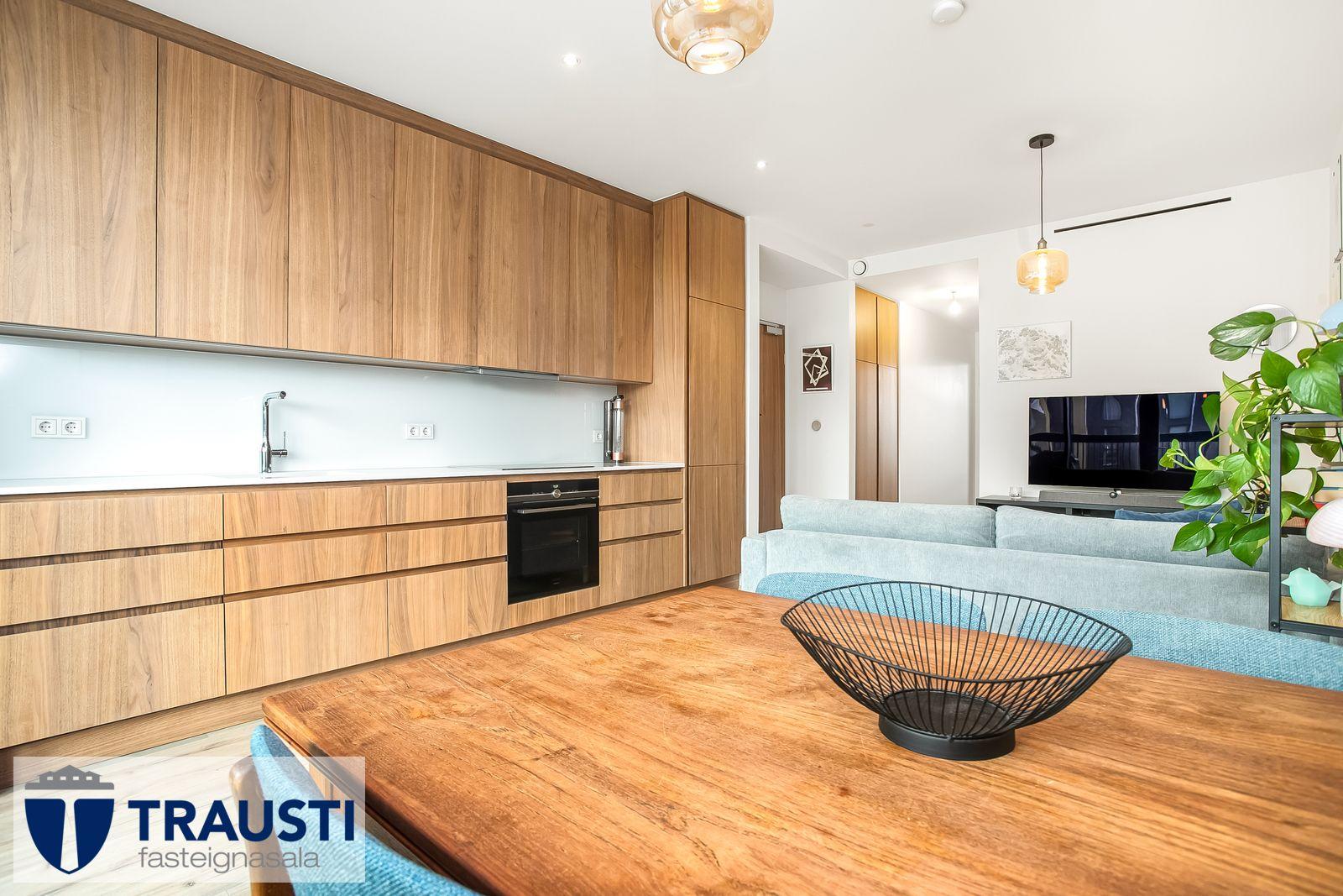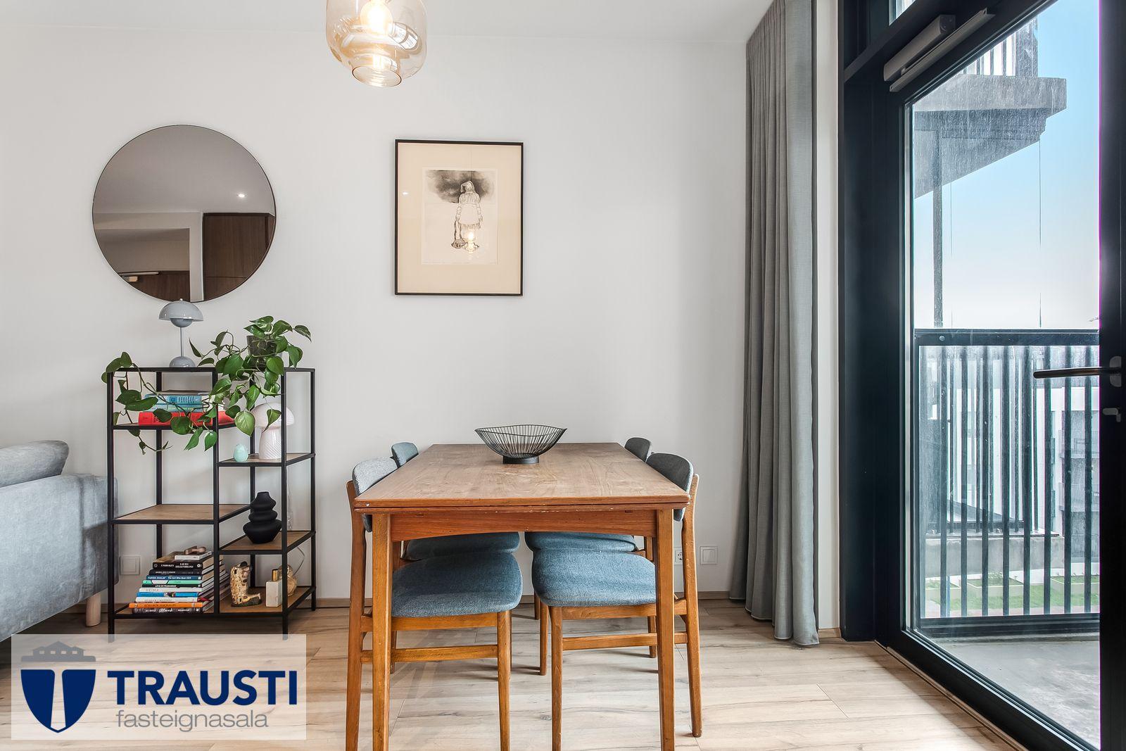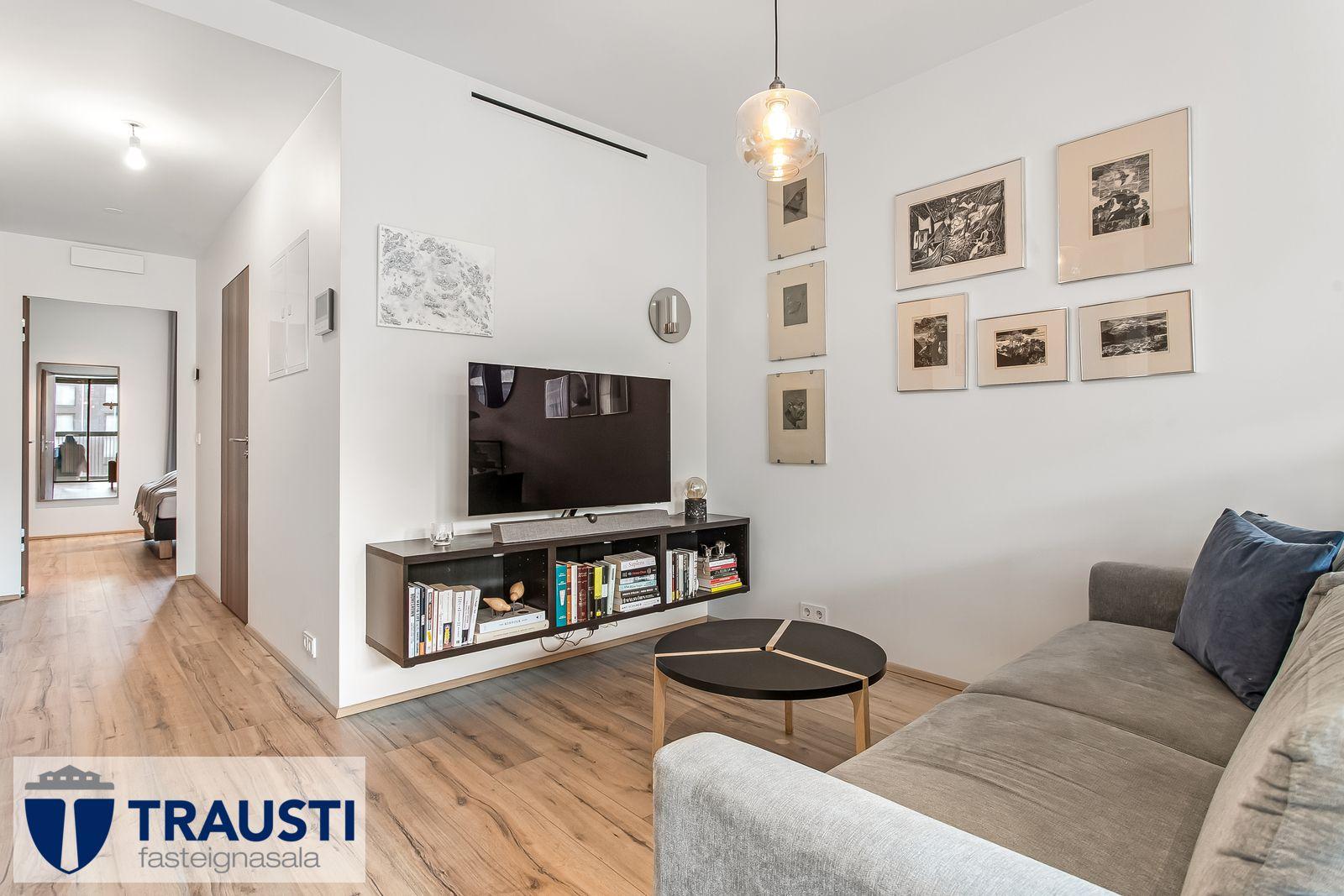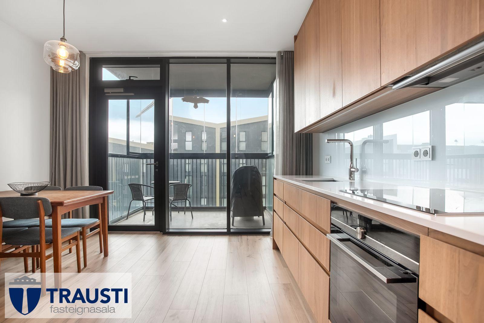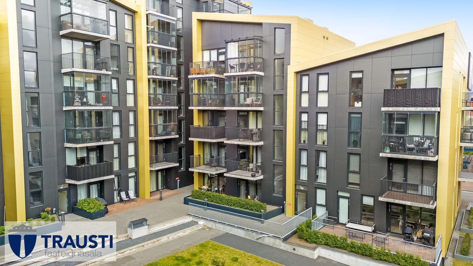 Nánari lýsing: Anddyri með góðum fataskáp og parket á gólfi. Stofa er rúmgóð með parket á gólfi. Útgengt á yfirbyggðar vestur svalir. Eldhús er opið inn í stofu og þar er spanhelluborð, ofn, vifta, innbyggður ísskápur og uppþvottavél. Svefnherbergi með góðum fataskáp og parket á gólfi. Útsýni til sjávar. Baðherbergi með upphengdu salerni, sturtu, handklæðaofni, innréttingu með góðu plássi fyrir þvottavél og þurrkara. Flísalagt í hólf og gólf. Gólfhitakerfi er í íbúðinni og njóta gólfsíðir gluggar sín mjög vel bæði í stofu og svefnherbergi íbúðar.
