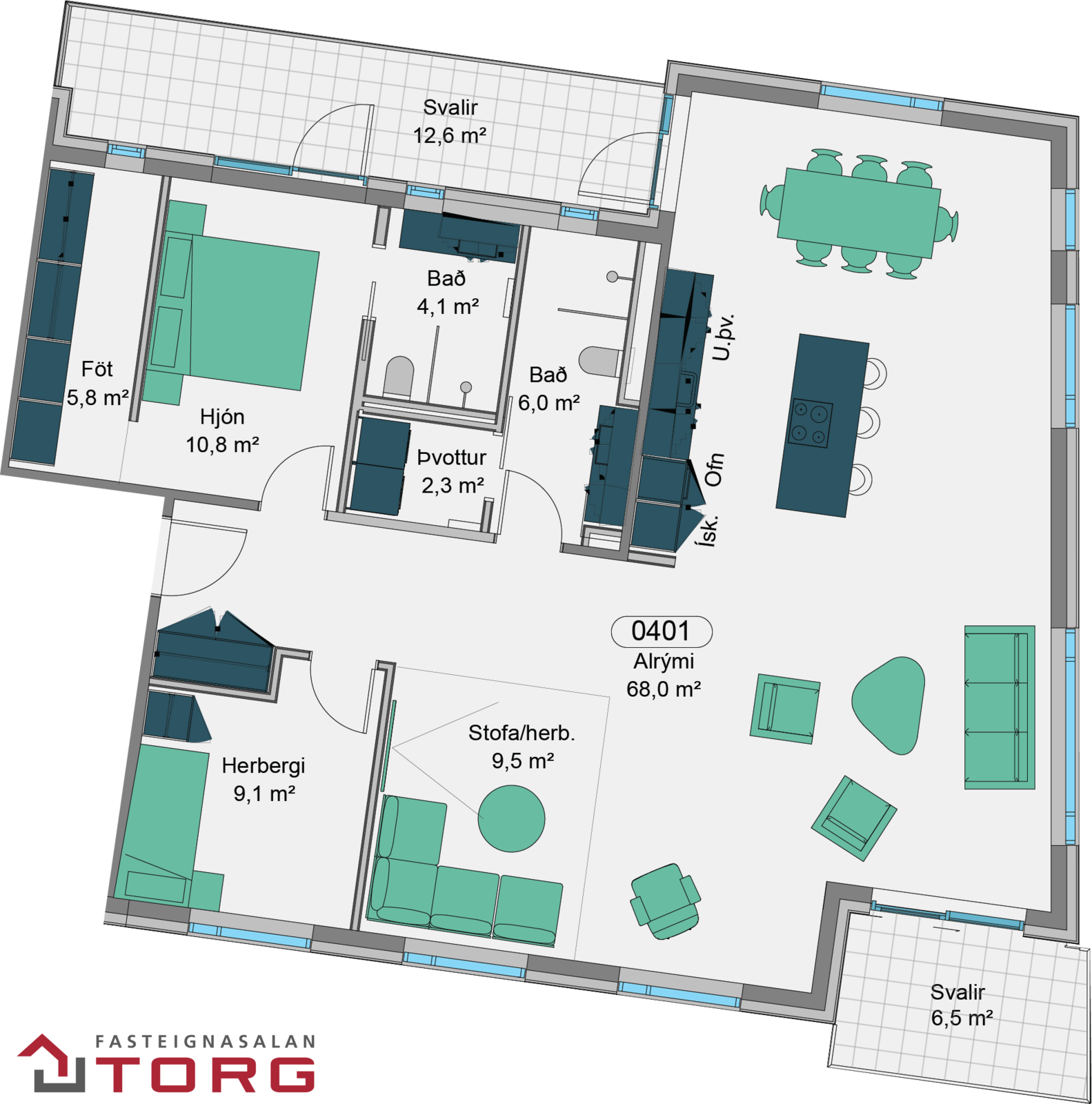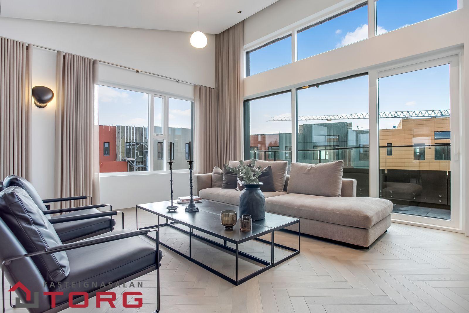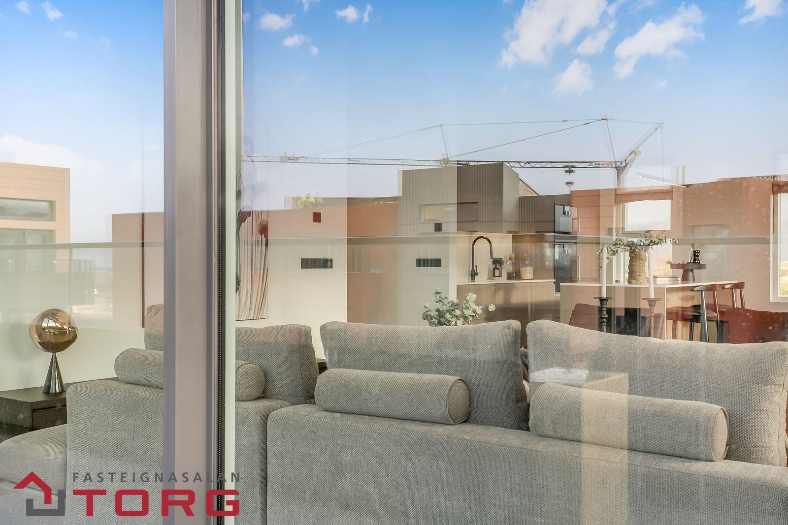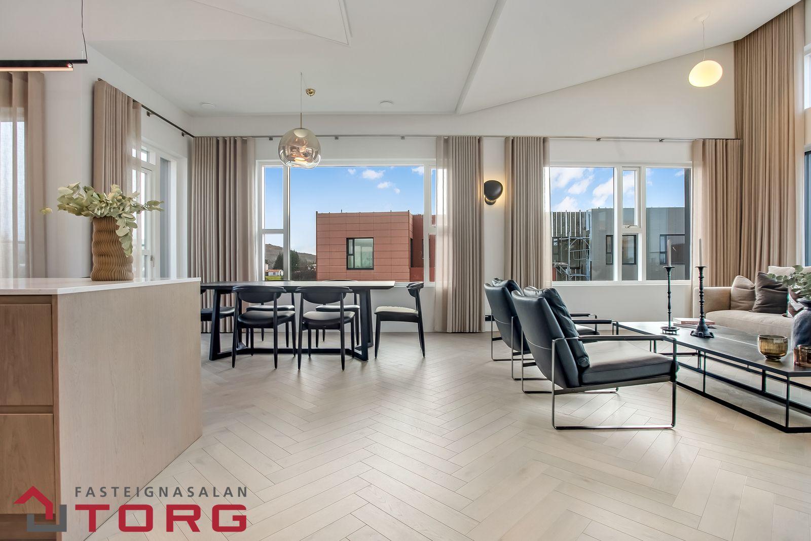 Sjá nánar skilalýsingu*Sjá nánari upplýsingar á heimasíðu verkefnisins HÉRSækja söluyfirlit HÉRNánari upplýsingar um íbúðina 407: Glæsileg 3ja - 4ra herbergja íbúð á efstu hæð með tvennar svalir, bílskúr og tvö bílastæði. Íbúð merkt:0407, sem skilast fullbúin án gólfefna. Íbúðin er alls 173,3fm að stærð á 4. og efstu hæð í góðu lyftuhúsi. Íbúðin sjálf er skráð 135,4fm og skiptist í anddyri, alrými með eldhúsi og stofu með útgengi út á svalir, 2-3 svefnherbergi, þar af er hjónasvíta með baðherbergi og fataherbergi. Baðherbergi með þvottaherbergi innaf, og bílskúr, merktur 0001, skráður 29,1fm, og geymslu í sameign merkt: 0003 skráð 8,8fm. ásamt tveimur bílstæðum í bílakjallara merkt: B32 og B22. Allar nánari upplýsingar, teikningar, og skilalýsingu er hægt að nálgast með að hafa samband við Elka Guðmundsdóttir, fasteignasali í GSM: 863-8813 eða elka@fstorg.is UtanhússfrágangurKlæðning: Flísar og álklæðning (báru og slétt), náttúrulegir jarðlitir.