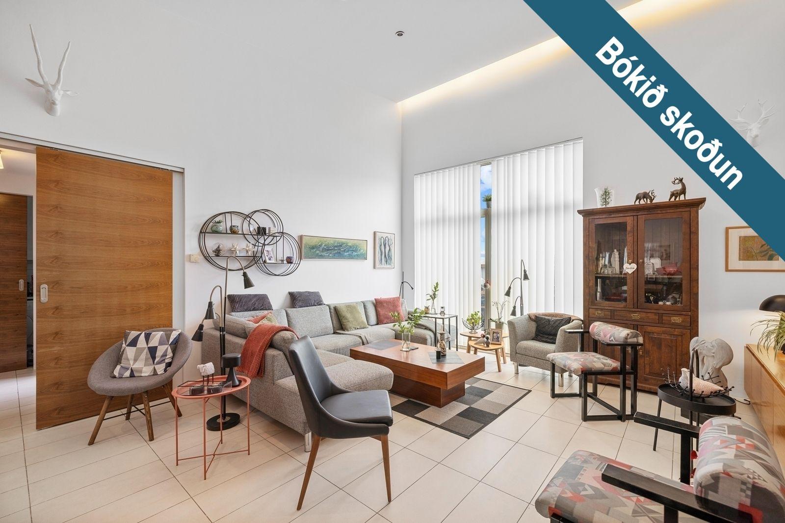 Stofa/borðstofa: Opin og björt stofa/borðstofa með hækkaðari lofhæð og fallegum þakglugga. Veggfestar hirslur/skápar. Stór rennihurð úr stofu út á pall að framan.