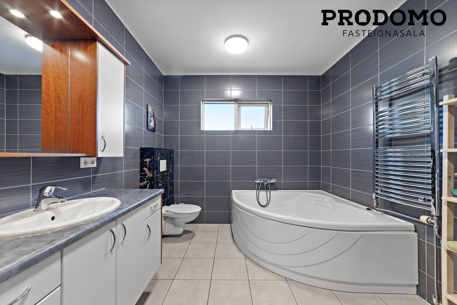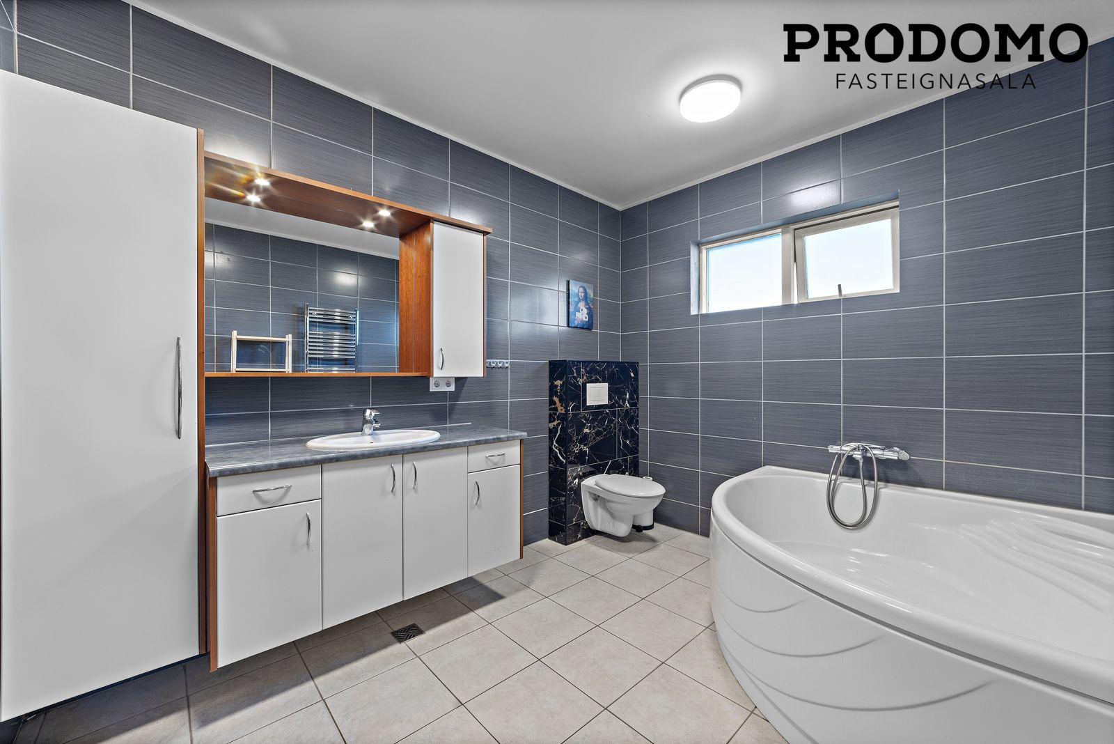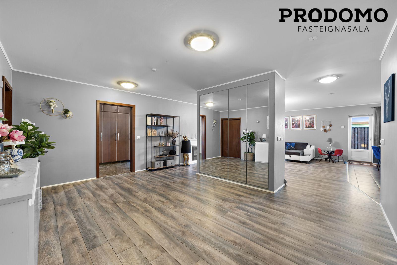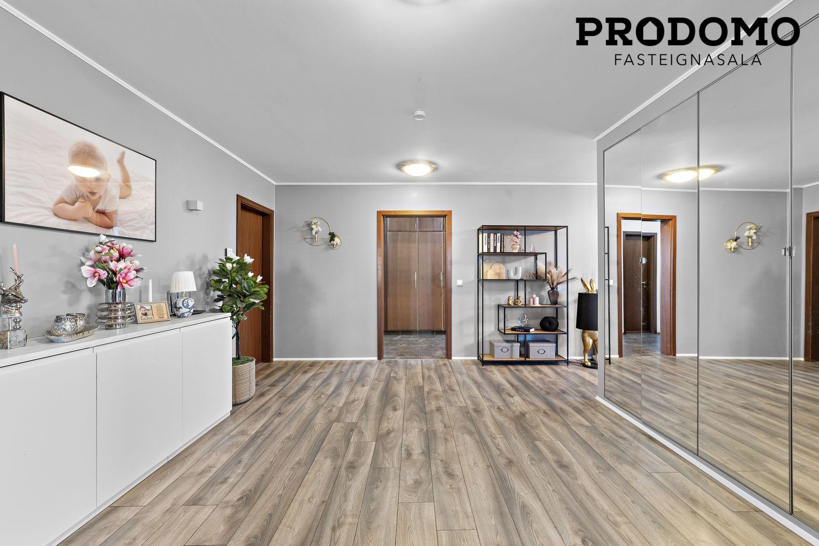 Eignin skiptist í forstofu, þvottahús, rúmgóðan bílskúr með herbergi, hol, þrjú svefnherbergi, rúmgott baðherbergi ásamt eldhúsi og stofu. Sólpallur með heitum pott ásamt geymslu skúr. Steypt bílaplan með snjóbræðslu og lóð tyrfð.
