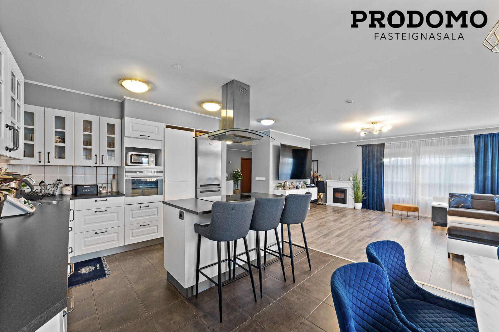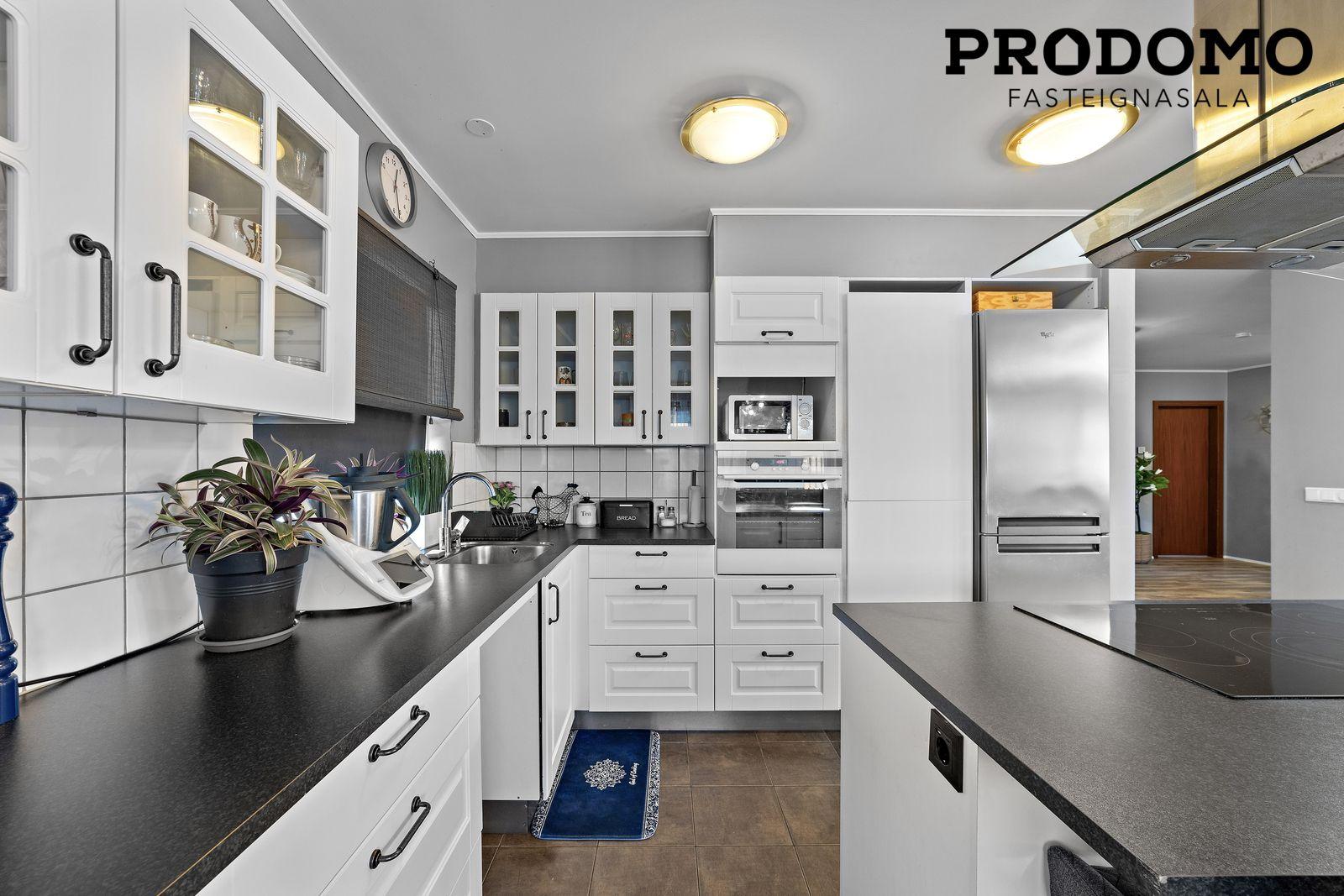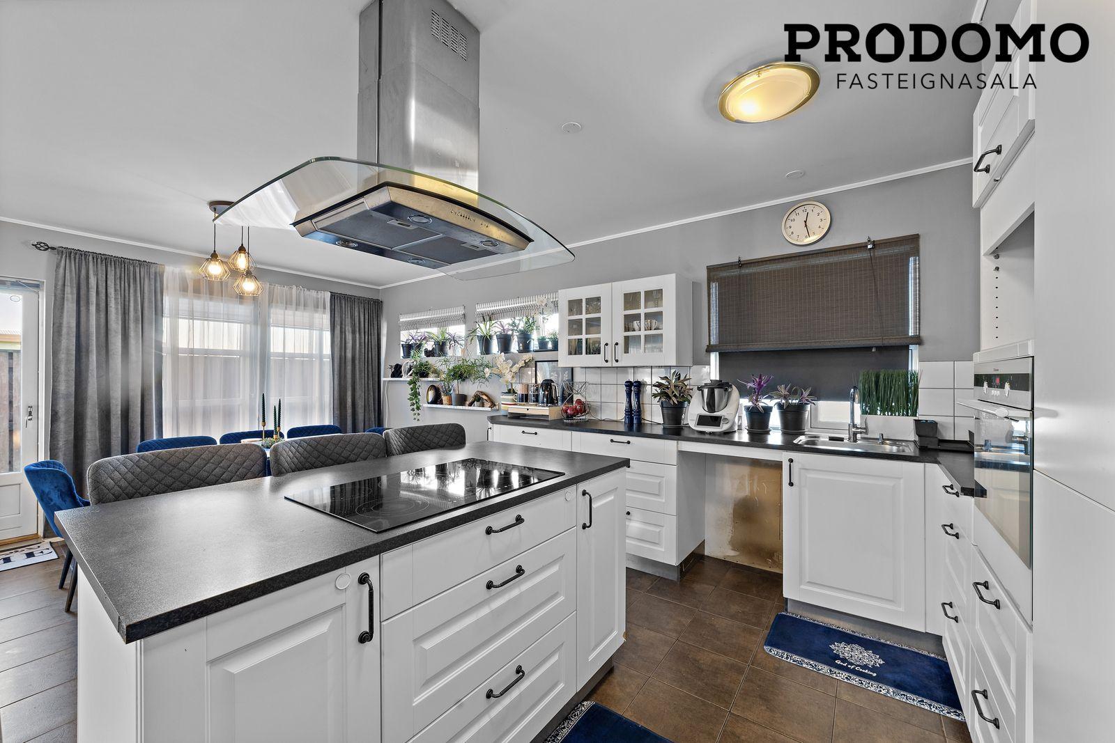 Eldhús er opið við stofu, hvít innrétting og eyja. Ofn í vinnuhæð, helluborð og vifta og gert ráð fyrir uppþvottavél í innréttingu.