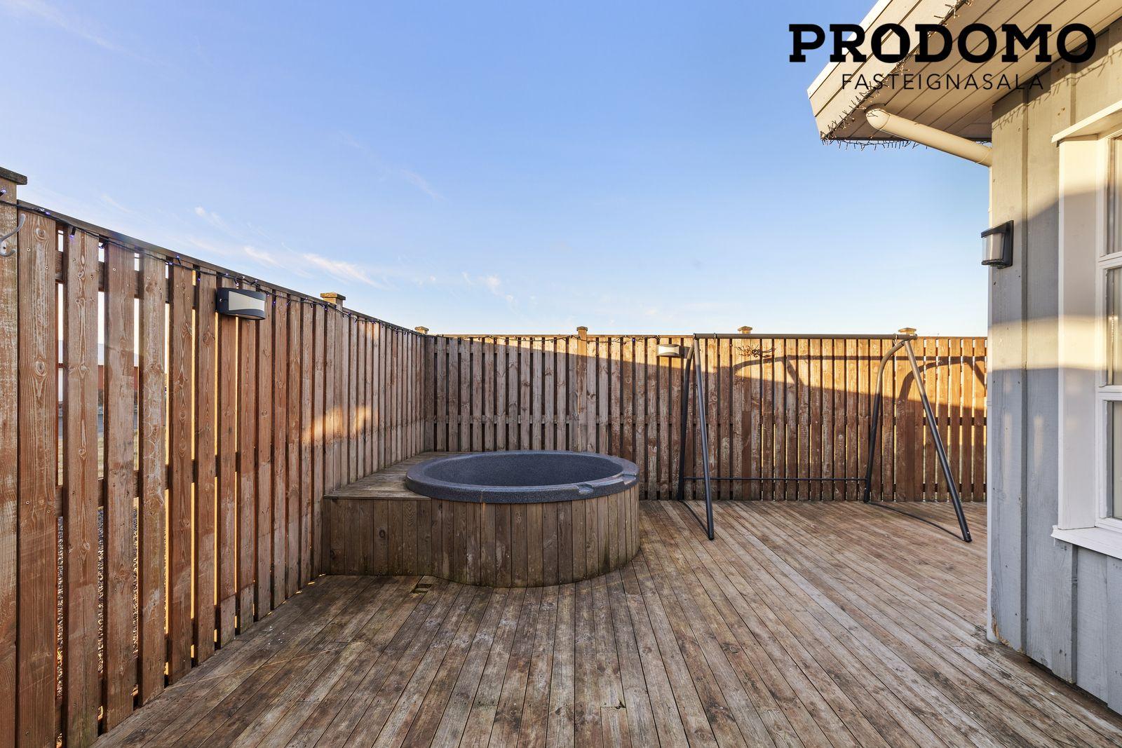 Lóð er tyrft, bílaplan steypt með snjóbræðslu, verönd með skjólveggjum og heitum pott.