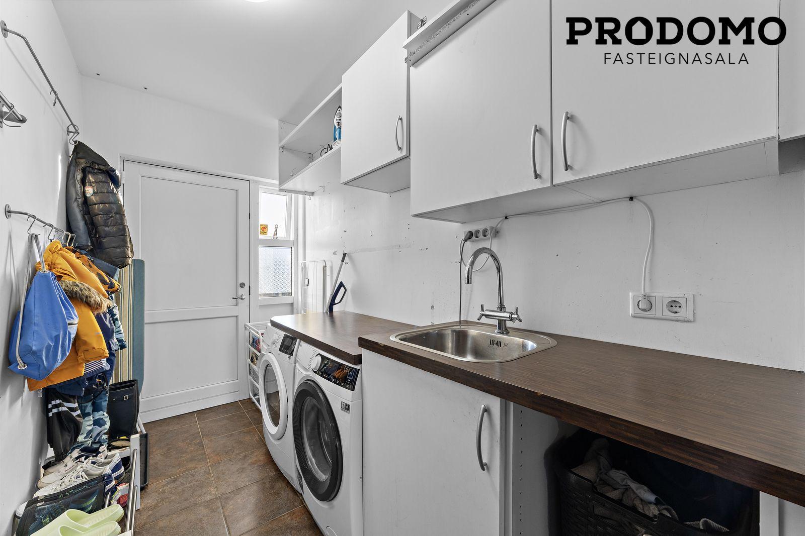 Þvottahús er inn af forstofu, flísar á gólfi, innrétting við vask og útgengt út í lóð.