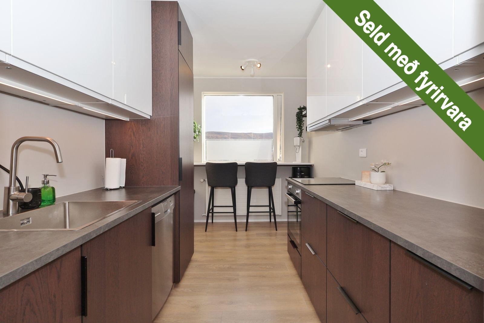 Eldhús falleg innrétting, dökkir neðri skápar, grá bekkplata og hvítir efri skápar. Ísskápur er innfelldur í innréttingu og fylgir með við sölu eignar. Úr eldhúsi er gengið inn í þvottahús.