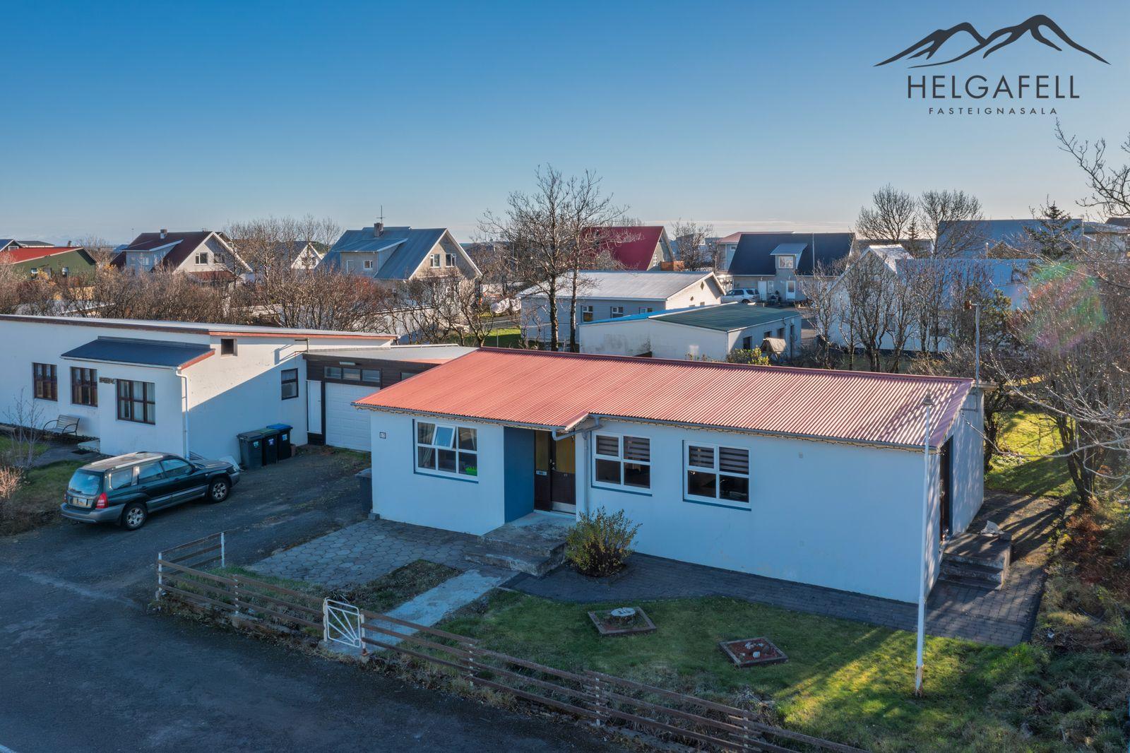 Bílskúrinn: Rúmgóður bílskúr, heitt og kalt vatn, hiti, 3ja fasa rafmagn, rafhleðslustöð, bílskúrshurðaopnari, hitastýring fyrir heitan pott í bílskúr, ómálað gólf.