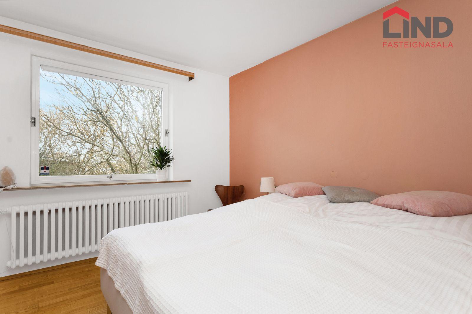 Svefnherbergi 1: Inn af forstofu. Parket á gólfi, fataskápur. Gluggi opnast inn í sólstofu.