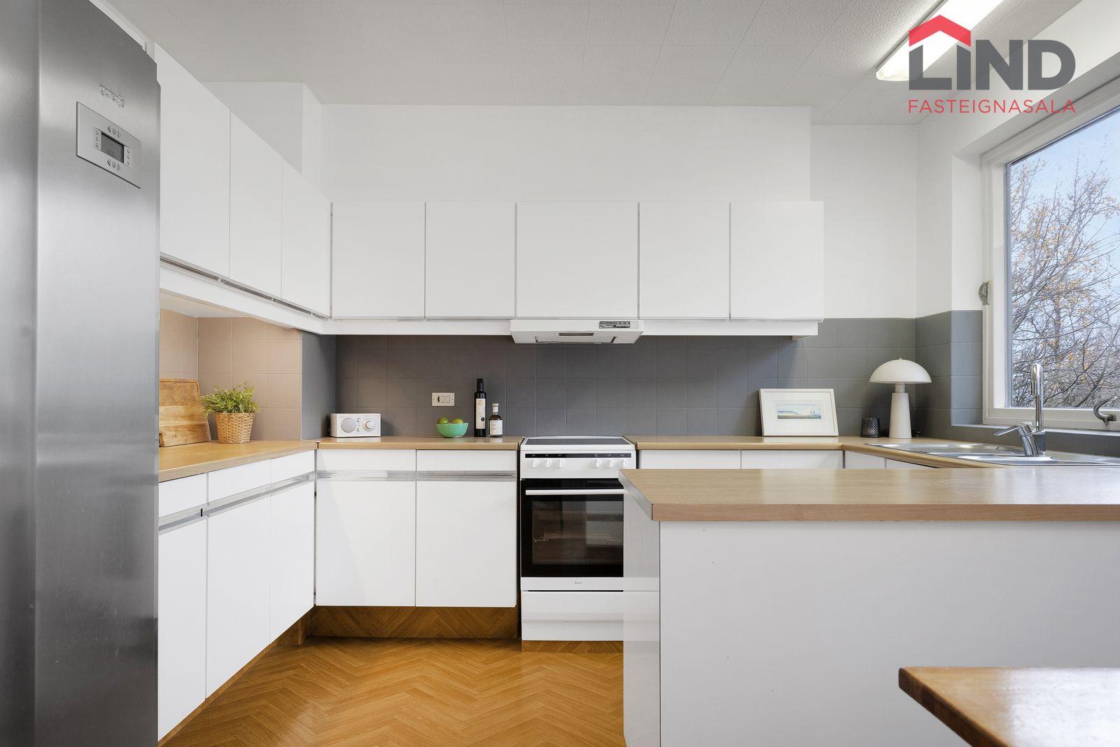 Eldhús: Rúmgott og bjart, dúkur á gólfi, hvít innrétting með góðu skápaplássi.