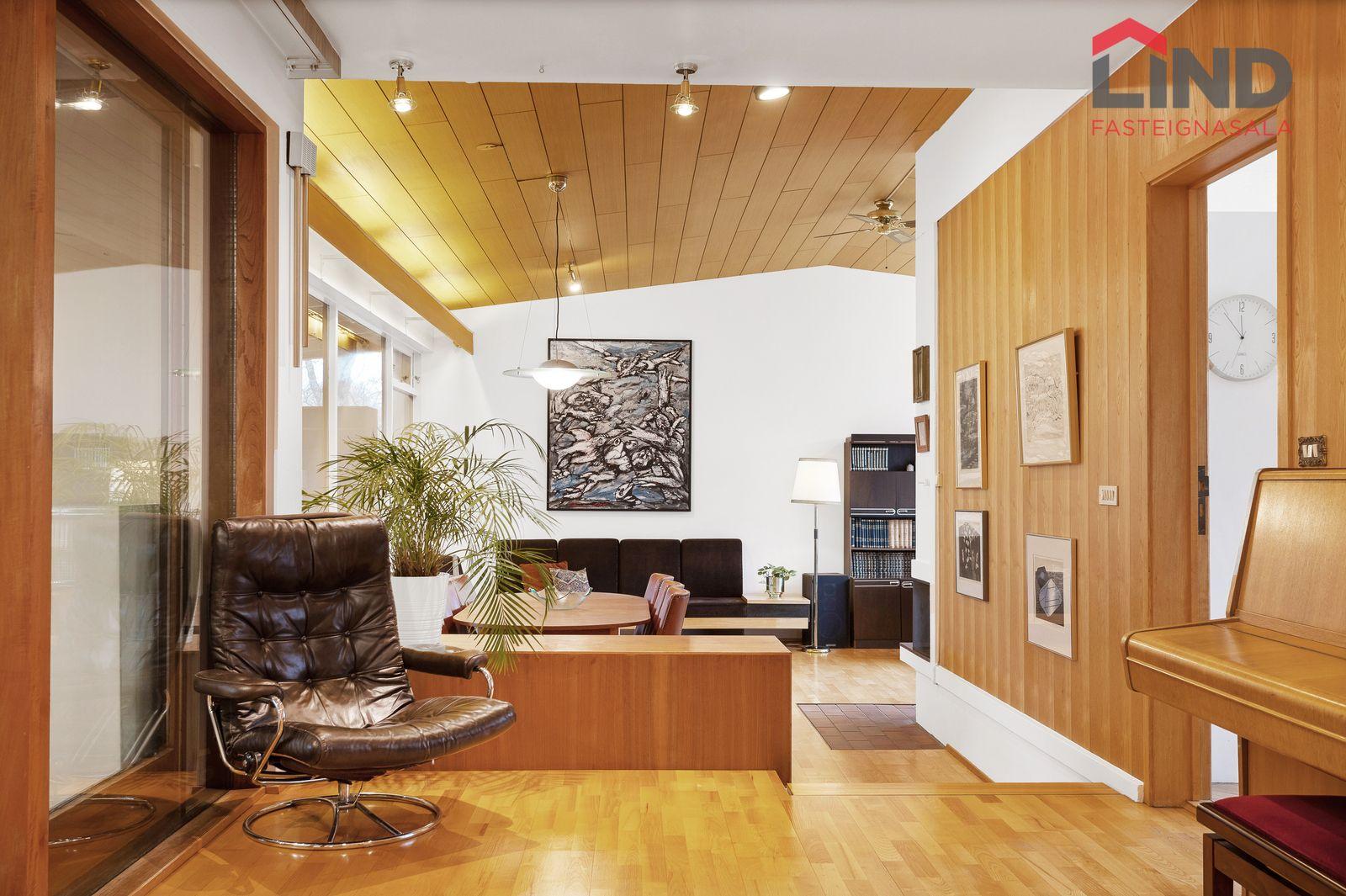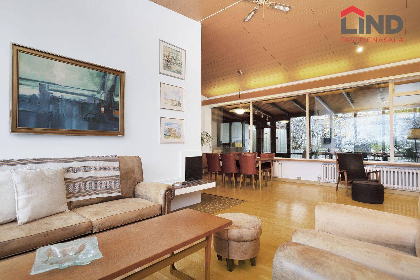 Stofa og borðstofa eru samliggjandi í opnu, björtu rými með mikilli lofthæð. Parket á gólfi, arinn. Stórir gluggar beggja vegna setja svip sinn á rýmið.