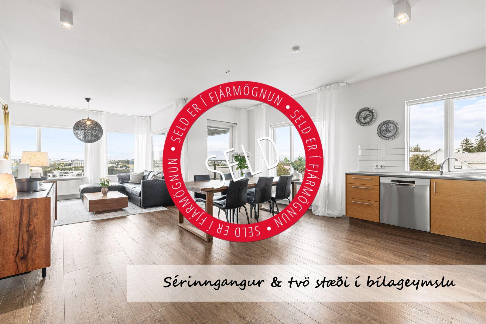 Eignin skiptist í forstofu, eldhús, stofu og borðstofu í opnu rými, tvö svefnherbergi, baðherbergi, þvottahús innan íbúðar og geymslu á jarðhæð en henni fylgja tvo merkt bílastæði í bílskýli.
