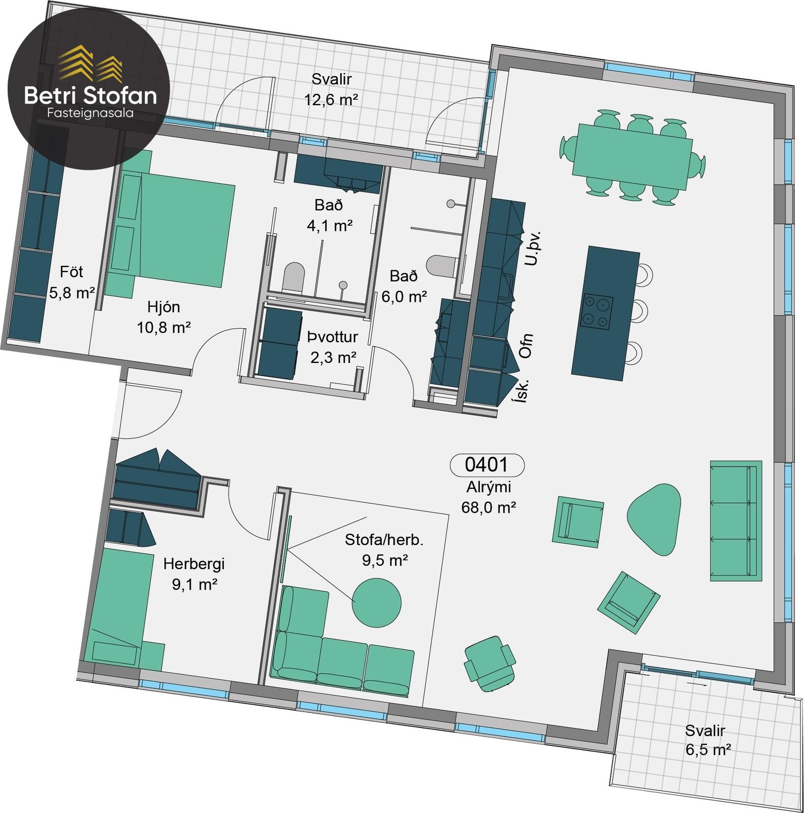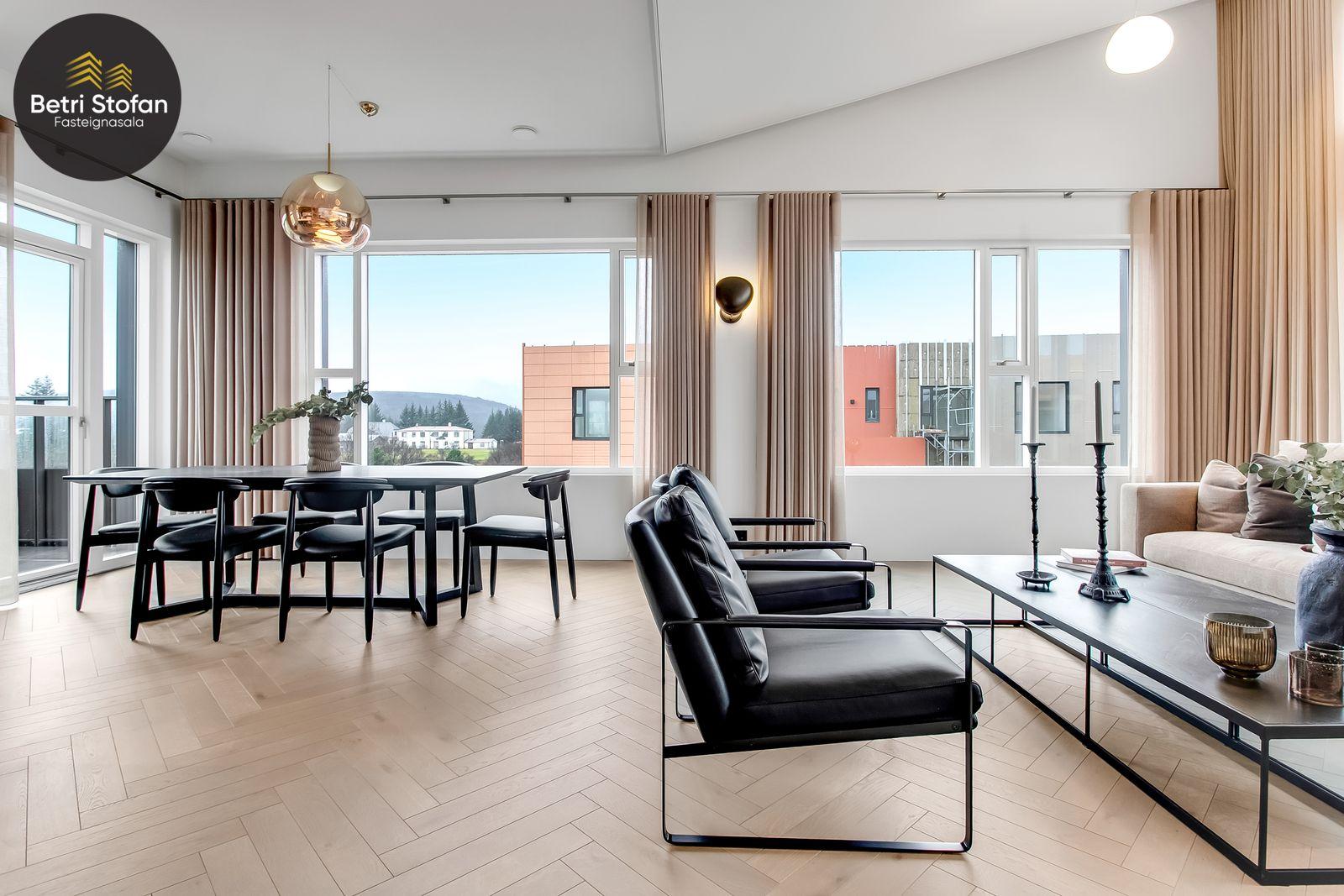 Betri Stofan og Jason Kristinn Ólafsson sími 7751515 sýnum daglega kynna: Glæsileg ný íbúð við Vetrarbraut 2, í nýju og heillandi hverfi við golfvöll GKG í Garðabæ.Íbúð 401 er 180 fermetra endaíbúð á fjórðu hæð, efstu hæð sem er með gæðum eins og bílskúr, gólfhita, loftskiptakerfi, vínkæli, vönduðum innréttingum, tvennum svölum, aukinni lofthæð og tveimur stæðum í bílakjallara. Steinn á borðplötum. Eigninni fylgir bílskúr ásamt tveimur bílastæðum í lokaðri bílageymslu merkt B32 og B33. Lofthæðin er góð í íbúðinni. Fallegt útsýni til austurs, suðurs og vesturs.https://vetrarbraut.is/Nánari lýsing:Eignin skiptist í anddyri, hol, eldhús, borðstofu og stofu í rúmgóðu og björtu alrými þaðan sem gengið er út á tvennar svalir. Glæsileg rúmgóð