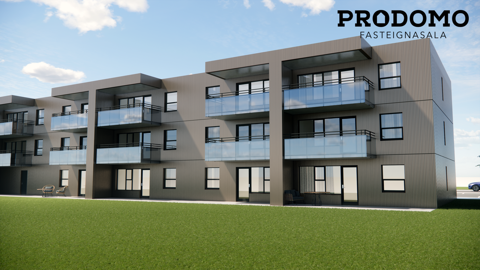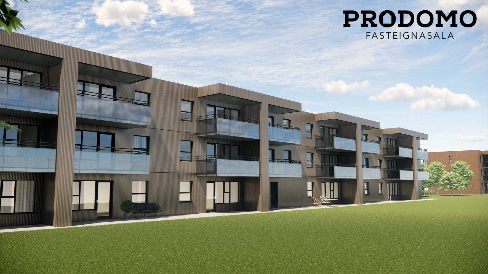 Nánari lýsing íbúðar 105: Glæsileg þriggja herbergja íbúð á jarðhæð með sér inngangi. Íbúðin skiptist í anddyri með fataskáp. Stofu og eldhús í opnu rými, tvö svefnherbergi með fataskápum. Frá stofu er útgengt á baklóð þar sem íbúðinni fylgir sérafnotareytur. Baðherbergi með sturtu, þar er aðstaða fyrir þvottavél og þurrkara. Geymsla er innan íbúðar, góður gluggi er á henni og því hægt að nýta hana sem þriðja svefnherbergið.