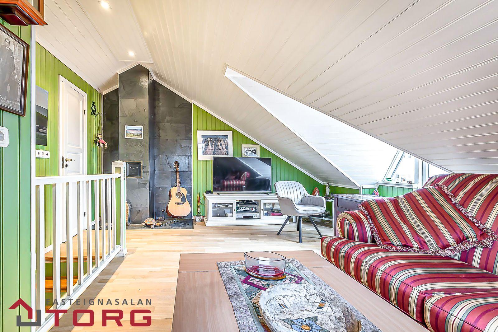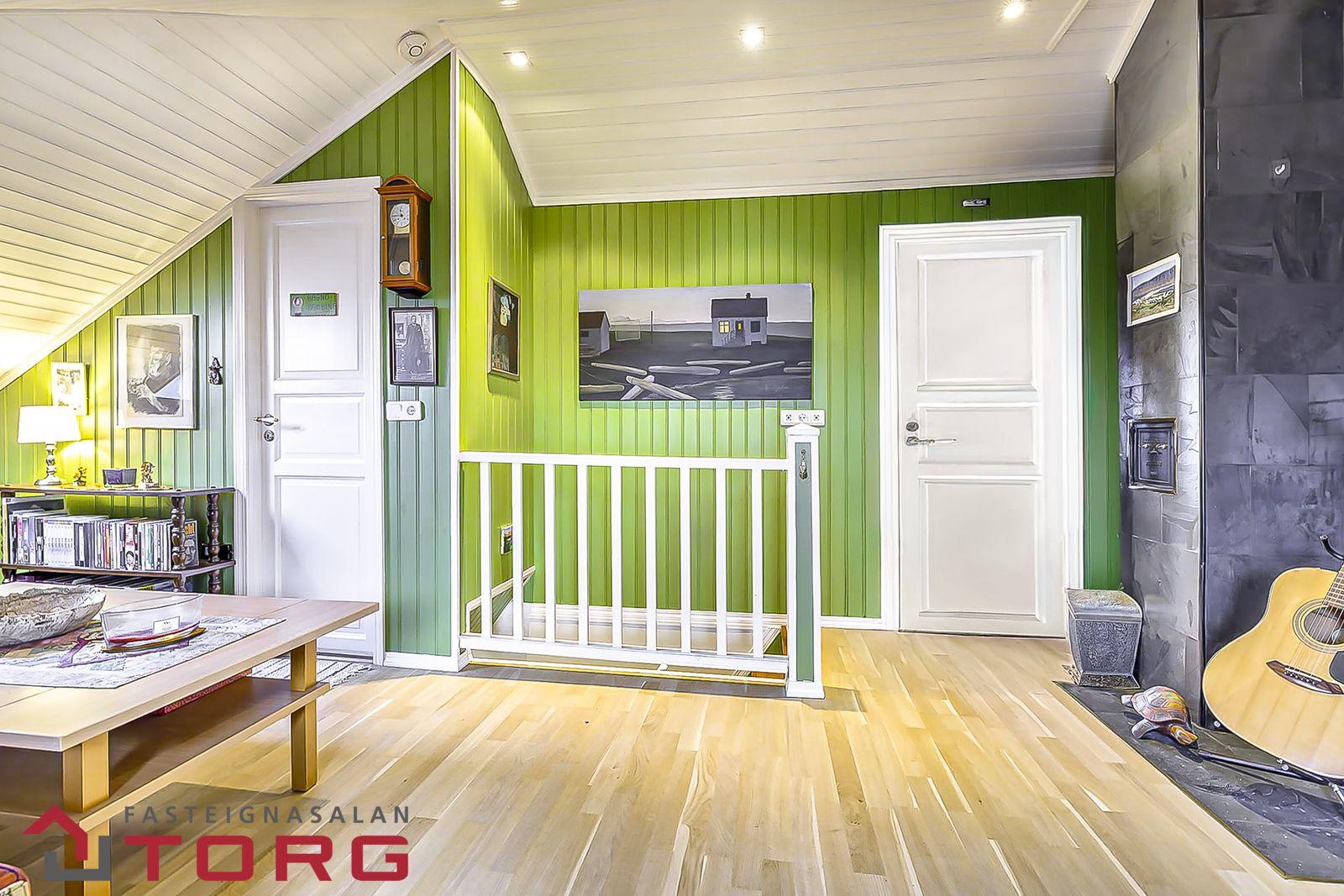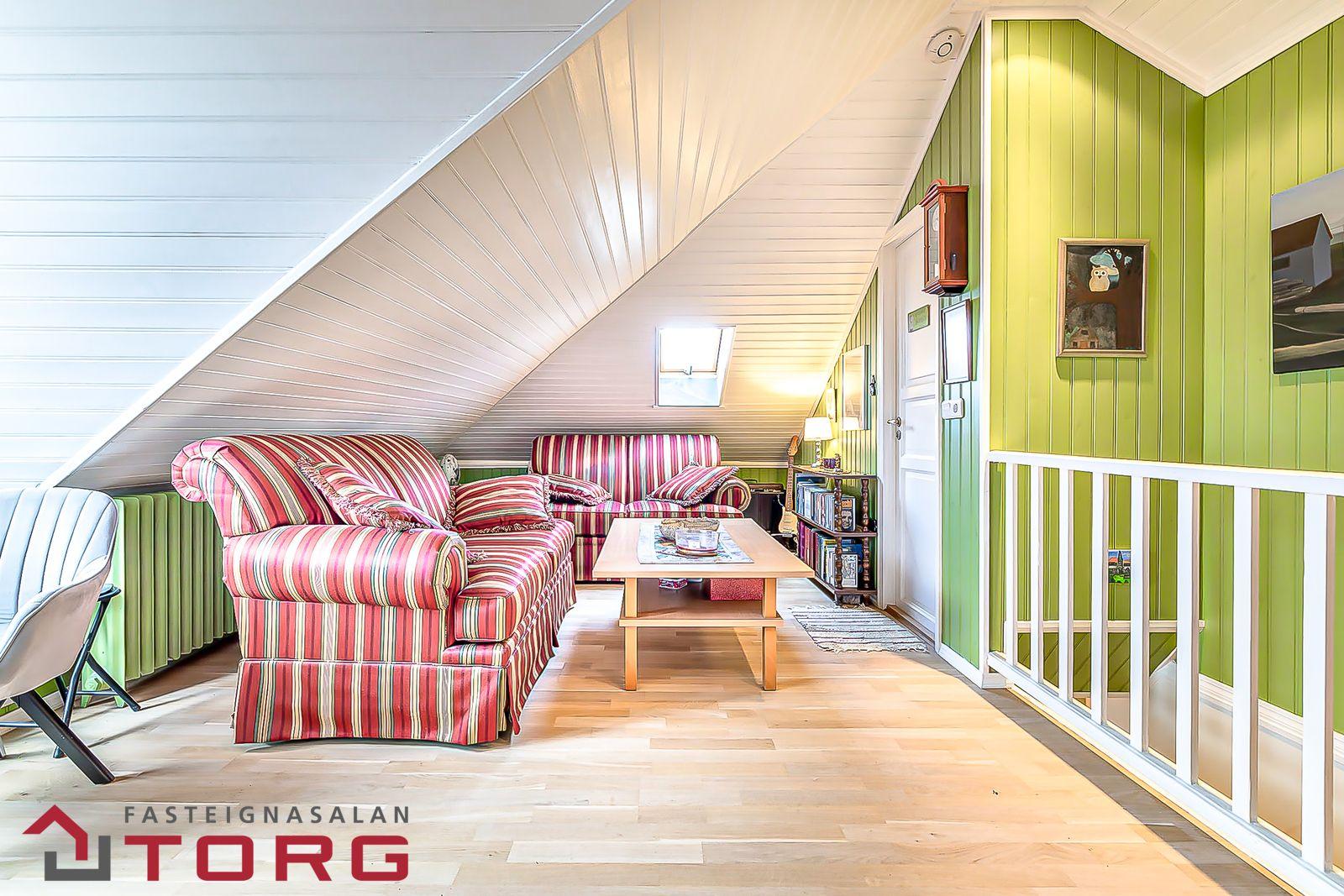 Sjónvarpshol er að hluta undir súð og með viðarparketi á gólfi. Viðarpanell í lofti.