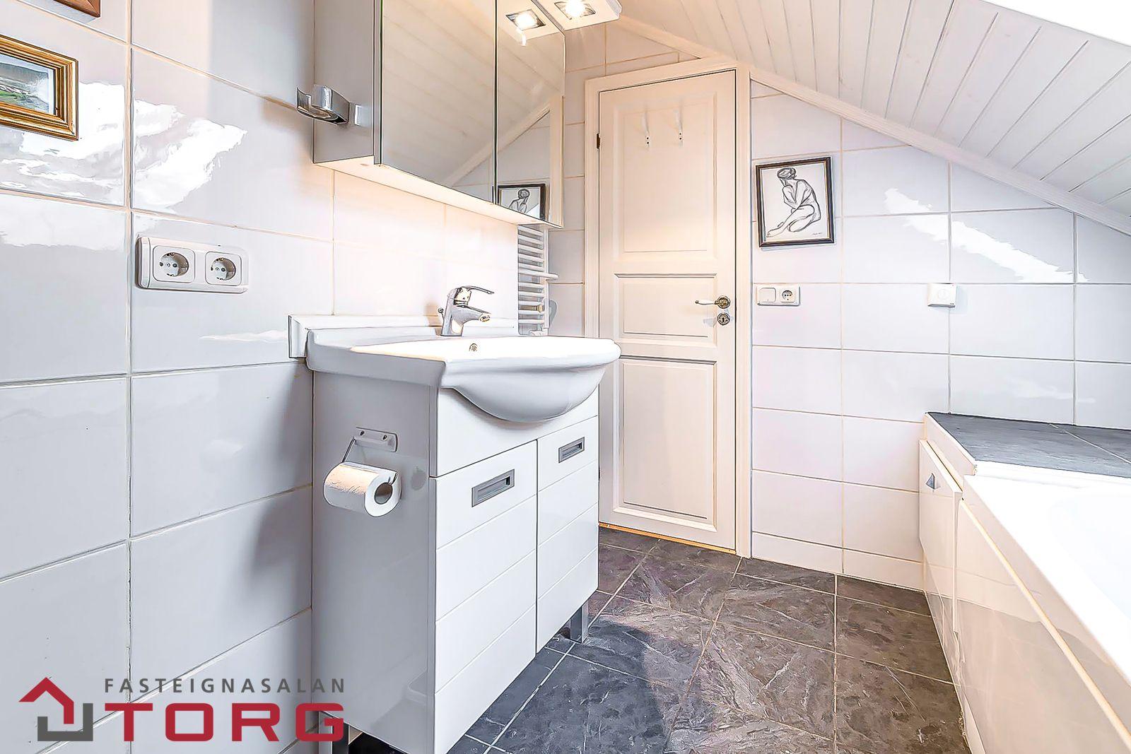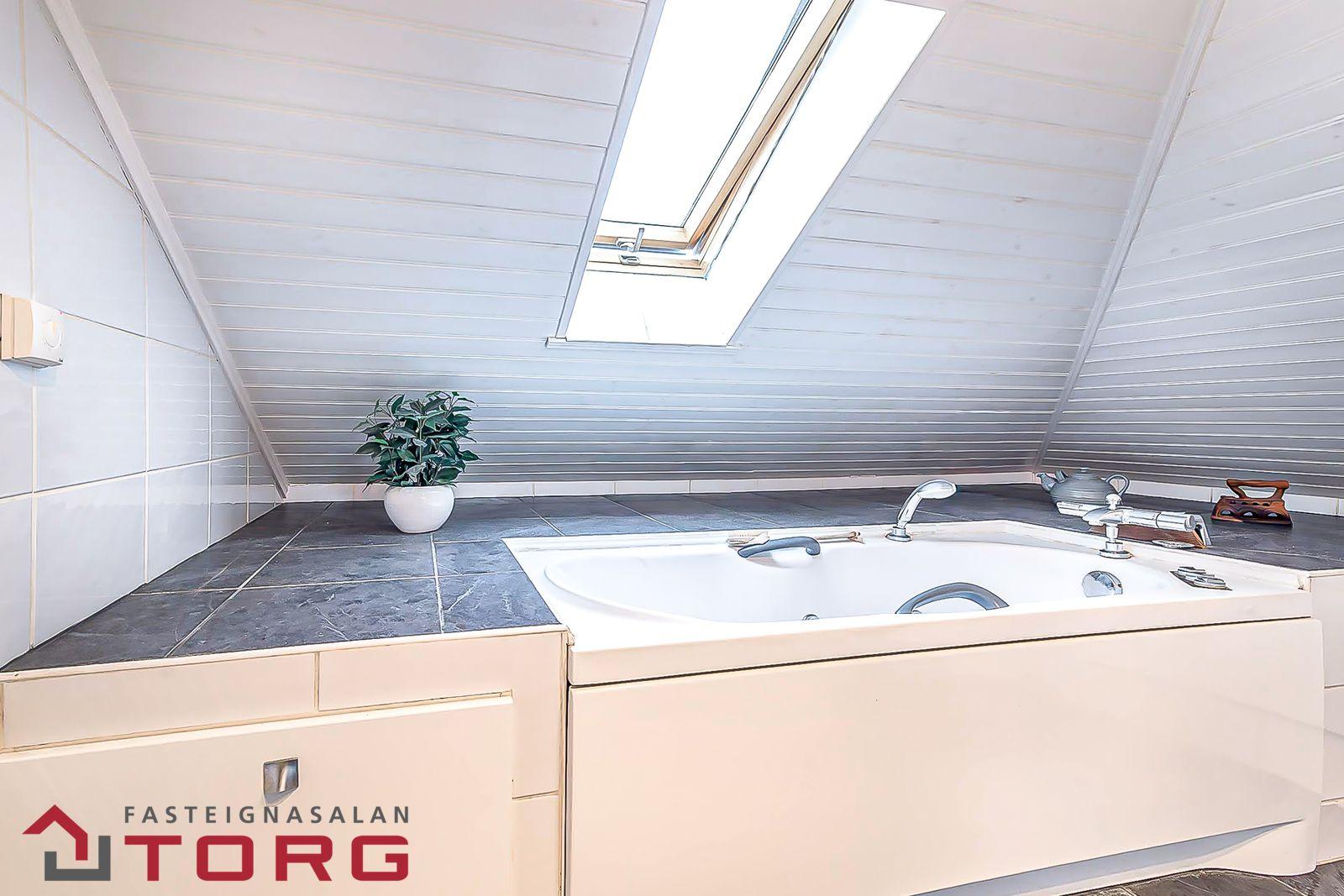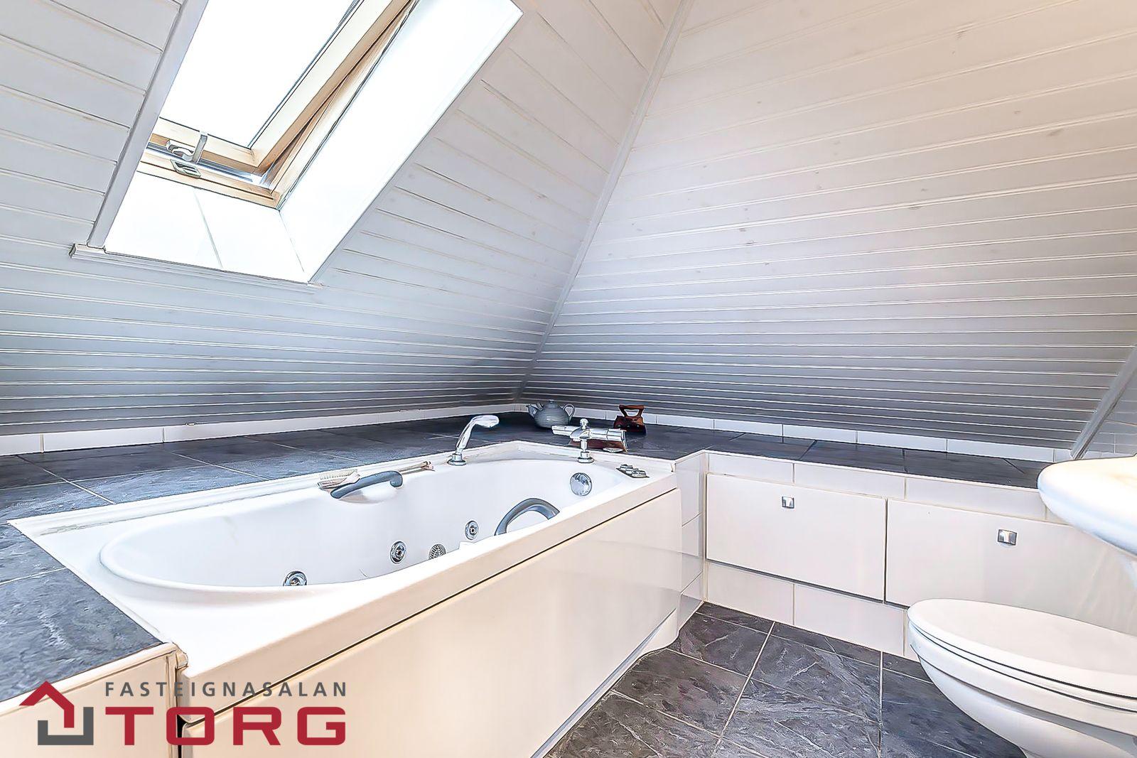 Baðherbergi er afar smekklegt með ljósum flísum og gráum granítflísum. Nuddbaðkar, salerni og hvít innrétting með vaski og veggskáp. Gólfhiti. Þakgluggi. Viðarpanell í lofti.