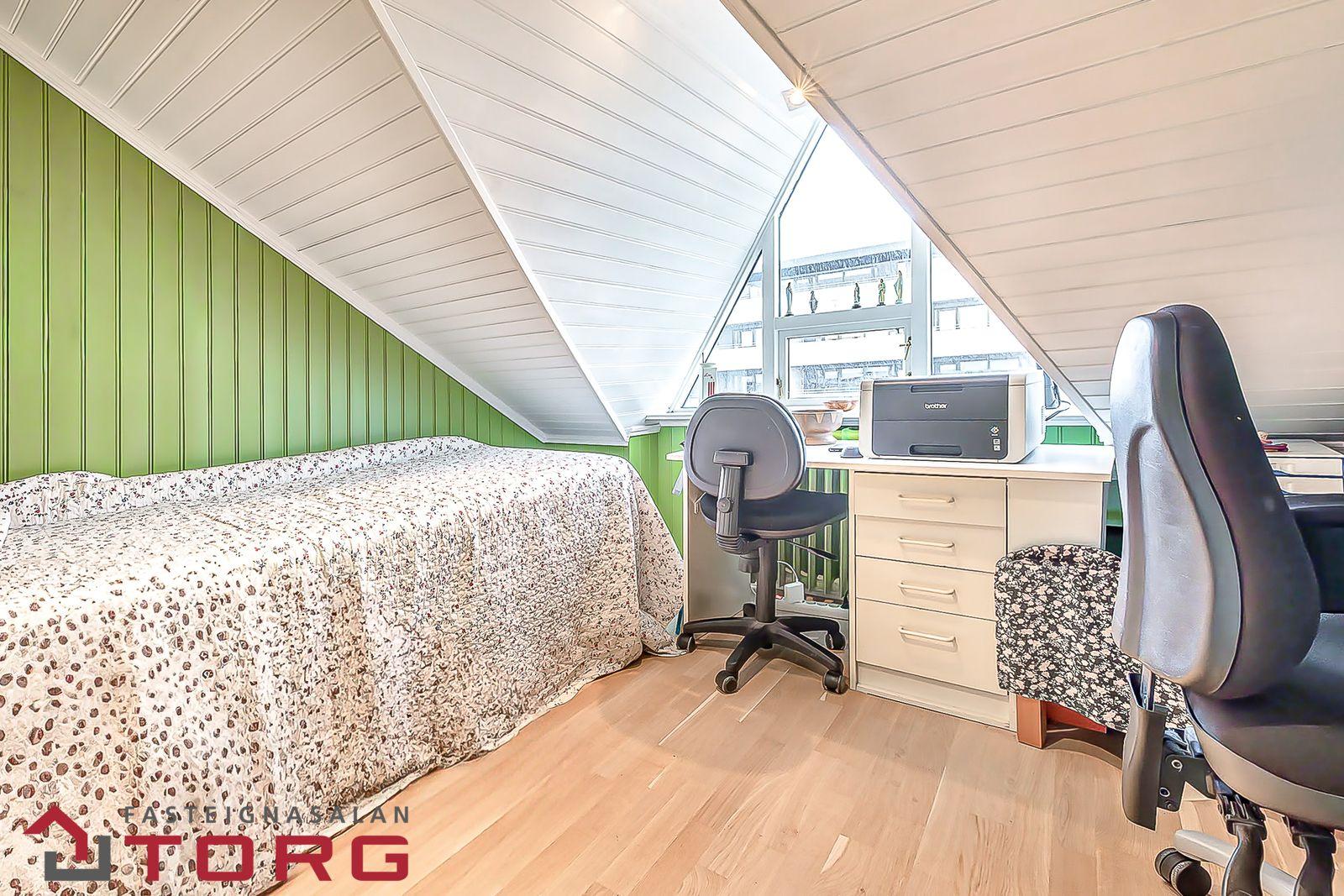 Herbergi er með kvisti og góðum glugga og að hluta undir súð en ágætlega rúmgott. Viðarparket á gólfi. Viðarpanell í lofti.