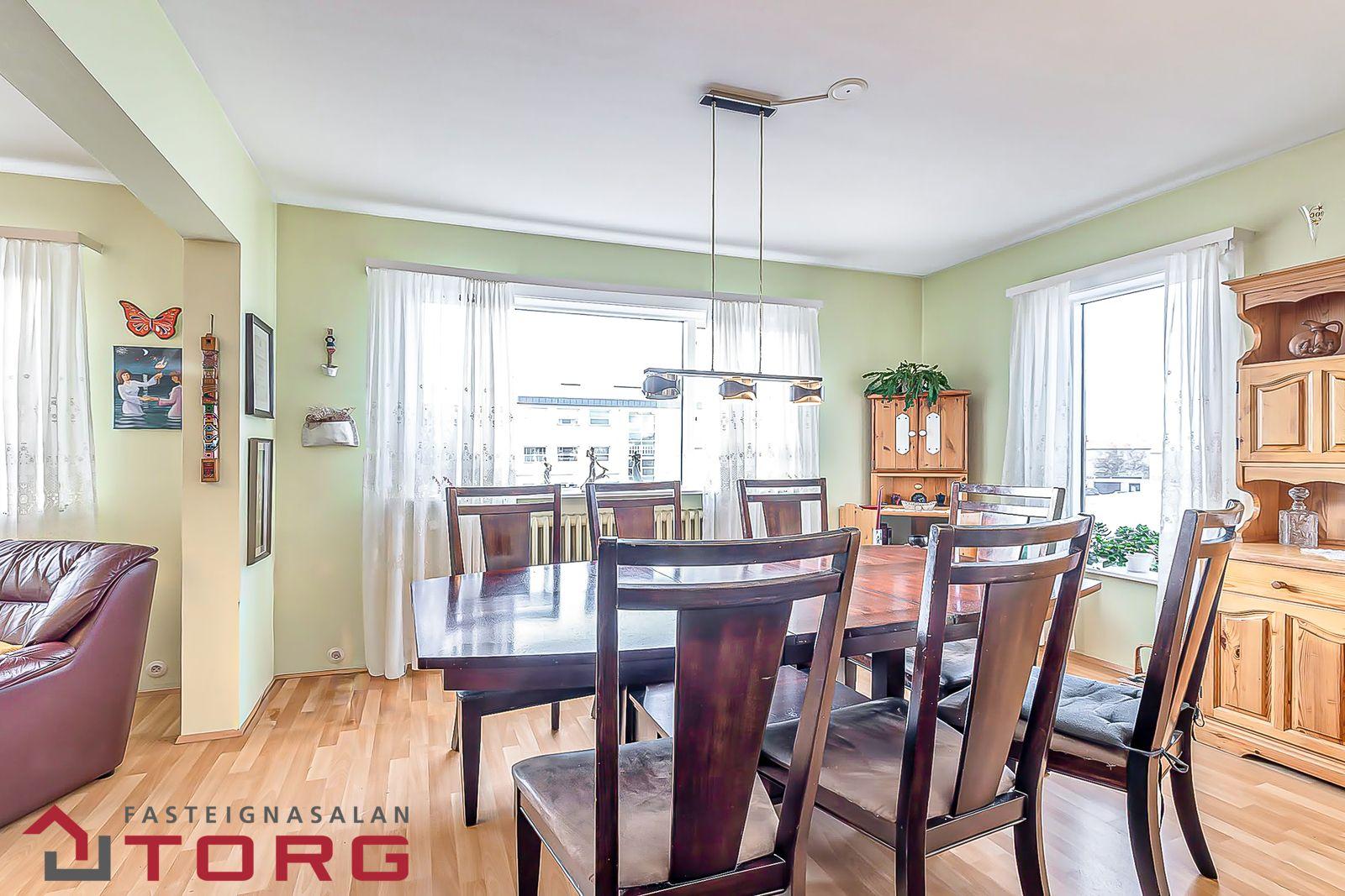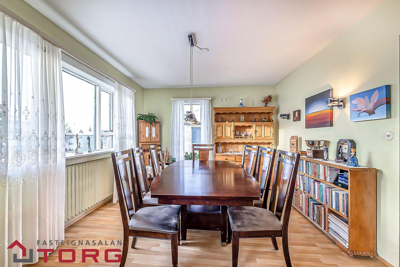 Borðstofa er með sér sér hurðarop en er líka opin inn í stofu. er með glugga á tvo vegu og plastparket á gólf.