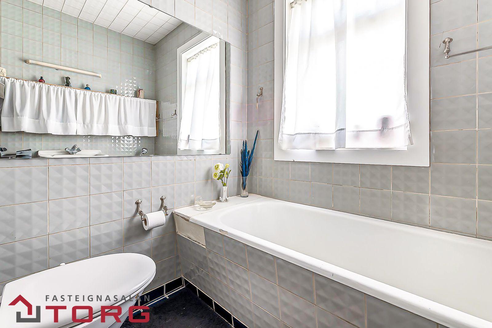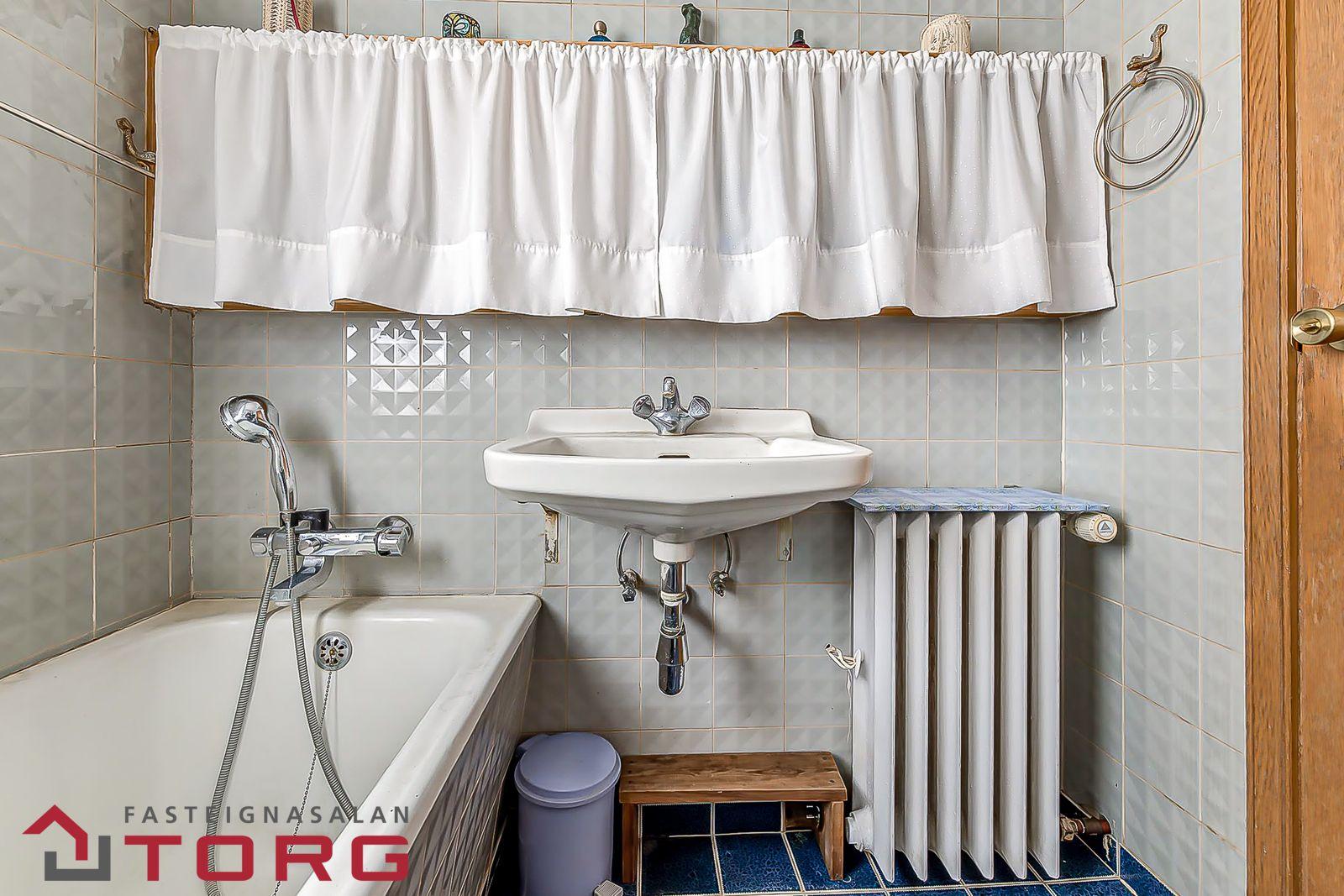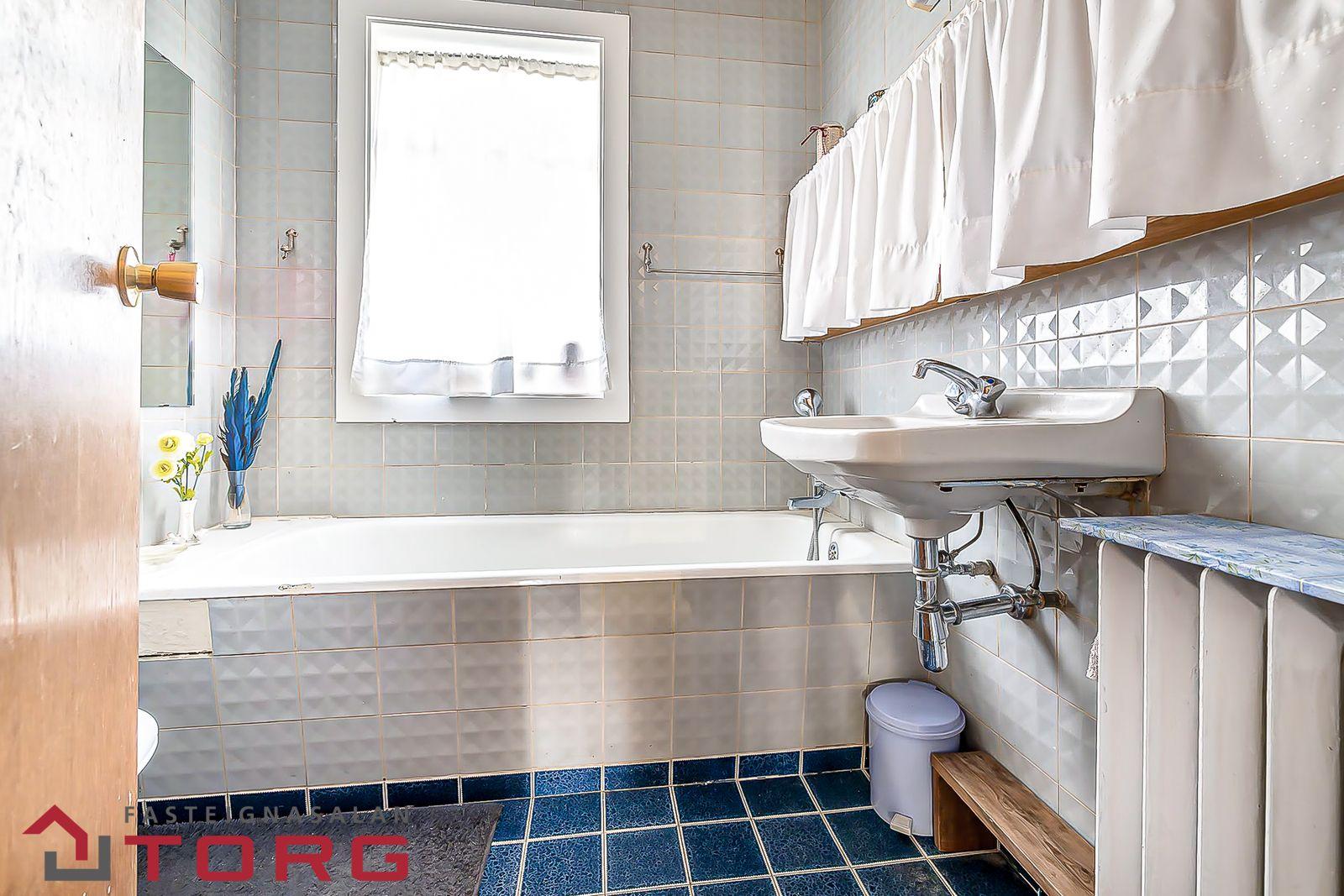Baðherbergi neðri hæðar er flísalagt hátt og lágt. Þar er vaskur, bað og salerni.