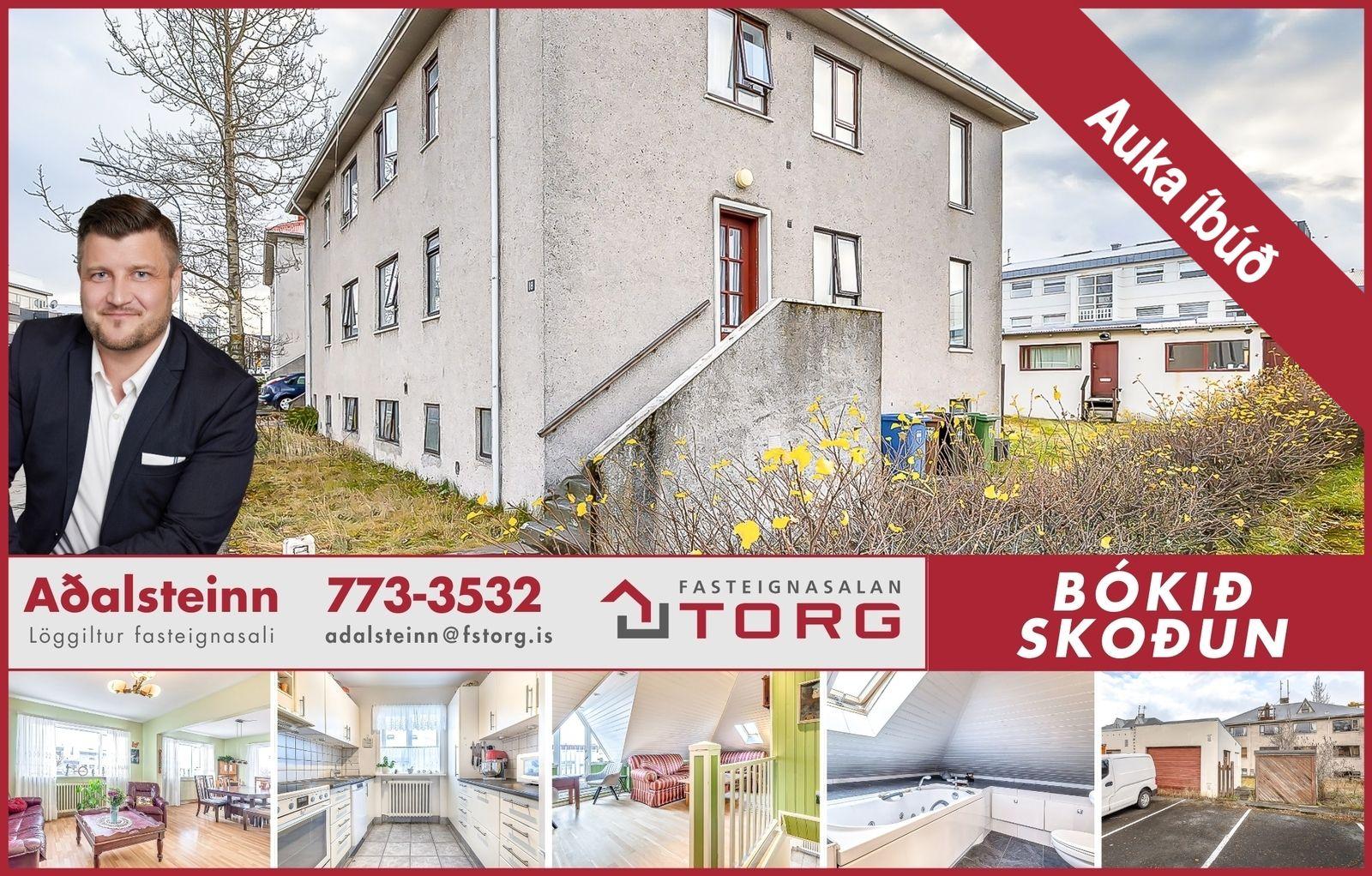 Fasteignasalan TORG og Aðalsteinn Bjarna lgf. kynna í sölu 4-5 herbergja efri hæð og ris auk stúdíóíbúðar í bílskúr á vinsælum stað við Skipholt 18 í Reykjavík - Um er að ræða eign sem er skráð í heildina 143,20 m2 samkvæmt fasteignaskrá HMS, þar af er íbúð 97,40 m2, bílskúr 28 m2, þvottaherbergi 13,20 m2 og geymsla 4,60 m2. - Eignin skiptist í eldhús, stofu(herbergi), borðstofu, gang, hjónaherbergi, tvö baðherbergi (uppi, niðri), herbergi, sjónvarpsherbergi, þaksvalir, sér þvottaherbergi (kjallara) og geymslu. - Bílskúr hefur verið breytt í útleigueiningu með sérinngang, eldhús, bað og stofu/herbergi. Sérbílastæði er við bílskúr (Stangarholt megin) og svo eru bæði bílastæði framan við hús og við lóð bakatil. - Taka má fram að í risi eru 15,10 m2 sem skráðir eru undir 180 í salarhæð (undir súð) og 34,40 m2 sem skráðir eru undir 110 cm í salarhæð (portrými), svo það er meira rými þar en skráðir fermetrar segja til um. - Vinsæl staðsetning með tilliti til ýmissa þátta, enda afar miðsvæðis í Reykjavík. - Sjón er sögu ríkari -