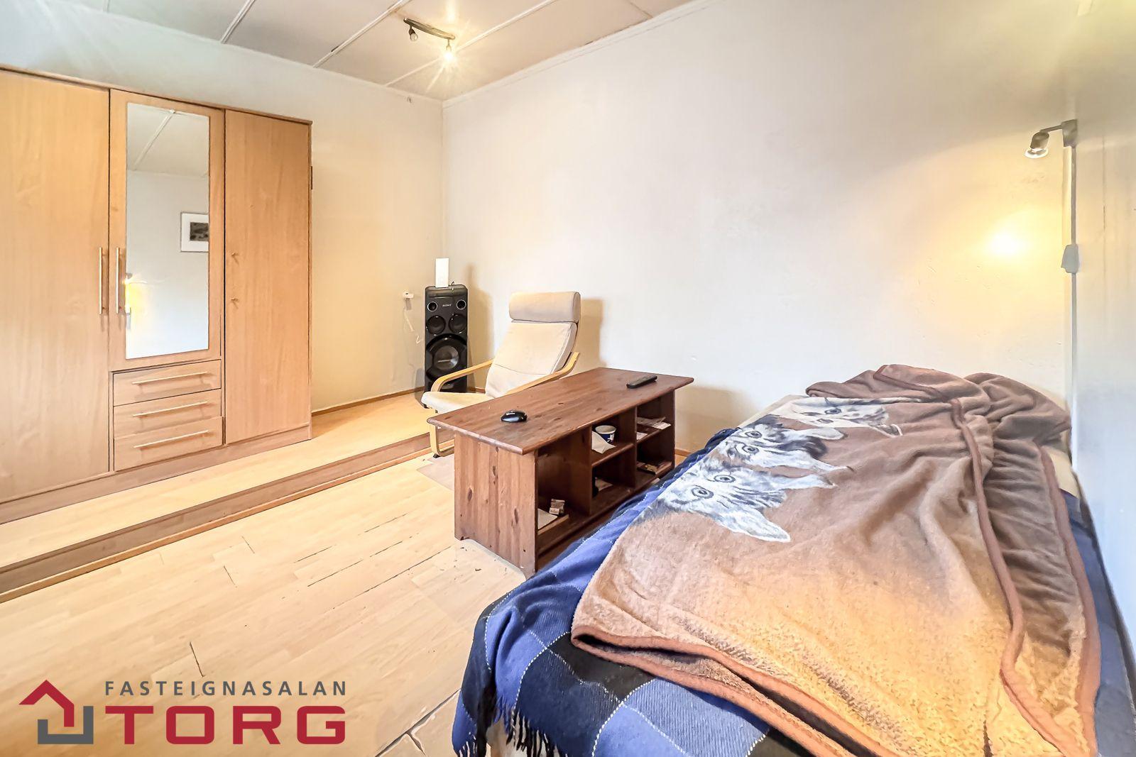 Stofa er bæði með sér hurðarop en er líka opin inn í borðstofu og mætti auðveldlega gera að svefnherbergi. Stór gluggi með opnanlegt fag og plastparket á gólfi.