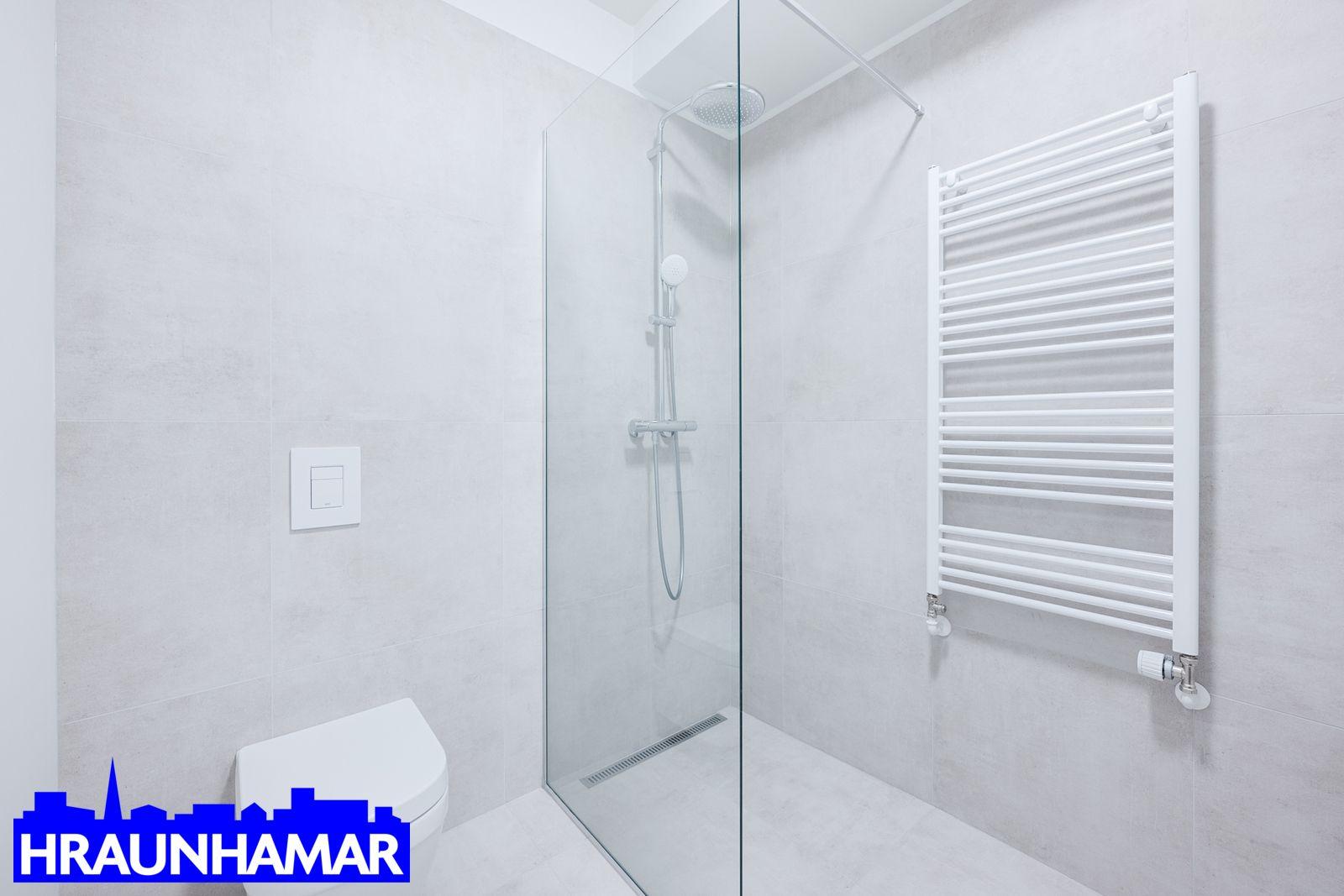 Flísalagt baðherbergi með innréttingu, upphengdu salerni og sturta, þvottaaðstaða inn á baðherbergi.
