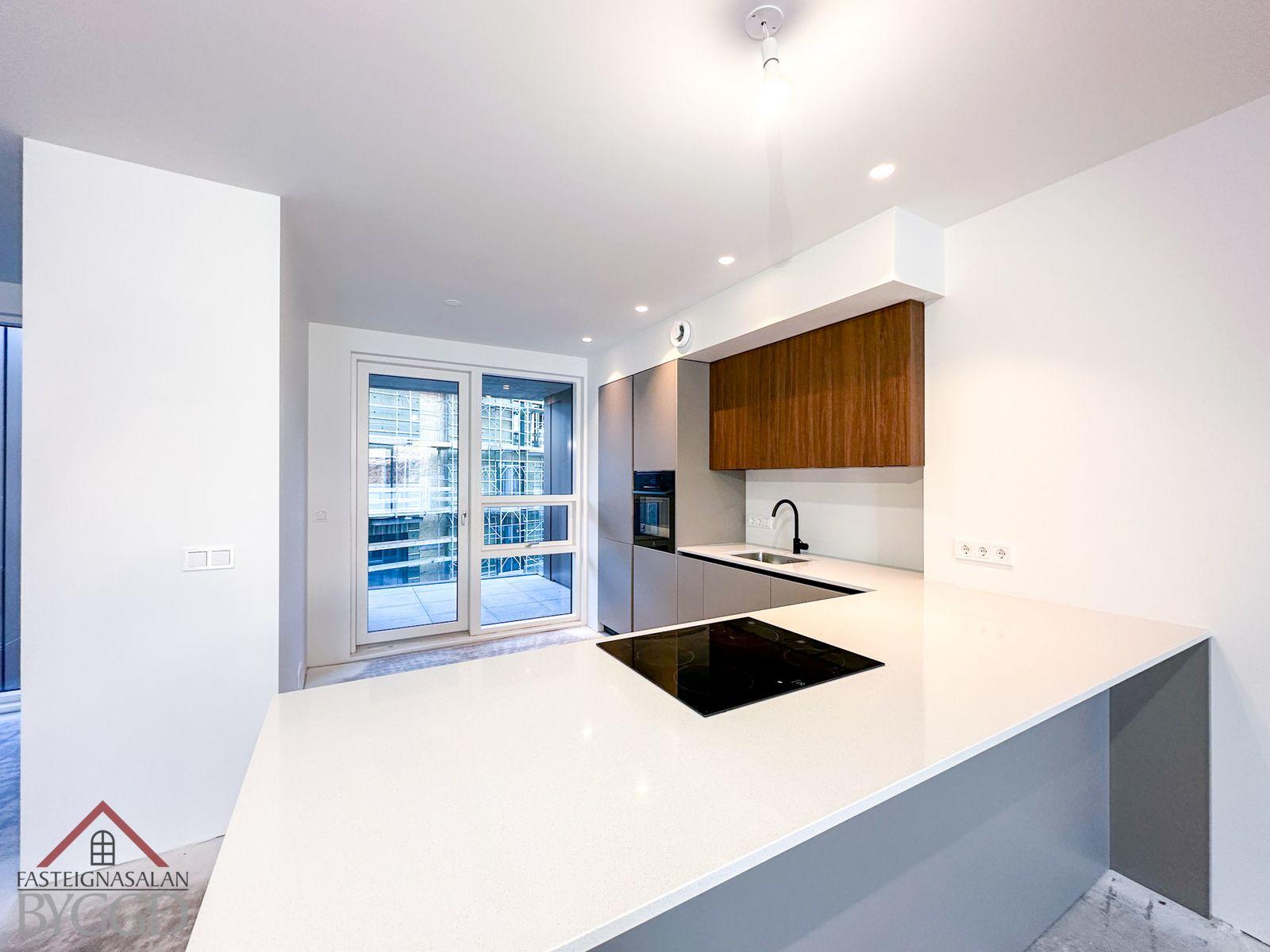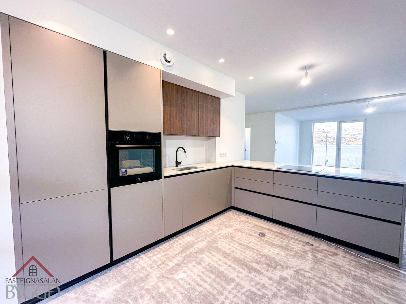 Opið eldhús, með eyju, kvarts steinn á borðplötu og span helluborð. Skúffur og skápar í eldhúsinu eru allar með ljúflokum. Eldhúsinnrétting með kvarts stein, bakaraofn í vinnuhæð, innfelldur vaskur. Allar skúffur og skápar með ljúflokum. Innfelld lýsing frá Lumex. Útgengt út á 7fm. vestur-svalir úr eldhúsi.