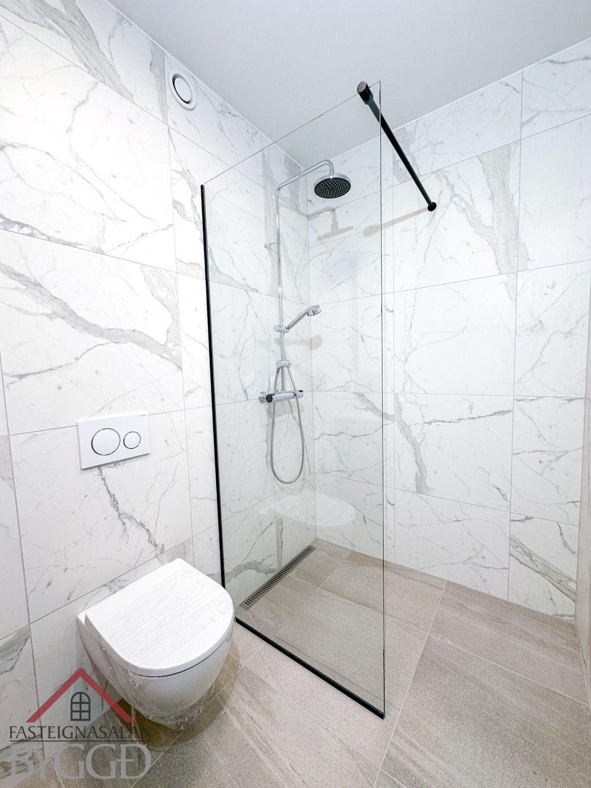 Baðherbergi: Sturta með glerskili. Falleg innrétting frá Parka, kvarts steinn á borðplötu. Upphengt salerni. Skápur fyrir þvottavél og þurrkara, borðplata úr kvarts stein.