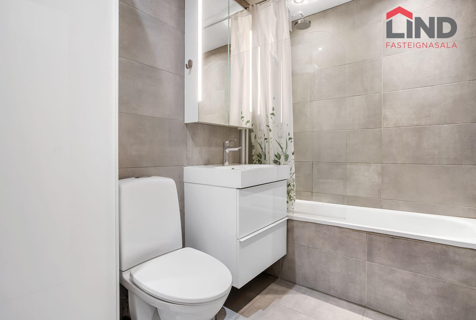 Nýjar flísar, klósett, innrétting og speglaskápur á baðherbergi 2023.