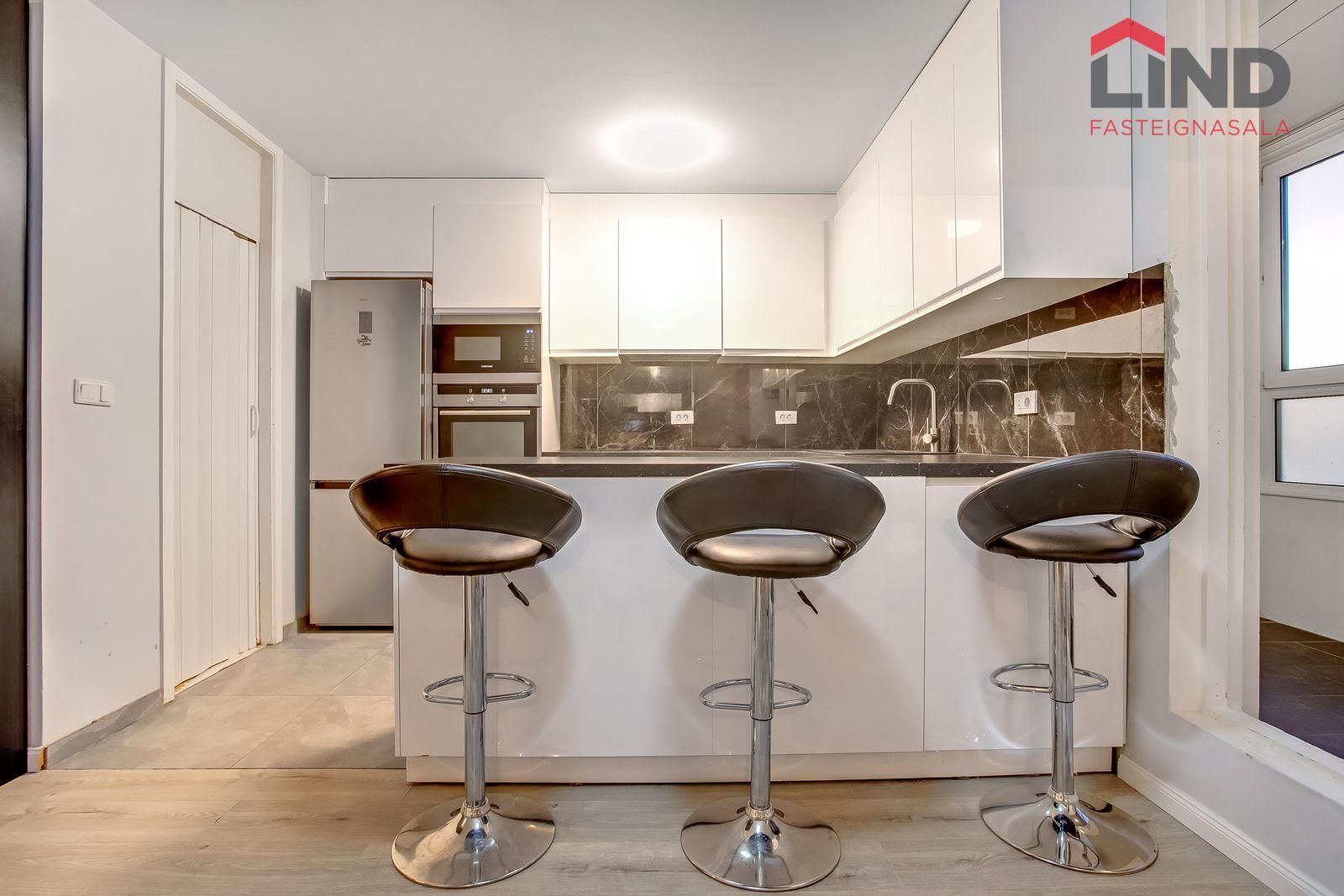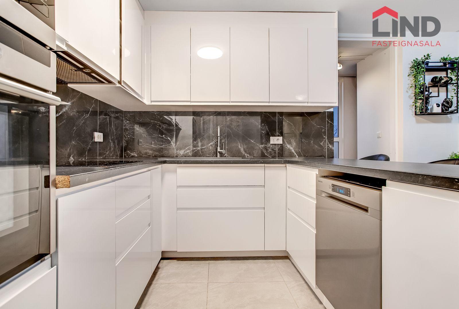 Eldhúsið er með nýlegri eldhúsinnréttinguí hvítir efri og neðri skápar, viðarborðplata, eldavél með bakaraofn í vinnuhæð, innbyggður örbylgjuofn og helluborð Tengi er fyrir uppþvottavél og pláss fyrir einfaldan ískáp. Inn af eldhúsinu er gengið út á yfirbyggðar svalir. Flísar á gólfi.