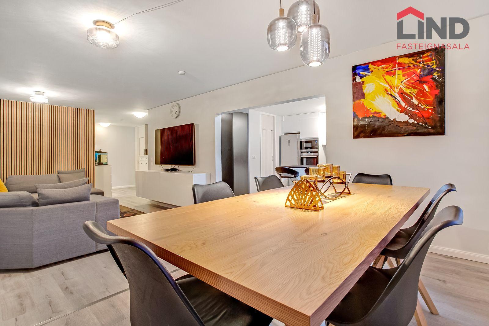 Alrýmið er rúmgott, skipt upp með borðstofu á upphækkun sem er með harðparketi á gólfi og á gólfi stofuhluta.