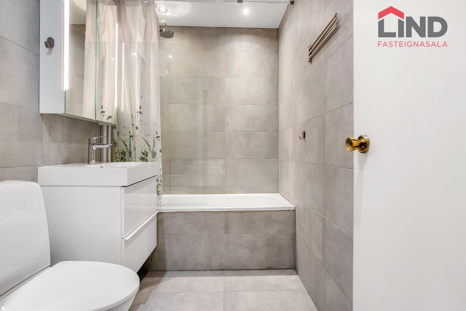 Baðherbergið er flísalagt í hólf og gólf, klósett, vaskur og baðkar með sturtu.