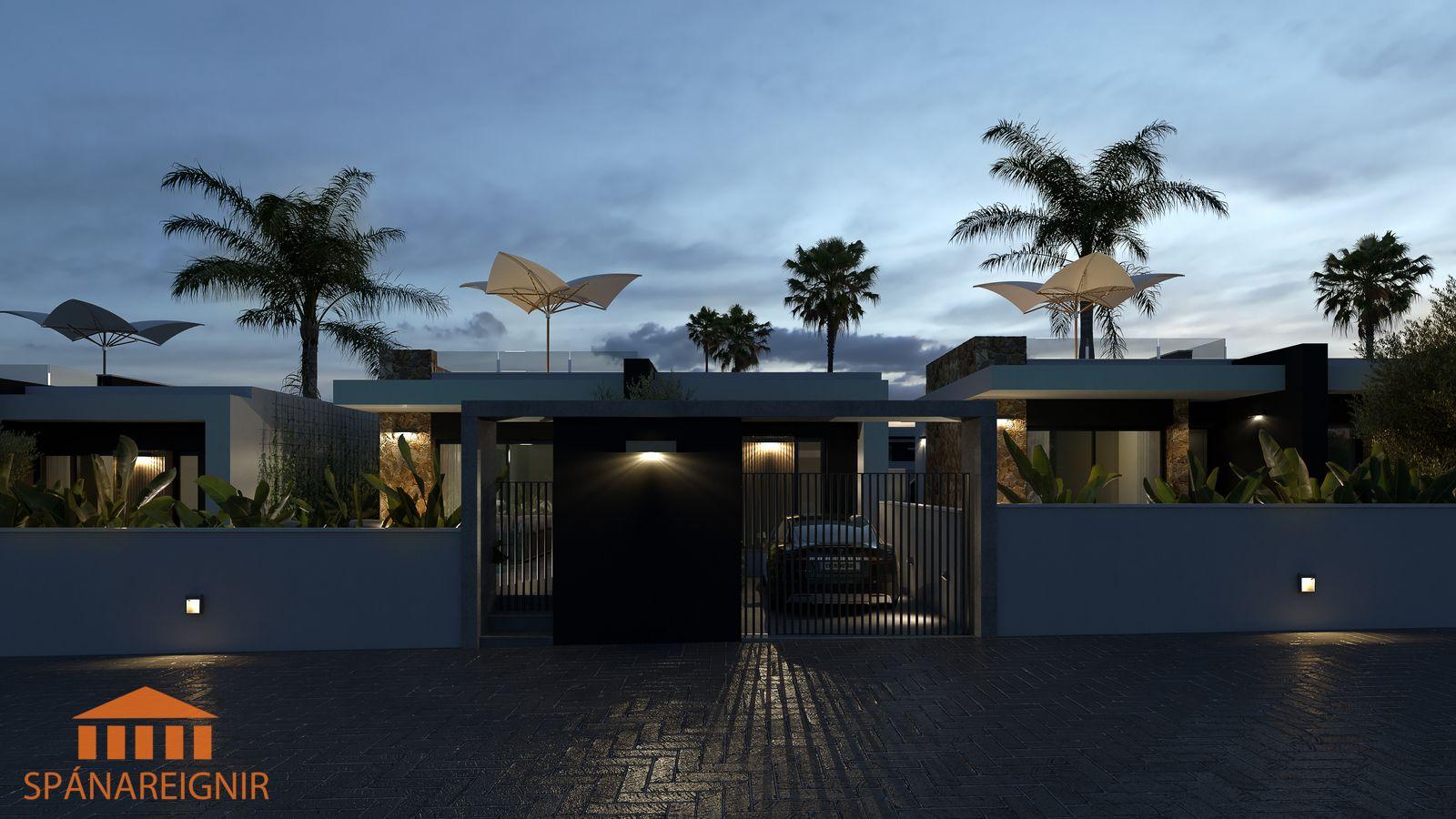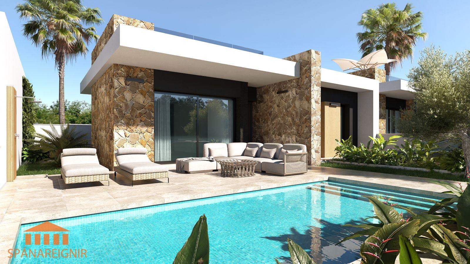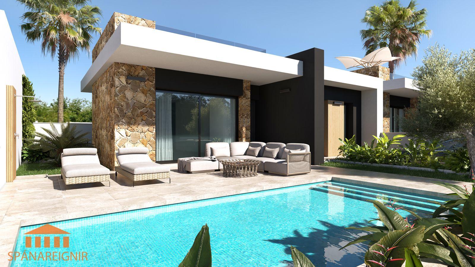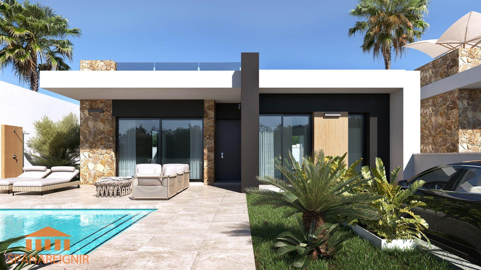 Falleg, björt og vel hönnuð einbýlishús á einni hæð með lokuðum einkagarði og einkasundlaug í DONA PEPA , um 30 mín akstur suður af Alicante. Þrjú svefnherbergi, tvö baðherbergi, góð stofa, eldhús opið við borðstofu. Flott hönnun. Góð verönd framan við húsið. Lokaður einkagarður með einkasundlaug. Góðar þaksvalir með glæsilegu rými.