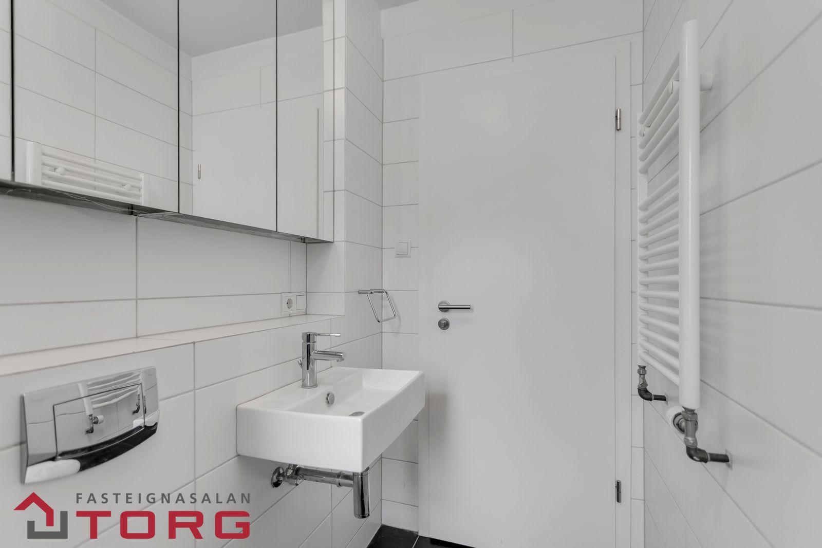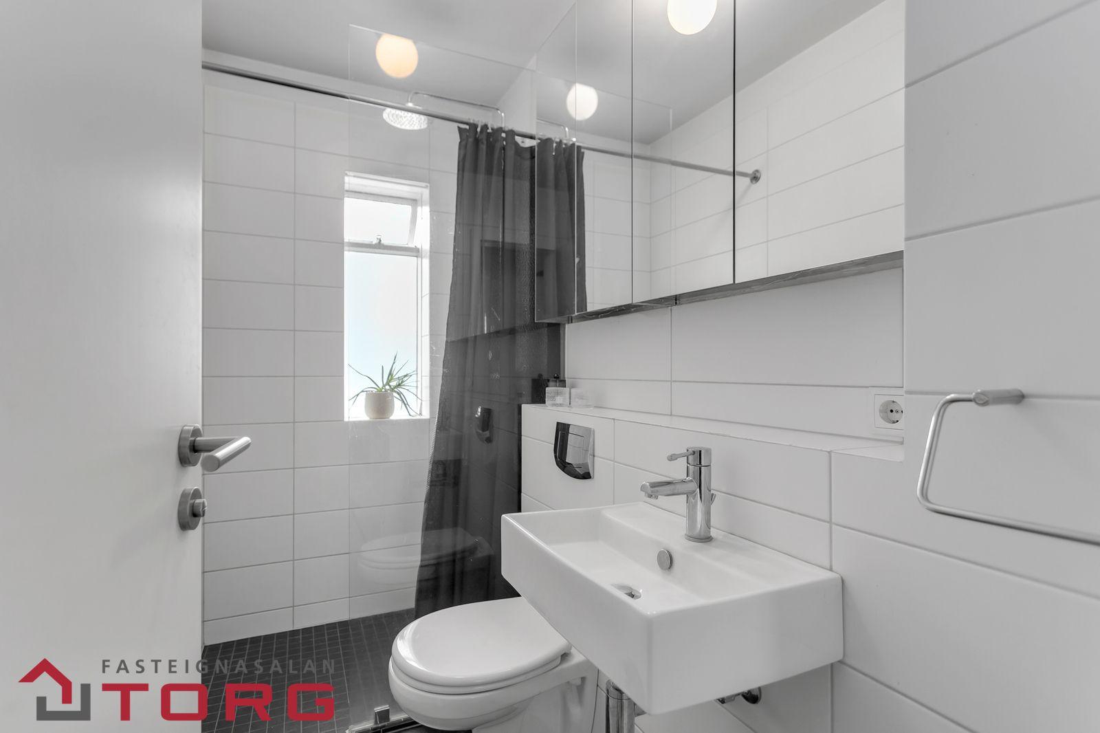 Baðherbergi: Mikið endurnýjað með flísum á gólfi og veggjum. Búið speglaskáp, handlaug, upphengdu salerni, handklæðaofni, sturtu með hertu gleri og glugga með opnanlegu fagi.