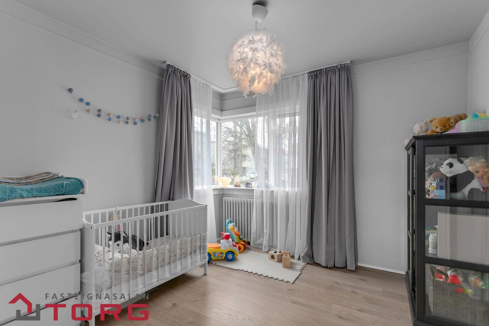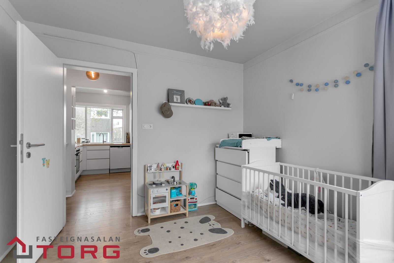 Svefnherbergi: Samkvæmt teikningum er gert ráð fyrir borðstofu, en núverandi eigendur hagnýta rýmið sem barnaherbergi. Herbergið er bjart búið rennihurð sem opnar rýmið að stofu. Harðparket á gólfi.