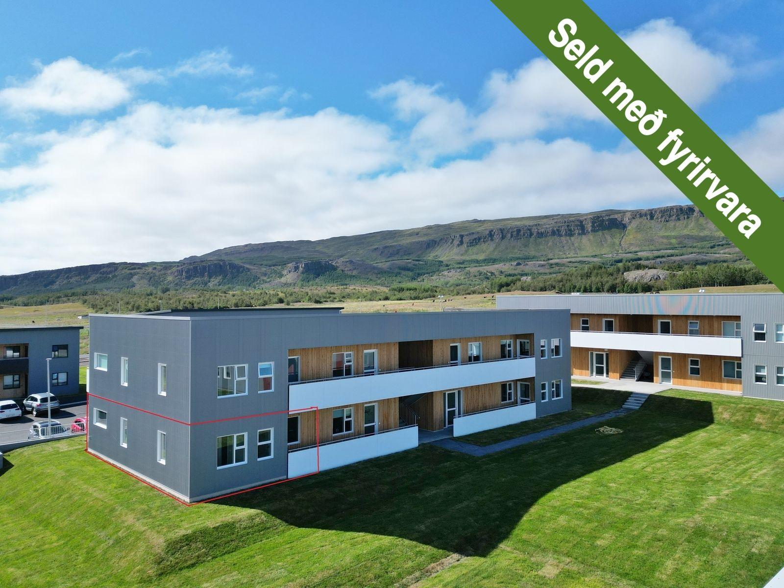 Forstofa er með harðparketi á gólfi og tvöföldum fataskáp. Eldhús, vönduð L-laga svört plastlögð innrétting (Nero oak) með grárri borðplötu og svörtum vask. Mjúklokun er á skúffum og skápum. Uppþvottavél og ísskápur með frysti eru innbyggð í innréttingu og fylgja með við sölu eignar. Stofa og eldhús eru í opnu rými með ljósu harðparketi á gólfi og gluggum til tveggja átta. Úr stofu er rennihurð út á steypta suður verönd, skráð 9,0 m² að stærð. Veröndin er með galvinseruðu járn handriði og klætt með plast plötum. Baðherbergi, vönduð svört plastlögð innrétting með grárri borðplötu og speglaskápur fyrir ofan. Stæði er í innréttingu fyrir þvottavél og þurrkara í vinnuhæð. Upphengt wc og walk-in sturta. Gráar flísar eru á gólfi og hluta veggja. Svefnherbergin eru tvö, bæði með harðparketi á gólfi og fataskápum. Stærð herbergja er skv. teikningum 9,1 og 11,8 m². Geymsla innan íbúðar er skv. teikningum 8,3 m² að stærð og er notuð sem þriðja svefnherbergið í dag, þar er harðparket á gólfi og fataskápur. Í sameigninni á jarðhæðinni er sér geymsla, skráð 4,9 m² að stærð og sameiginleg hjóla- og vagnageymsla. Epoxy efni er á gólfi. Annað - Innréttingar og skápar er plastlagðar, Nero oak og eru frá www.gks.is - Gólfefni, ljóst harðparket er á öllum rýmum að baðherbergi undanskildu þar eru gráar flísar. - Innihurðar eru yfirfelldar hvítar. - Hljóðdempandi plötur í öllum loftum nema á baðherbergi. - Innfelld led-lýsing í loftum. - Stéttar við aðalinngang eru steyptar og með hitalögnum í. - Húsið er steypt og einangrað að utan og klætt með gráu báruðu stáli og timbri við innganga.