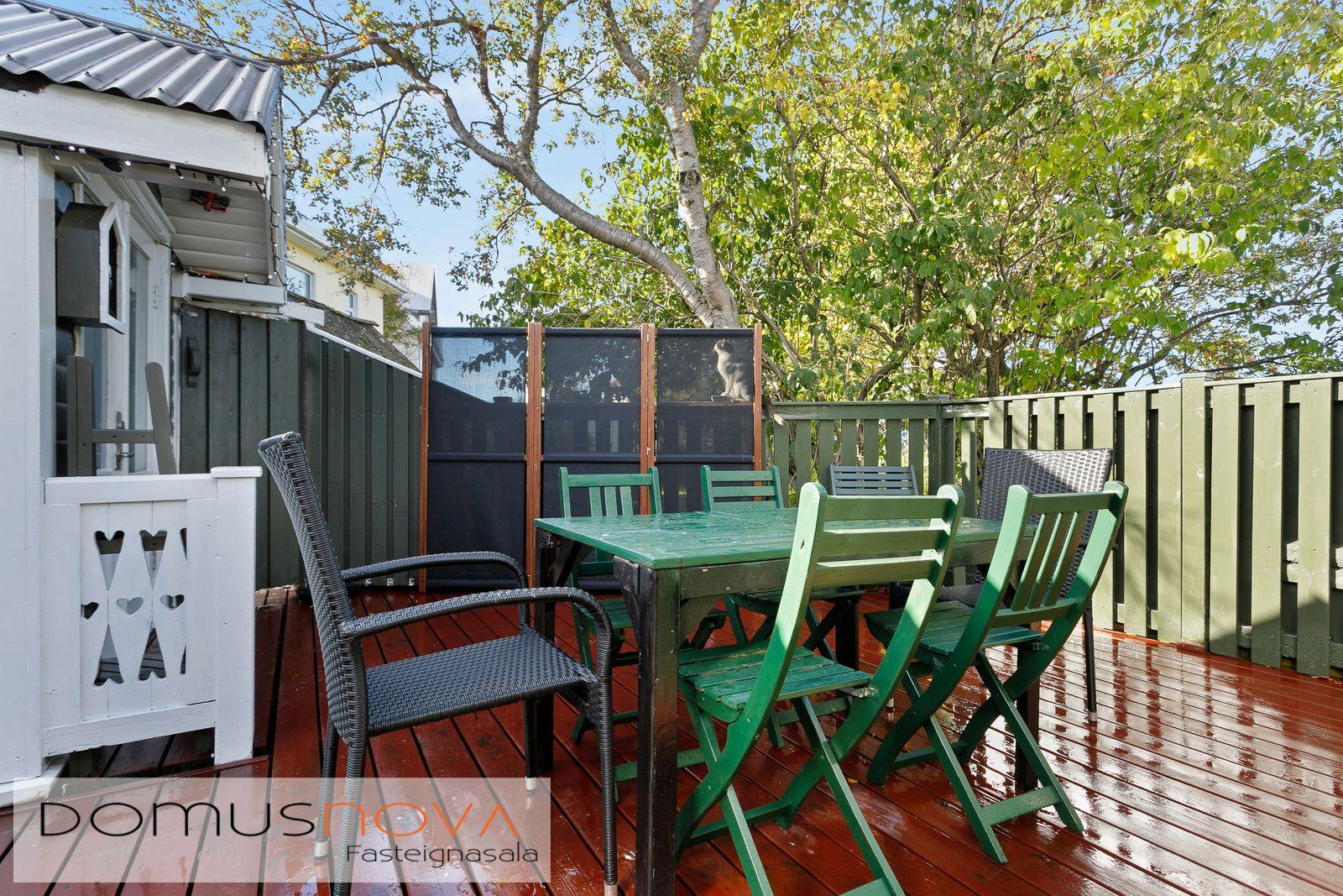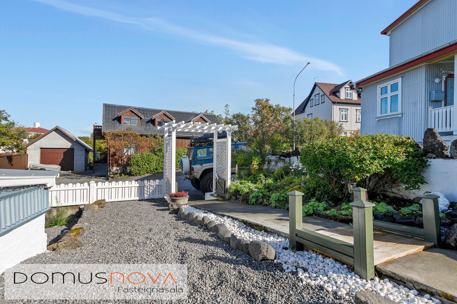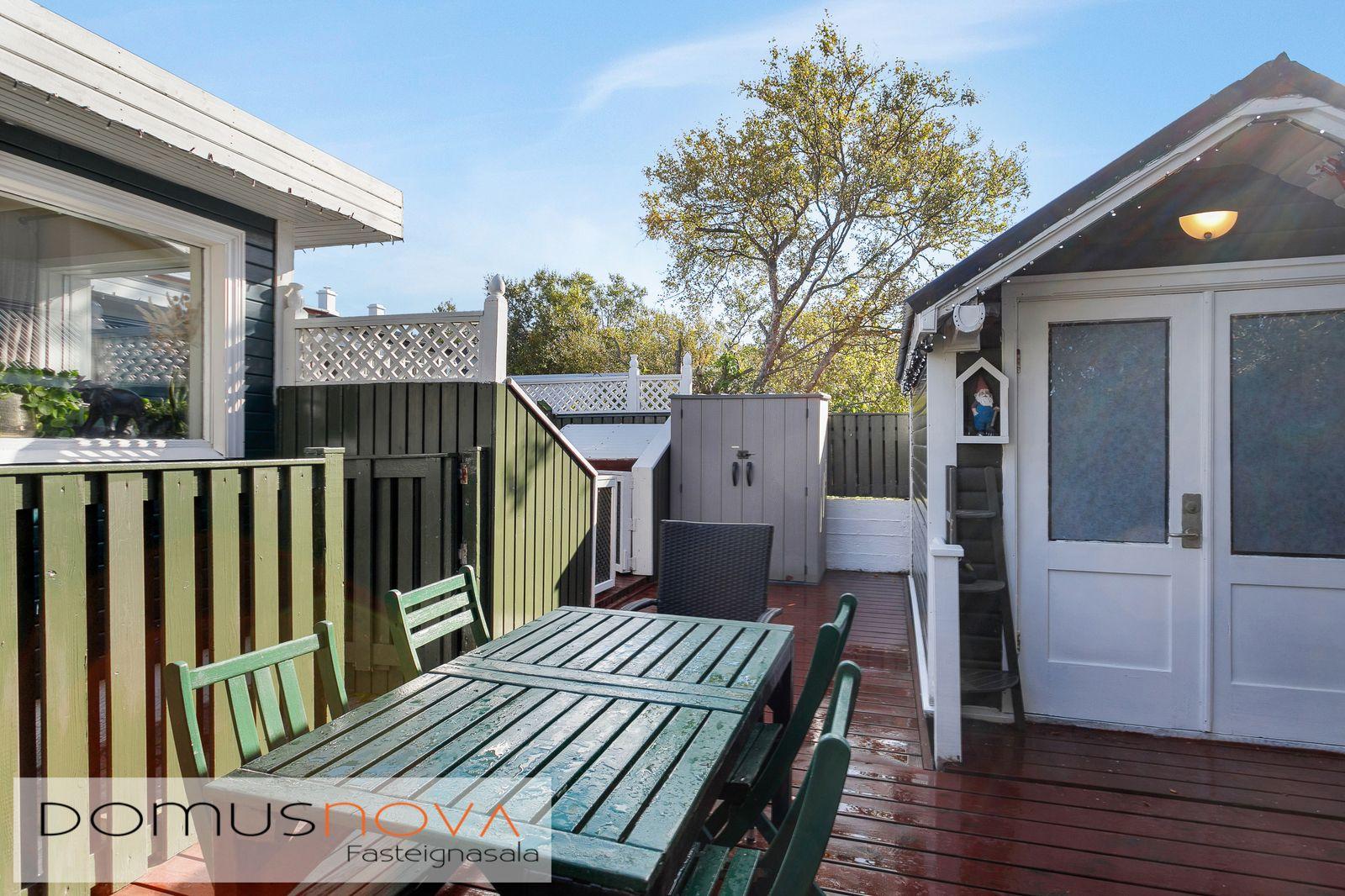 Lóð og pallar: Frá anddyri efri hæðar er farið út í garð þar sem eru góðir sólpallar með skjólveggjum sem afmarka lóð nærliggjandi húsa. Góður geymsluskúr c.a 7 fm er á lóð í suður einngi eru minni geymsluskúrar fyrri grill og annan búnað. Hægt er að fara af palli efri hæðar niður tröppur að eintsklingsíbúð neðri hæðar, einnig er aðgengi að henni frá lóð að framan þar sem er innkeyrsla við hlið geymsluskúrs.