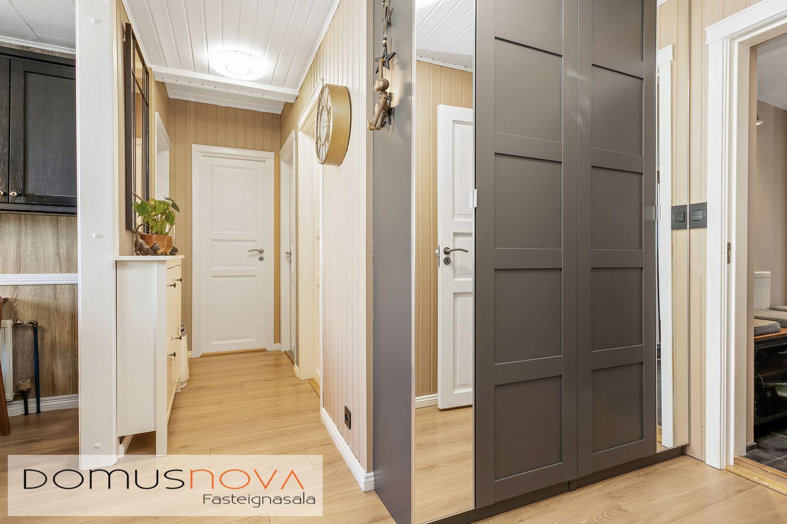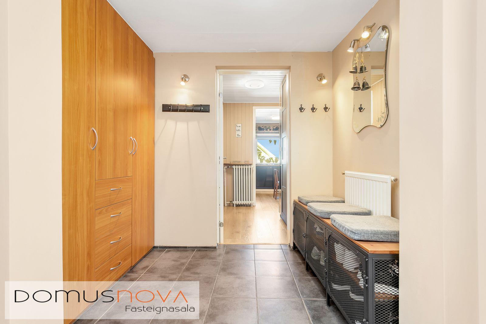 Anddyri/hol – Fataskápar með ágætis plássi og flísar á gólfi. Gott rými fyrir bekk og skóskáp í forstofu. Einnig eru fataskápar frá Ikea í holi inn af anddyri.