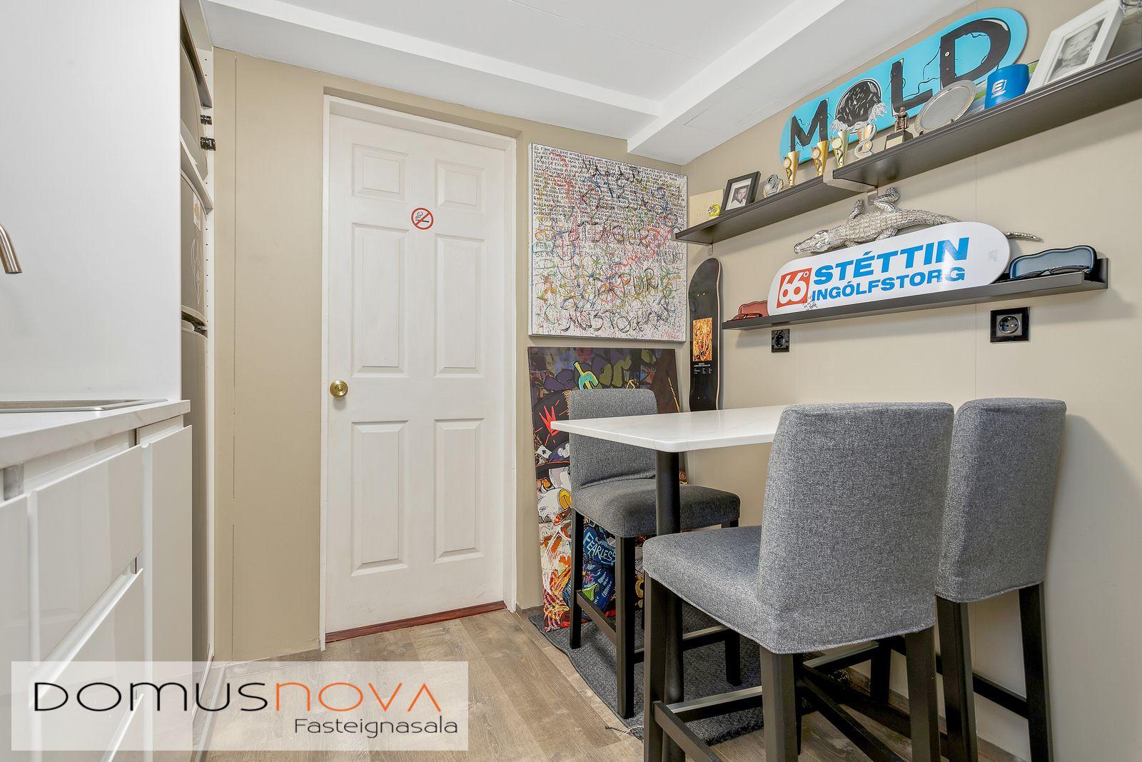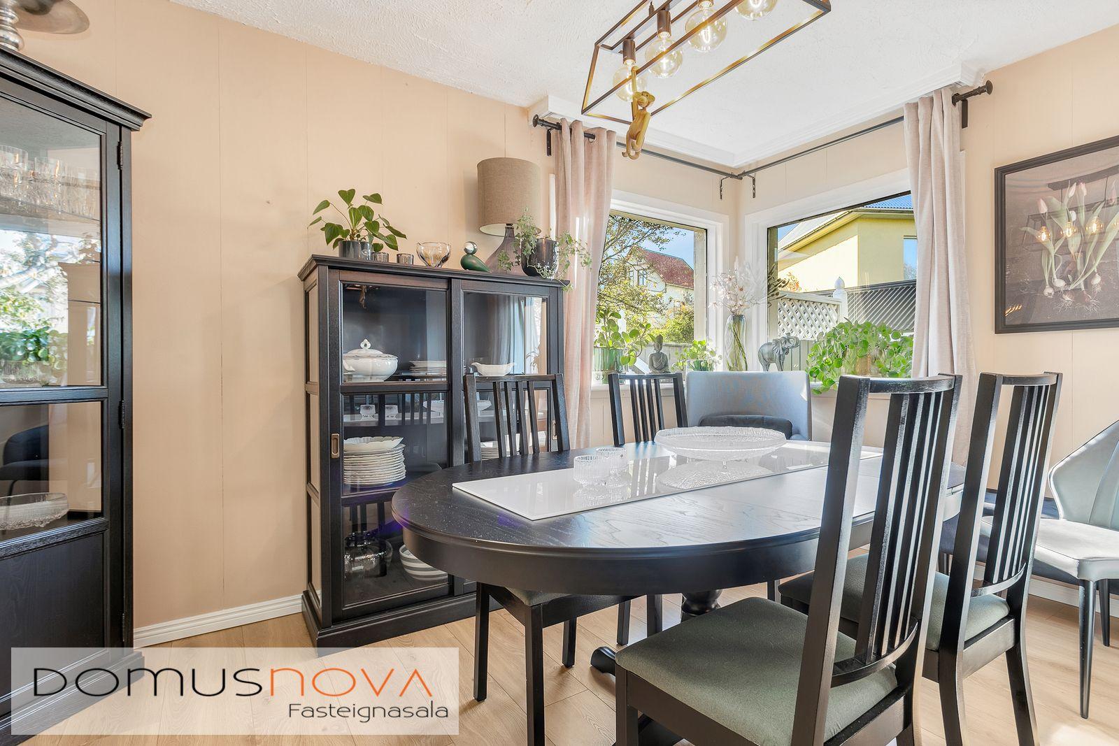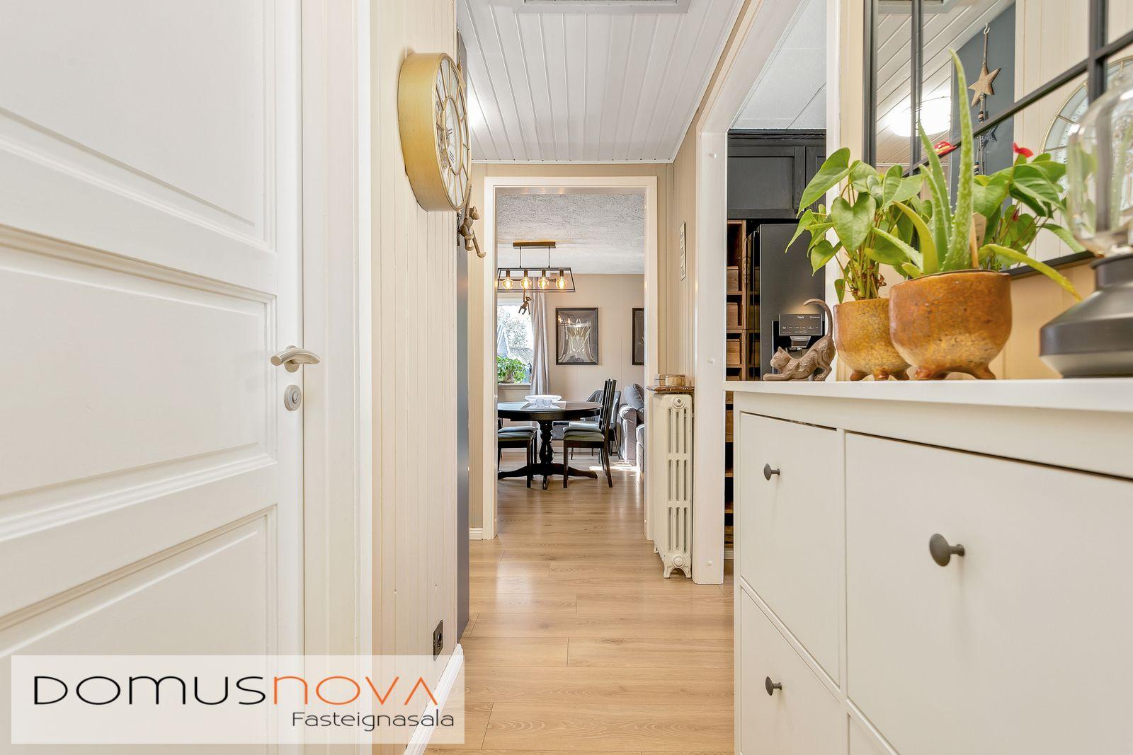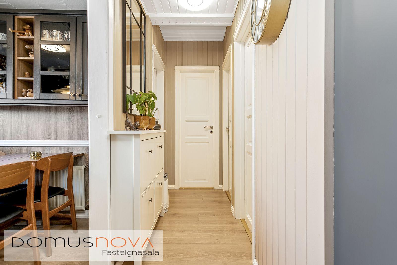 Innréttingar og gólfefni: Innihurðar eru hvítar með fulningum og fallegum breiðum gereftum. Hljóðþiljur á veggjum í stofu og herbergjum að hluta sem gefa rýmunum hlýleika og góða hljóðdempun. Vönduð og vegleg eldhúsinnrétting frá Ikea. Harðparket á flestum rýmum að undanskildum votrýmum og anddyri þar sem eru flísar.