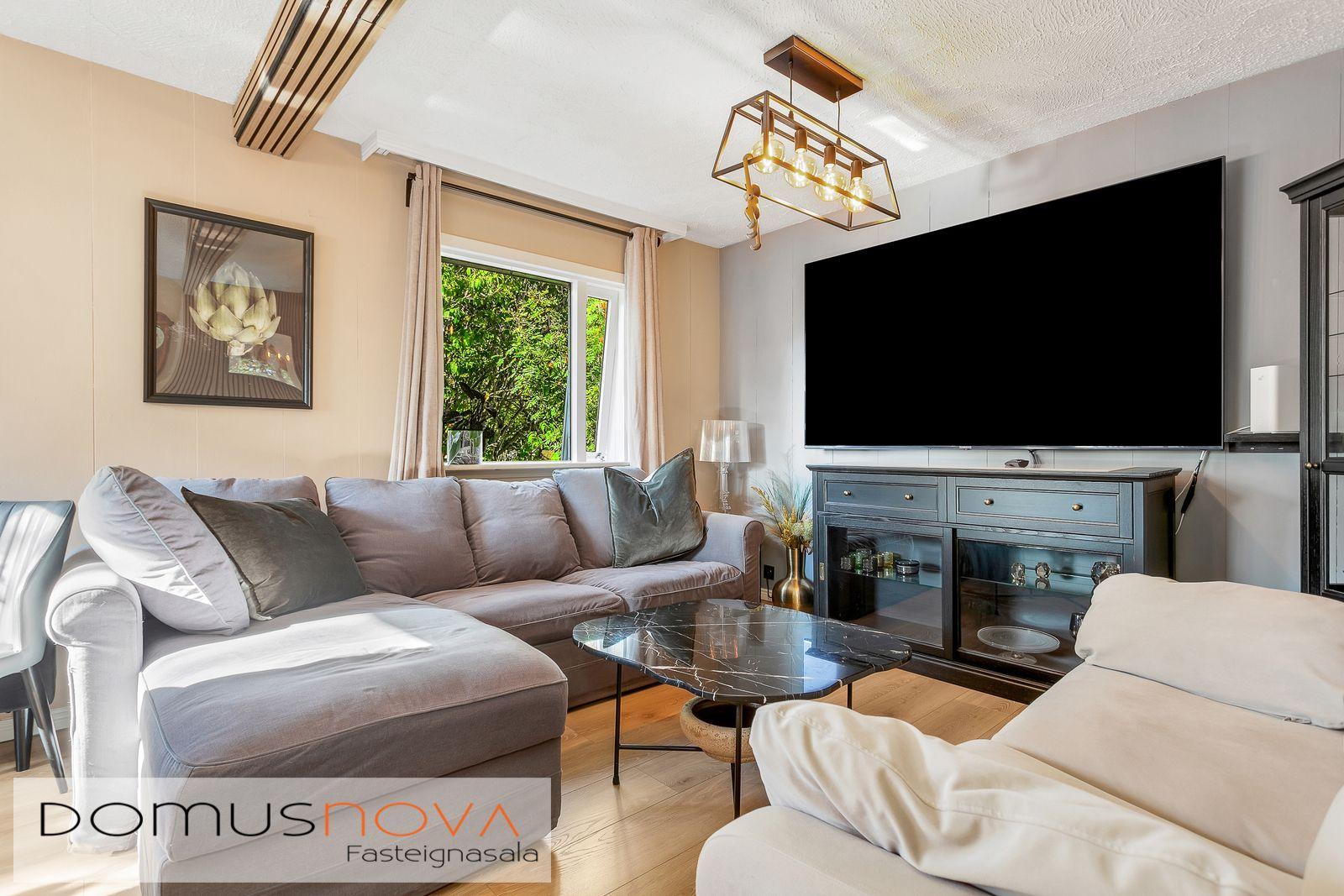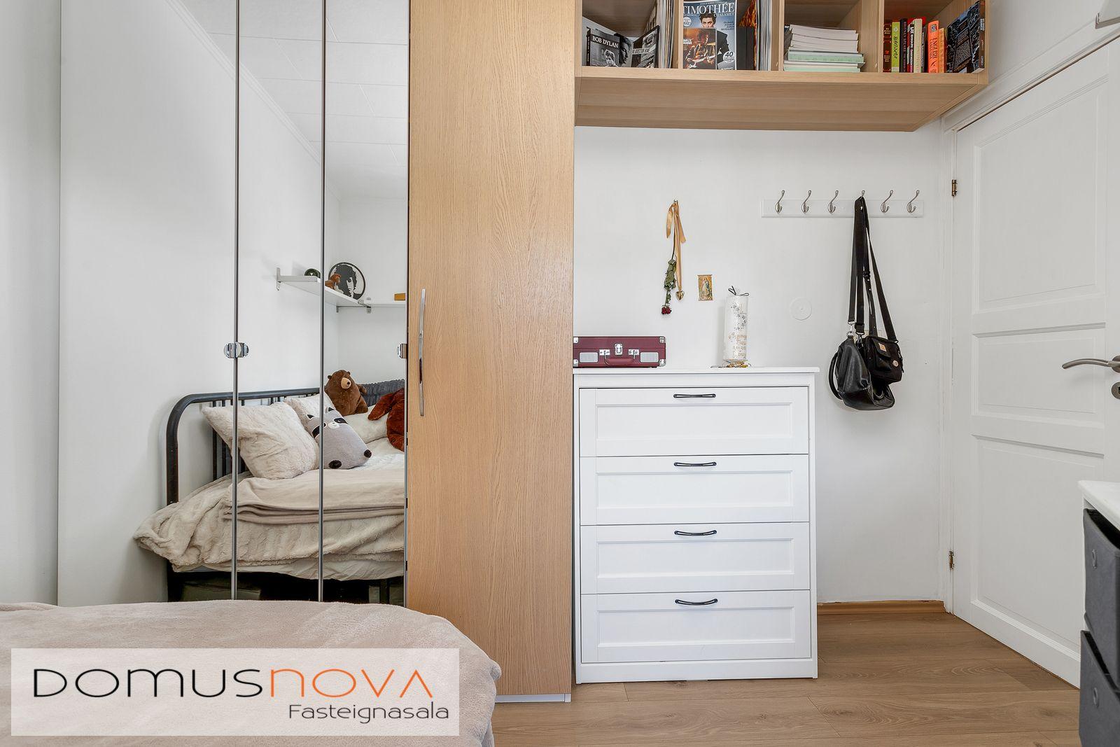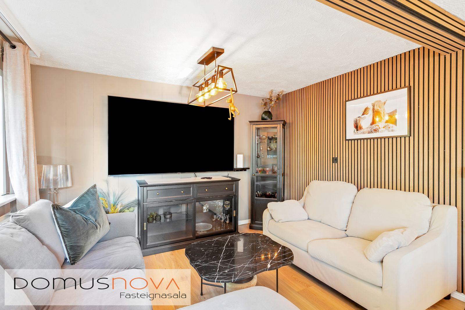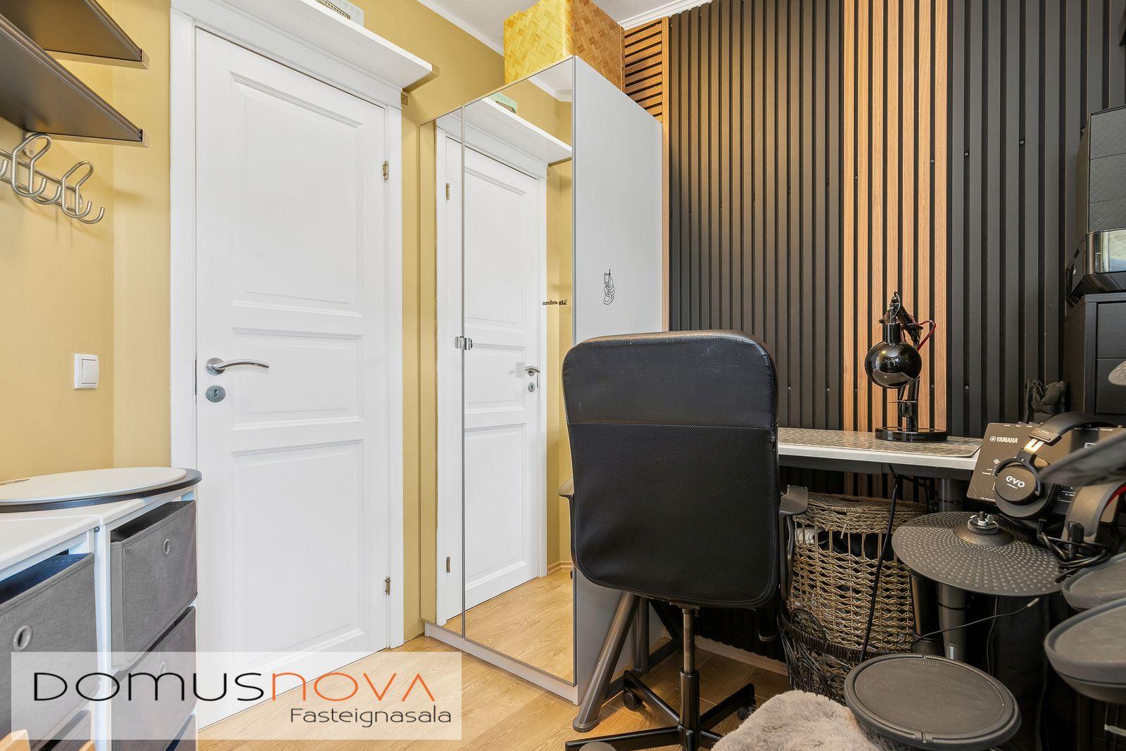 Innréttingar og gólfefni: Innihurðar eru hvítar með fulningum og fallegum breiðum gereftum. Hljóðþiljur á veggjum í stofu og herbergjum að hluta sem gefa rýmunum hlýleika og góða hljóðdempun. Vönduð og vegleg eldhúsinnrétting frá Ikea. Harðparket á flestum rýmum að undanskildum votrýmum og anddyri þar sem eru flísar.