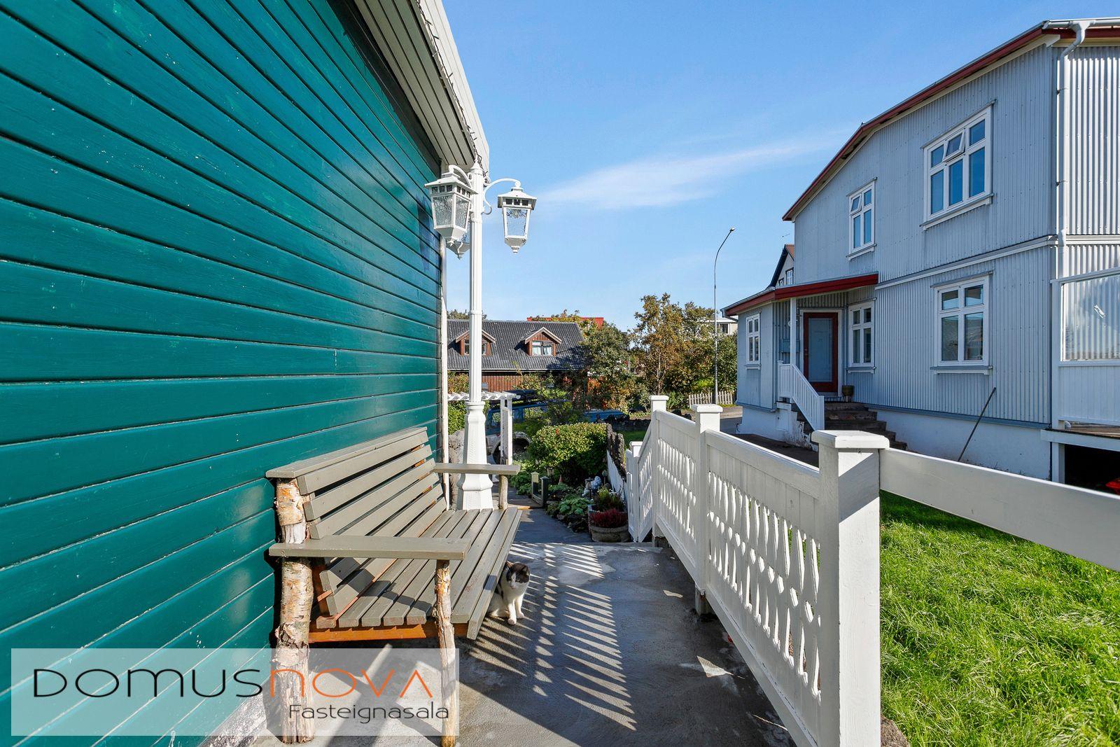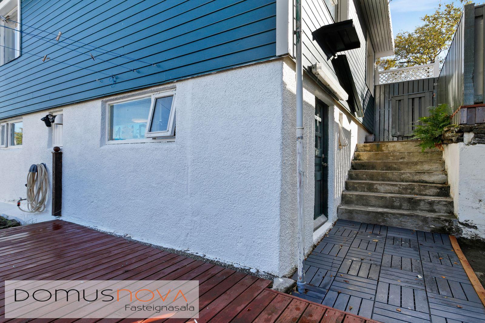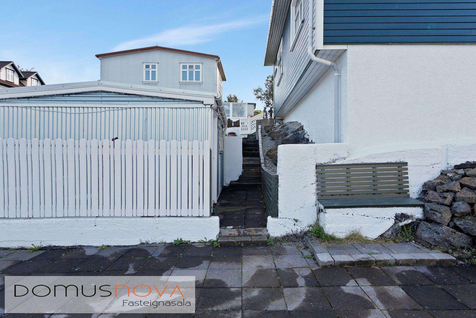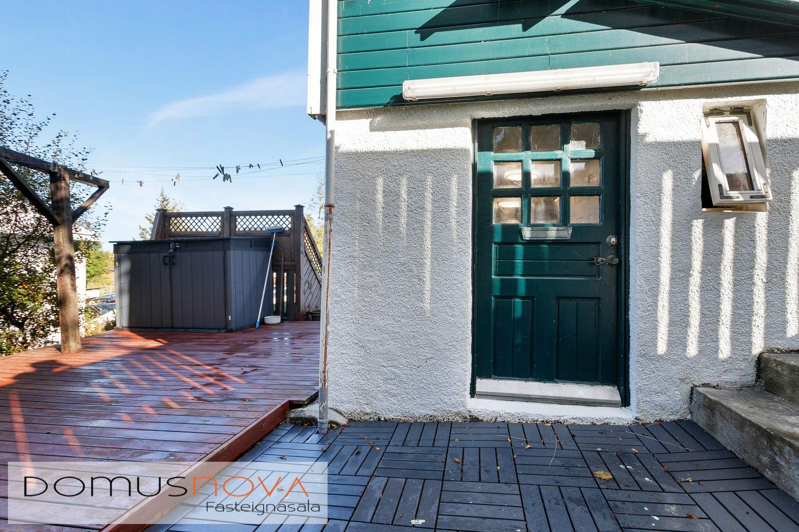 Aðkoma að húsi er um fallegt hlið að efri hæð þar sem er fremra anddyri, óskráð forstofa með tveimur hurðum. Gengið er úr forstofu út á snyrtilega verönd í suður þar sem er sólpallur með góðum geymsluskúrum. Skjólgirðingar eru kringum sólpallinn sem afmarka lóð að lóðum nærliggjandi húsa.