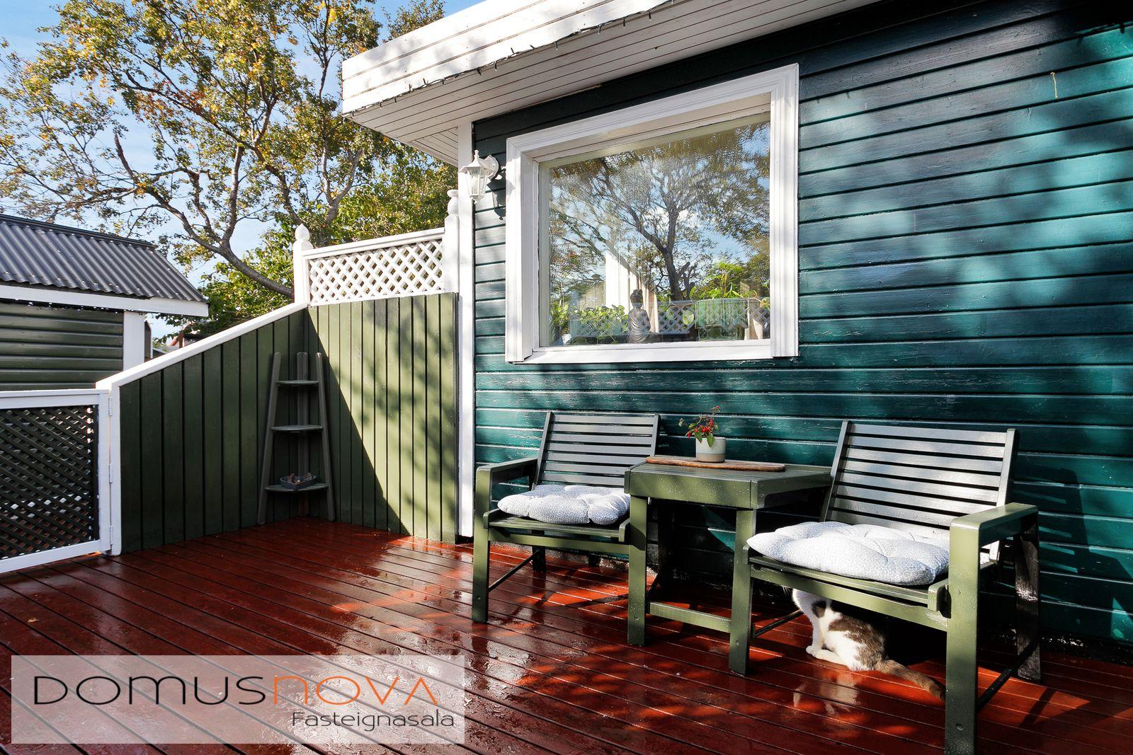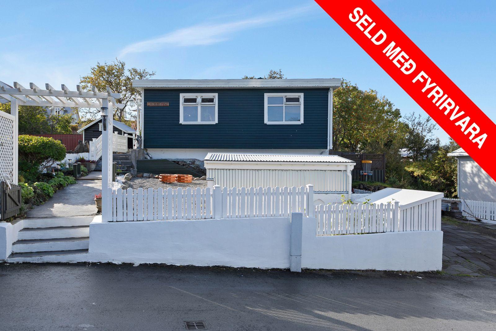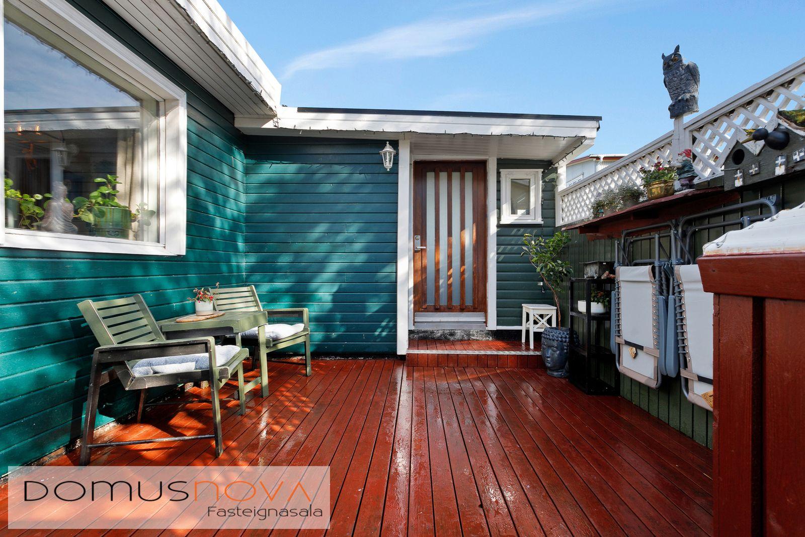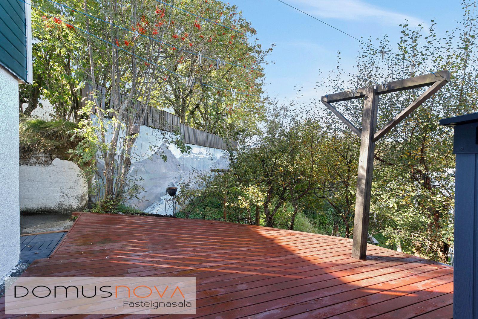 Aðkoma að húsi er um fallegt hlið að efri hæð þar sem er fremra anddyri, óskráð forstofa með tveimur hurðum. Gengið er úr forstofu út á snyrtilega verönd í suður þar sem er sólpallur með góðum geymsluskúrum. Skjólgirðingar eru kringum sólpallinn sem afmarka lóð að lóðum nærliggjandi húsa.
