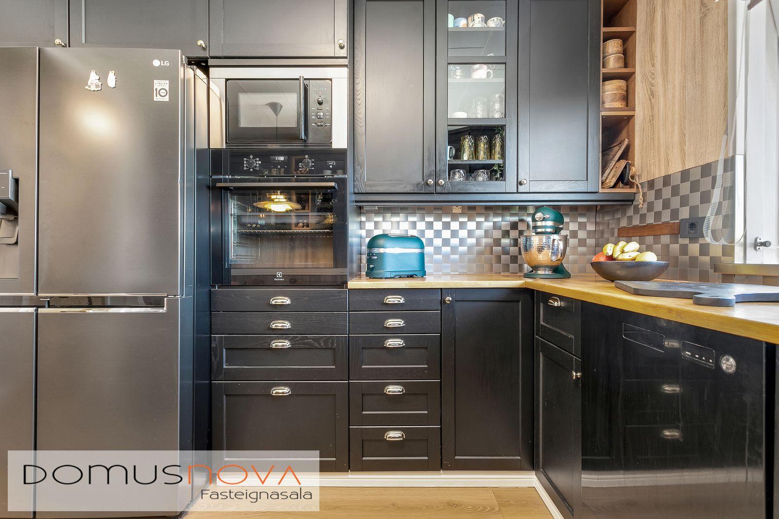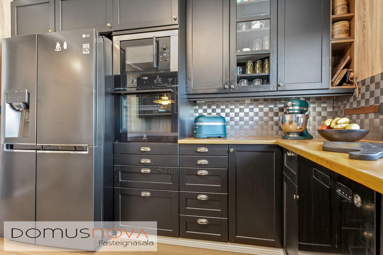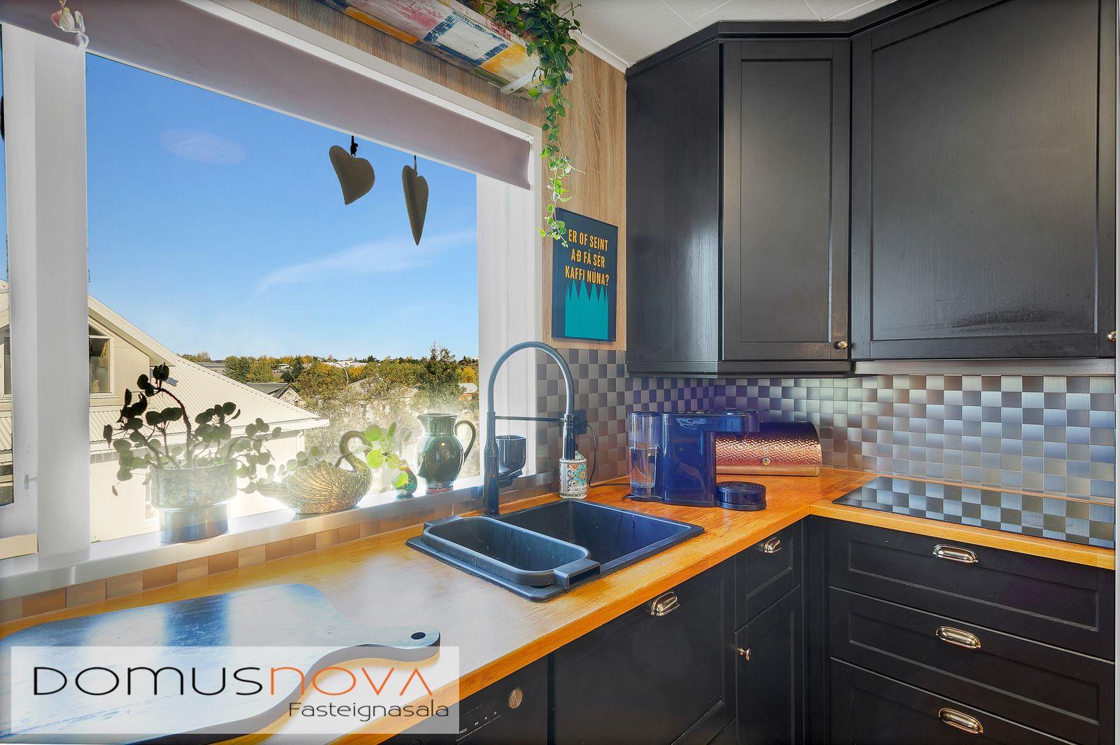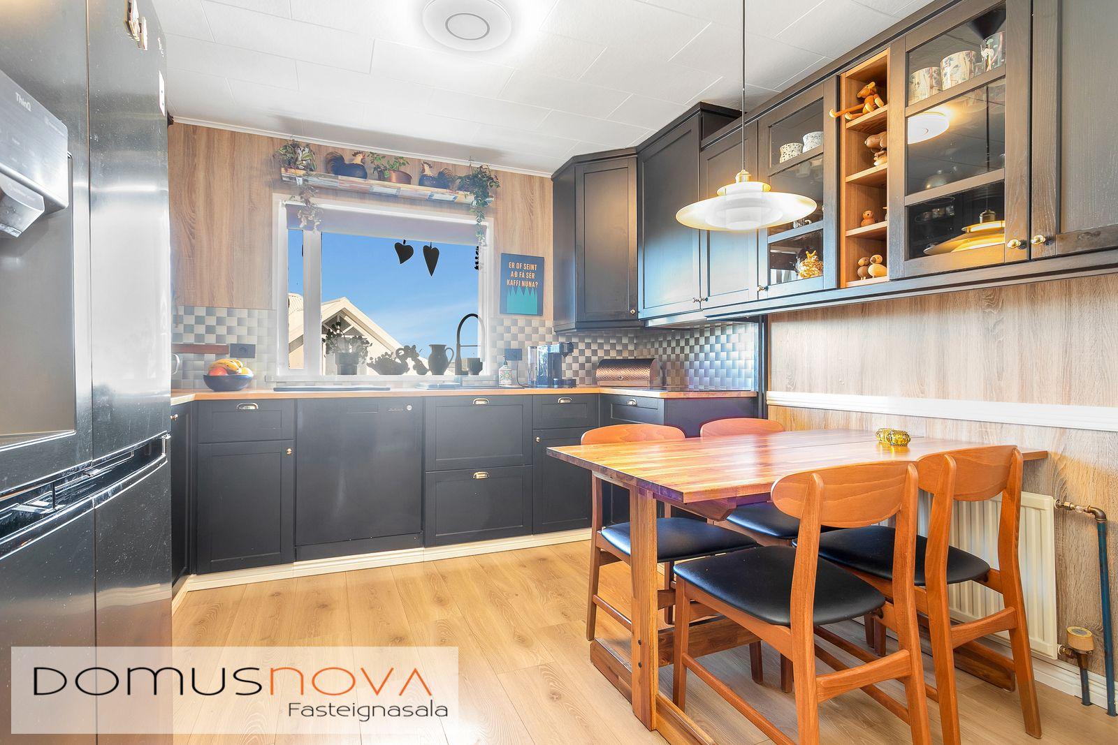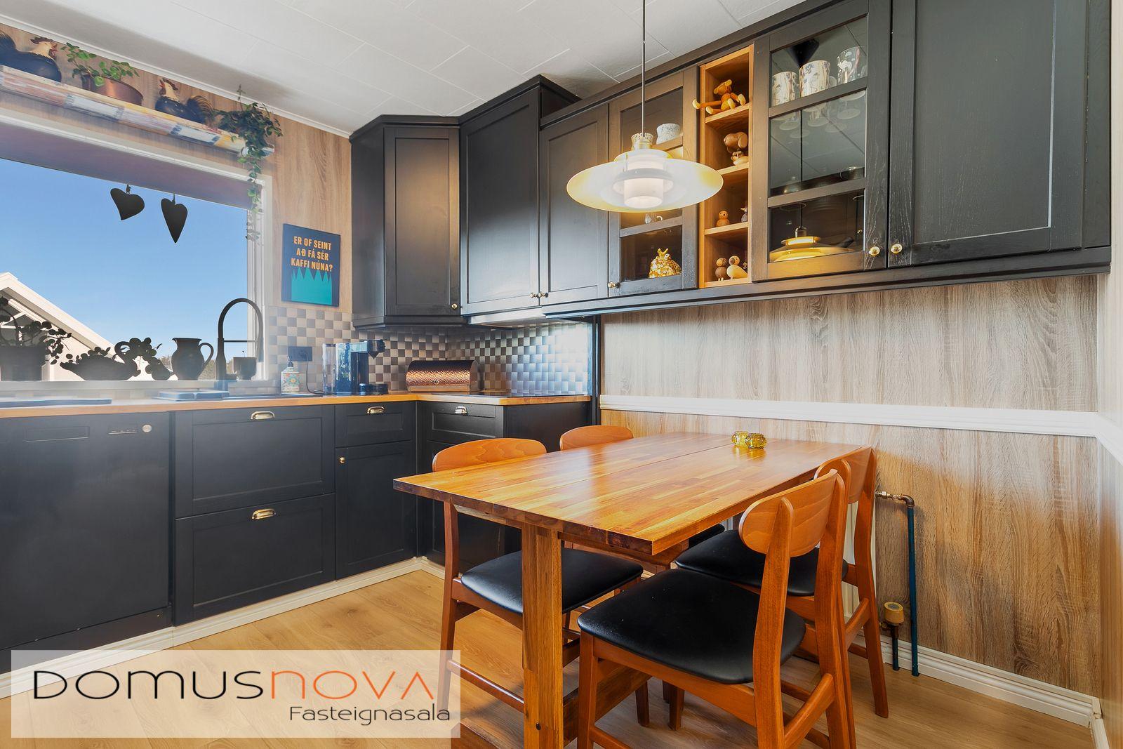 Eldhús – Við hlið stofu beint inn af anddyri með nýlegri Ikea eldhúsinnréttingu frá 2023. Innréttingin er úr dökkum við með límtrésborðplötum. Gott vinnu- og skáparými í eldhúsi. Flísaþiljur á vegg á milli efri og neðri skápa, amerískur ísskápur sem fylgir eigninni ásamt bakar- og örbylgjuofni. Innbyggð uppþvottavél í innréttingu sem fylgir. Borðkrókur í eldhúsi og harðparket á gólfi. Gott útsýni er úr eldhúsglugga í vestur.