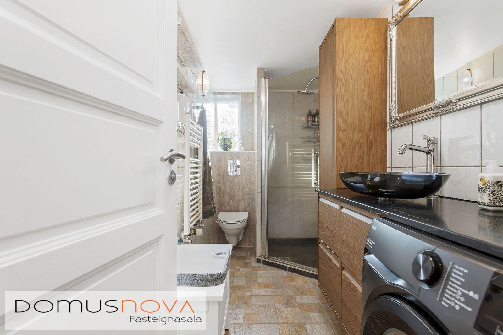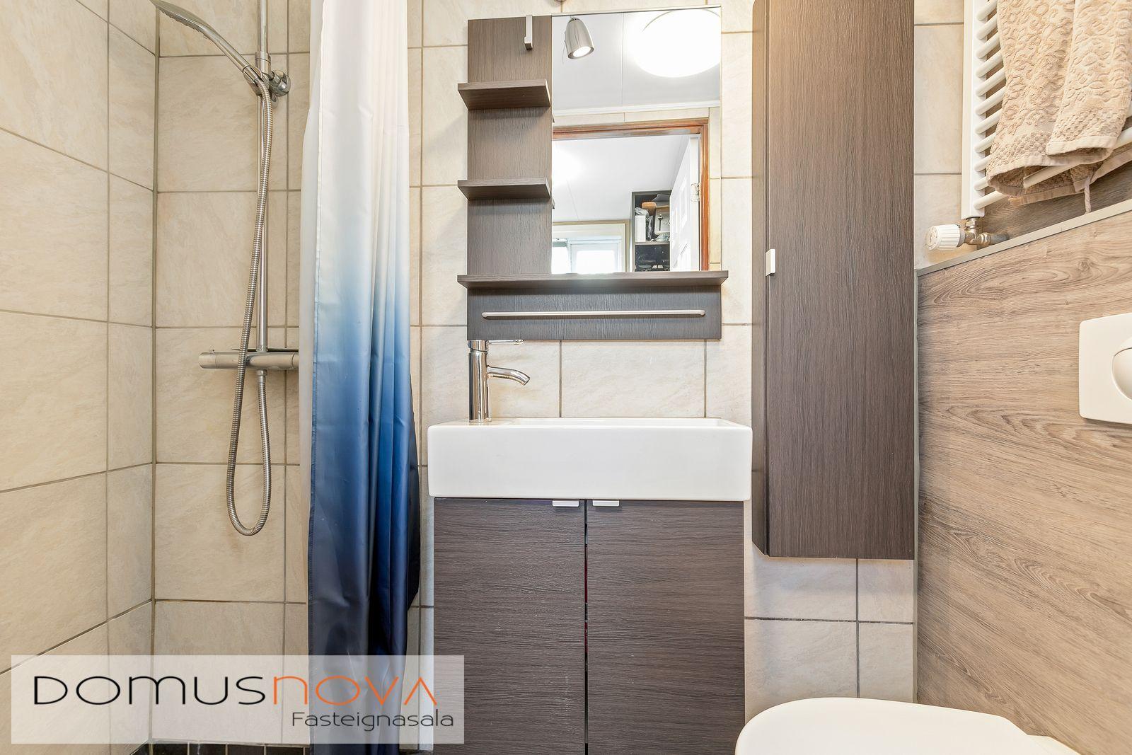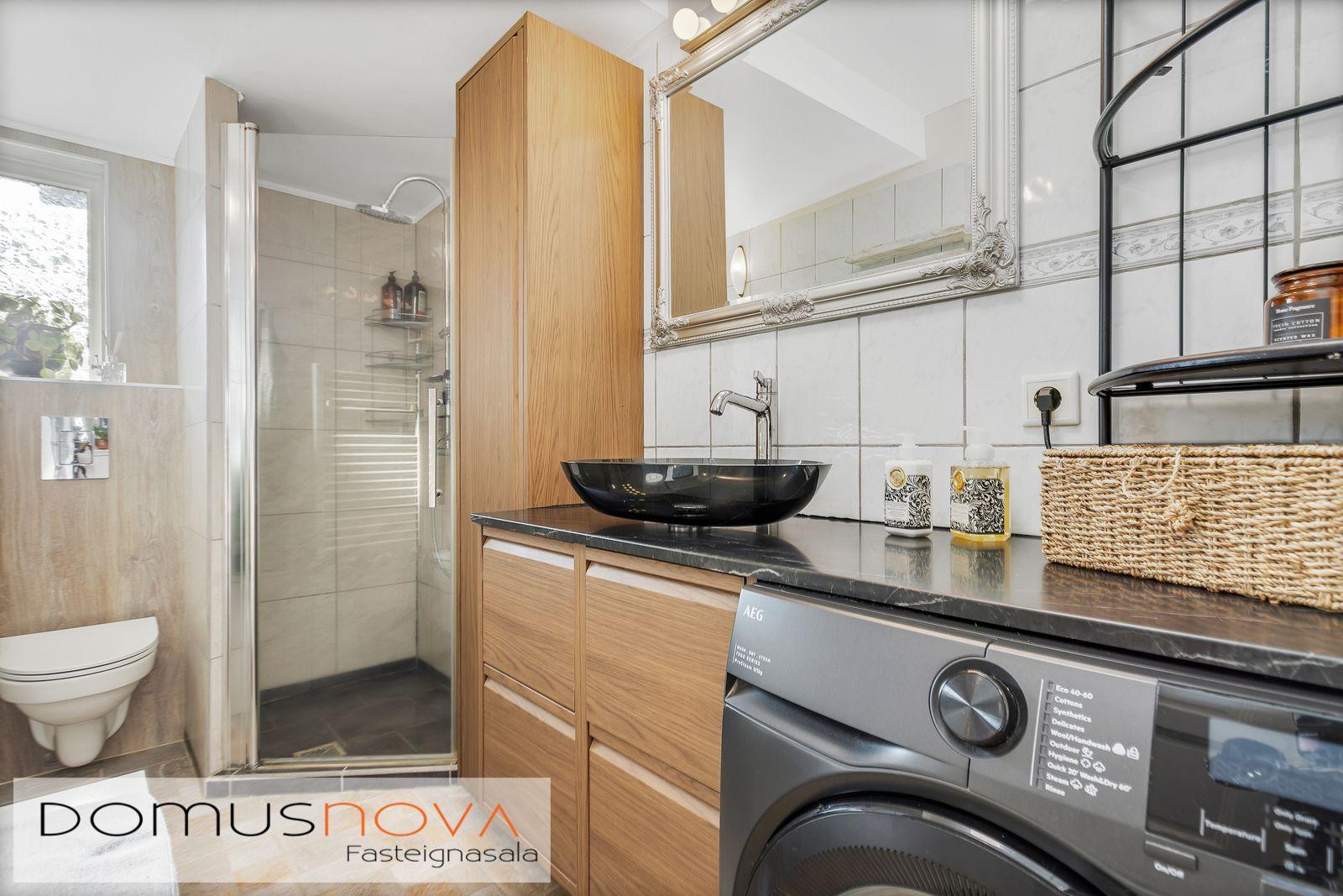 Baðherbergi – Flísar á veggjum og gólfi, upphengt innfellt salerni á vegg, flísalagður sturtuklefi, ágætlega stór baðinnrétting, handklæðaskápur og rými fyrir þvottavél undir borðplötu. Handklæðaofn á vegg og opnanlegur gluggi á baðherbergi.