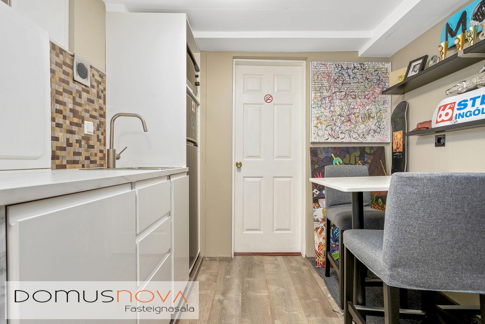Neðri hæð skiptist í: Einstaklingsíbúð 23,5 m² sem skiptist í lítið anddyri, eldhúsrými og svefnherbergi inn af eldhúsrými.