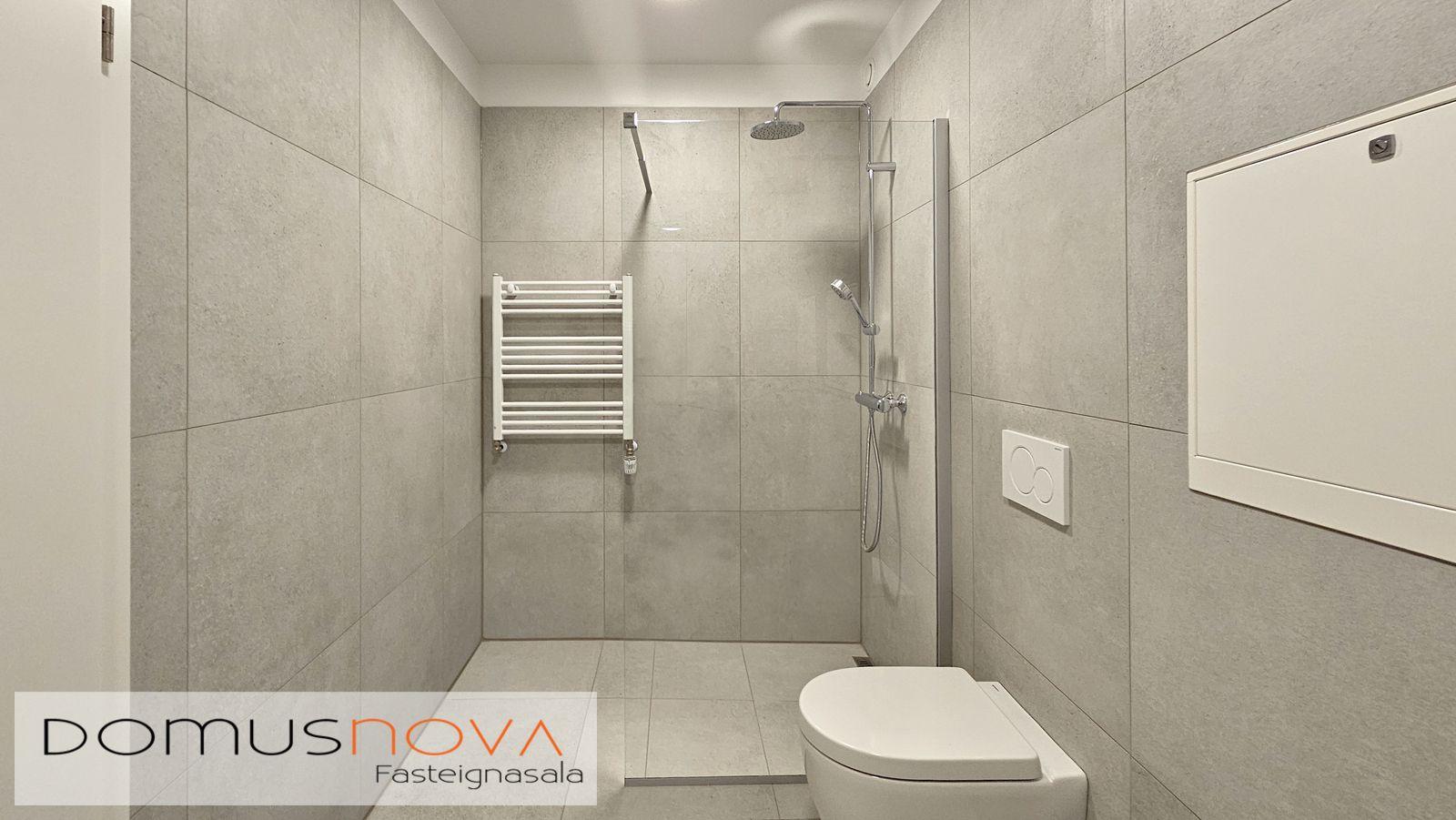 Baðherbergi: Hvít innrétting með brúnni borðplötu og hvítri handlaug. Speglaskápur yfir handlaug. Upphengt salerni með hæglokandi setu, WALK IN sturta og handklæðaofn. Hitastýrð blöndunartækin frá Tengi. Aðstaða fyrir þvottavél og þurrkara. Veggflísar og gegnheilar flísar á gólfi.