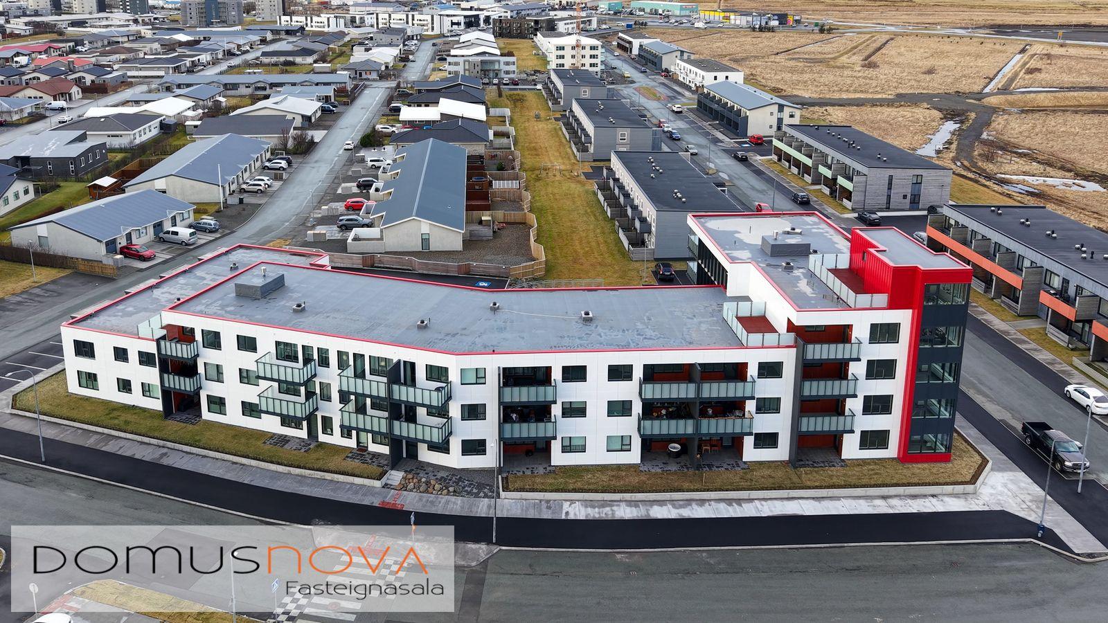 Lóð/bílastæði: Lóðin er 3325,0 fm. Innan lóðar eru 32 bílastæði, þar af eru 14 sérmerkt f. rafmagnsbíla og 3 fyrir hreyfihamlaða. Lóðin verður afhent fullbúin í lok byggingartímans. Bílastæði við götu eru malbikuð. Tengibúnaður (ídráttarrör) vegna hleðslu rafbíla er aðgengilegt við bílastæði. Milli húss og bílastæða við götu eru hellulagðar stéttar.