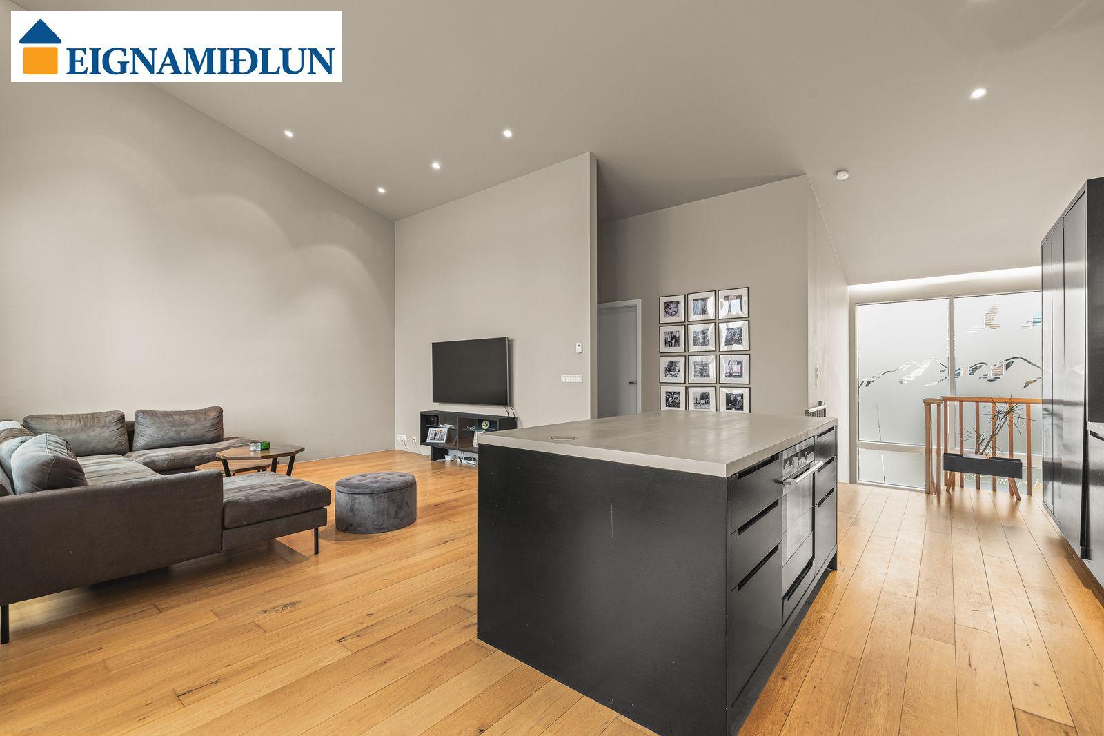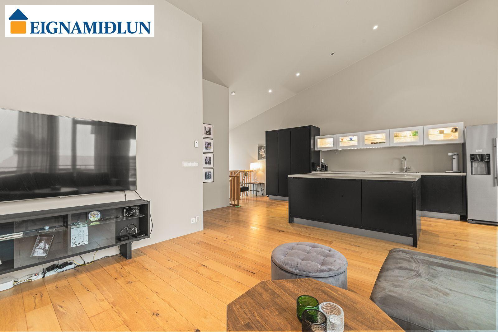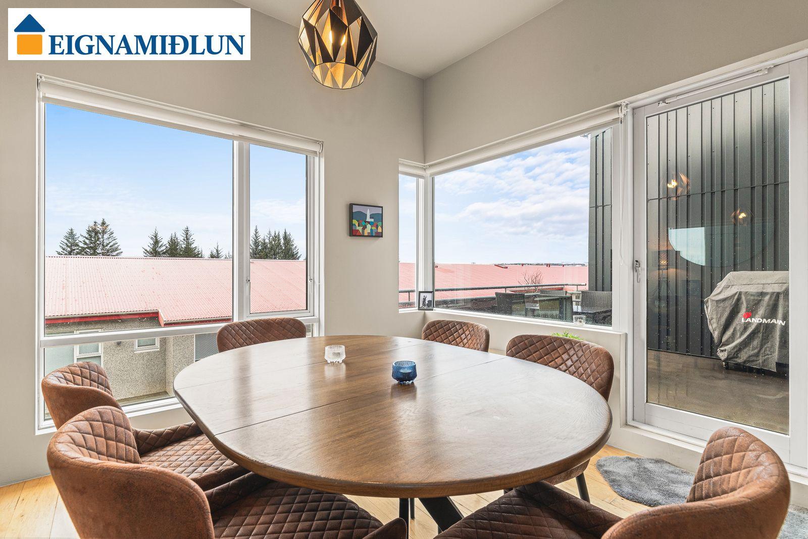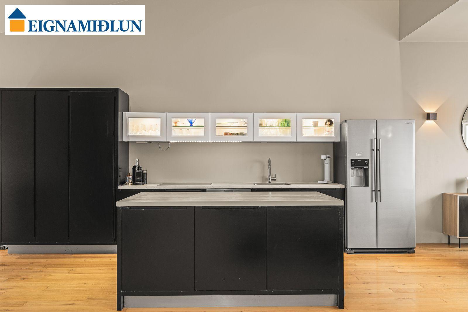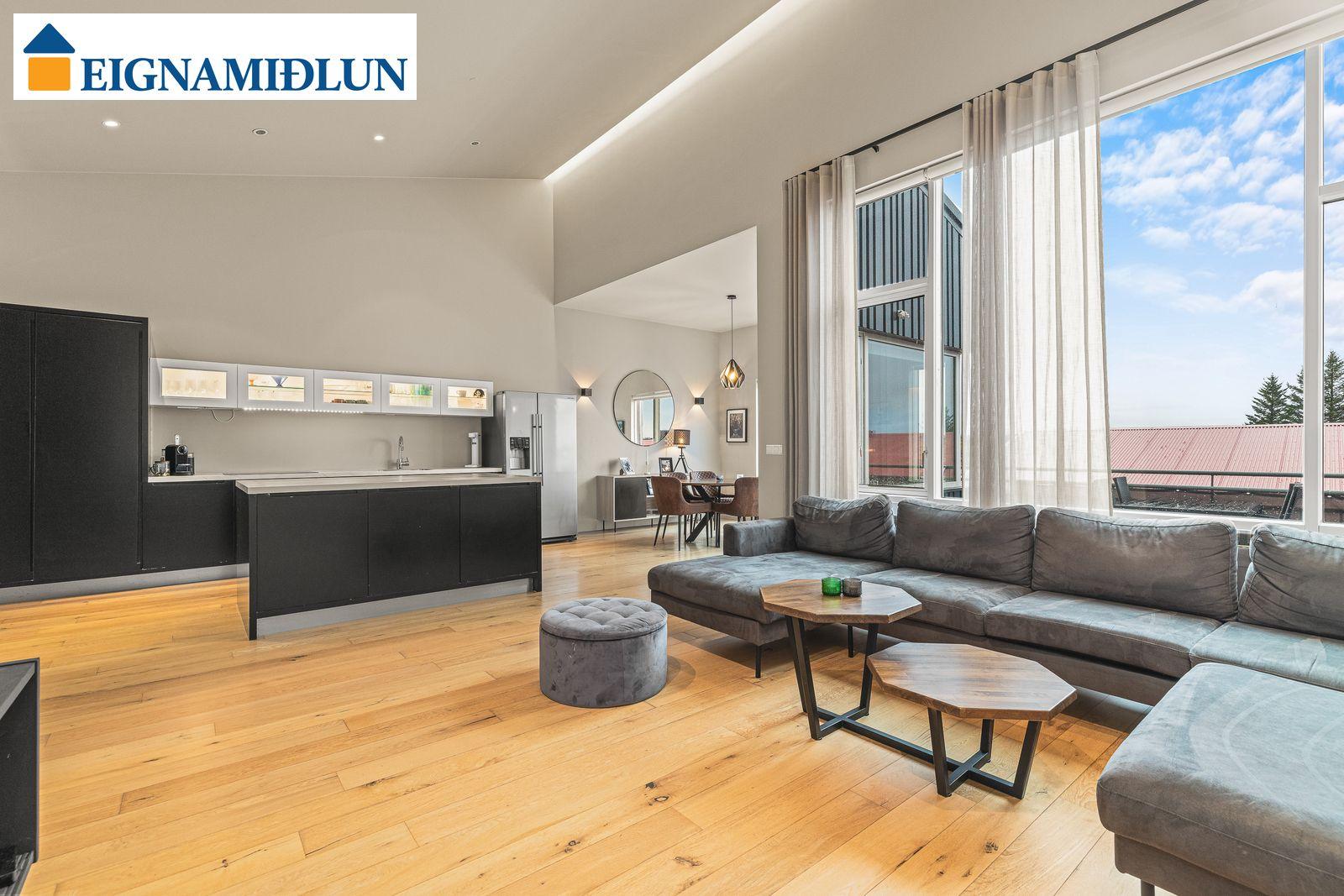 ALRÝMI: ELDHÚS: Opið eldhús með sprautulakkaðri innréttingu, eldaeyja. BORÐSTOFA: Við útsýnisglugga, gengið út á stórar svalir í suðvestur. STOFA: Rúmgóð parketlögð stofa. Hátt er til lofts í alrýminu.