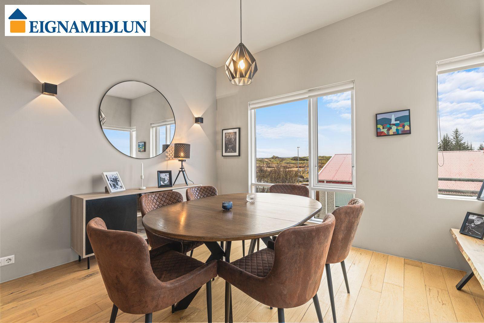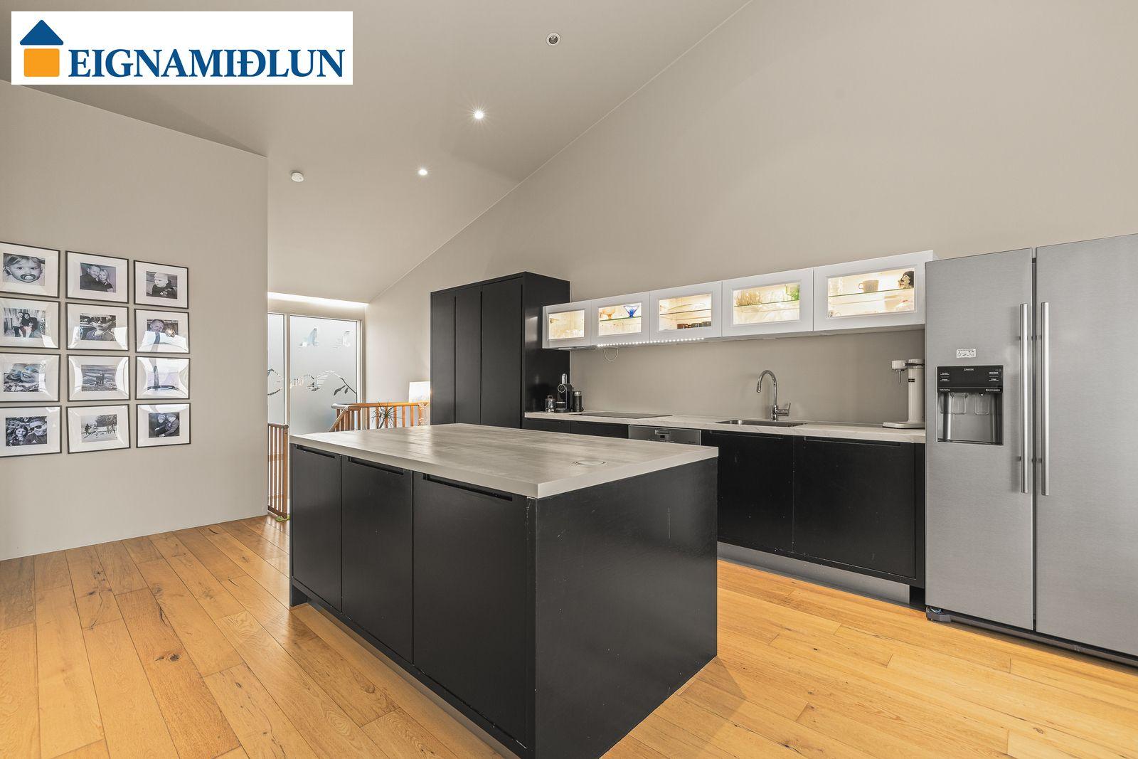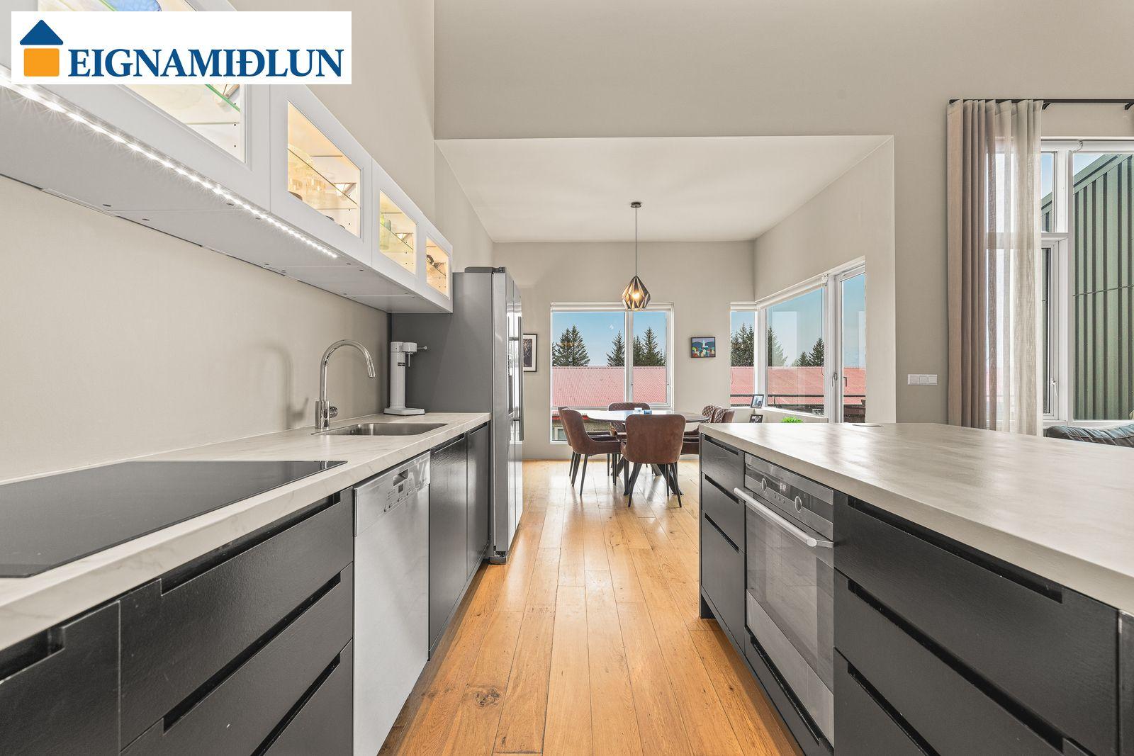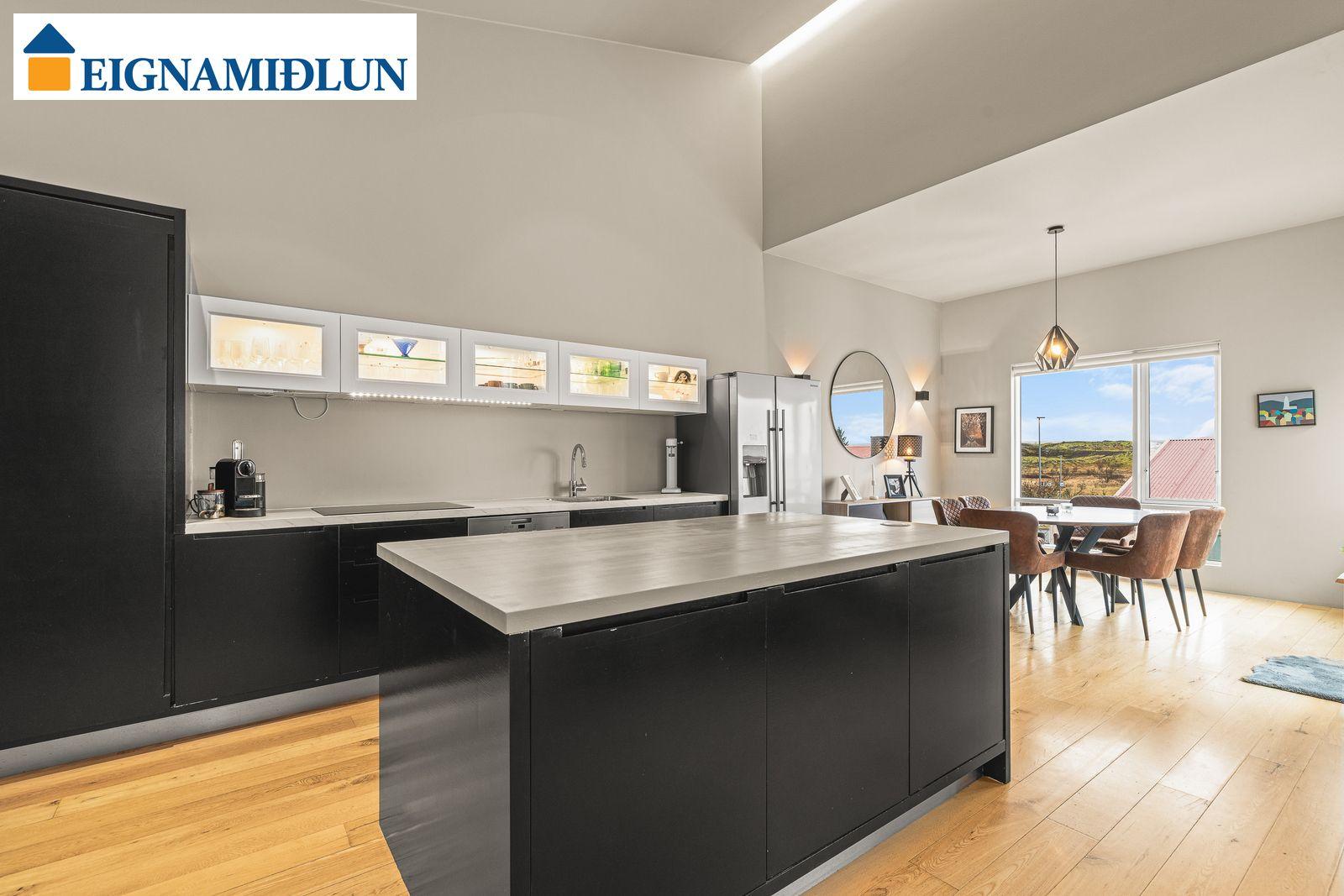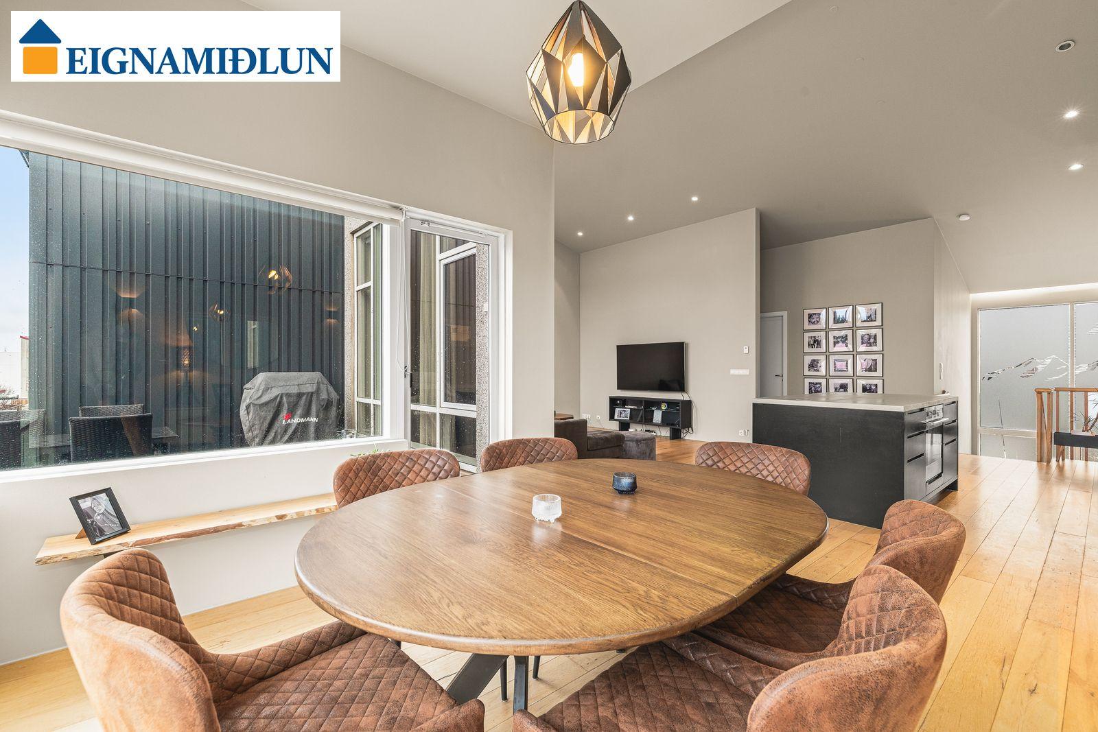 ALRÝMI: ELDHÚS: Opið eldhús með sprautulakkaðri innréttingu, eldaeyja. BORÐSTOFA: Við útsýnisglugga, gengið út á stórar svalir í suðvestur. STOFA: Rúmgóð parketlögð stofa. Hátt er til lofts í alrýminu.